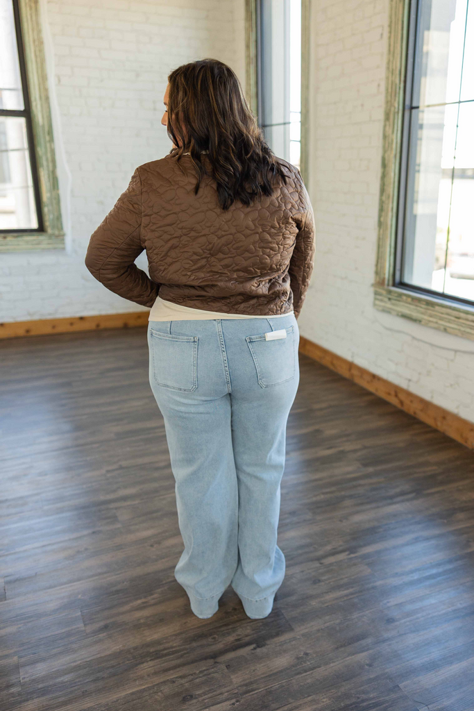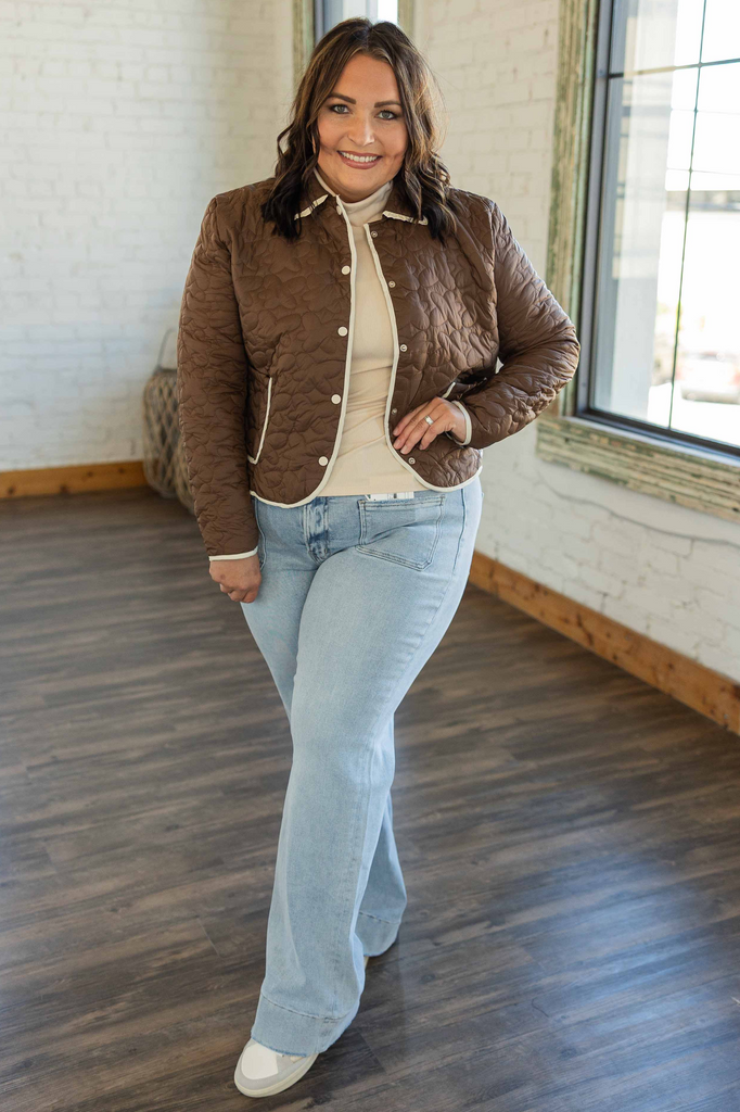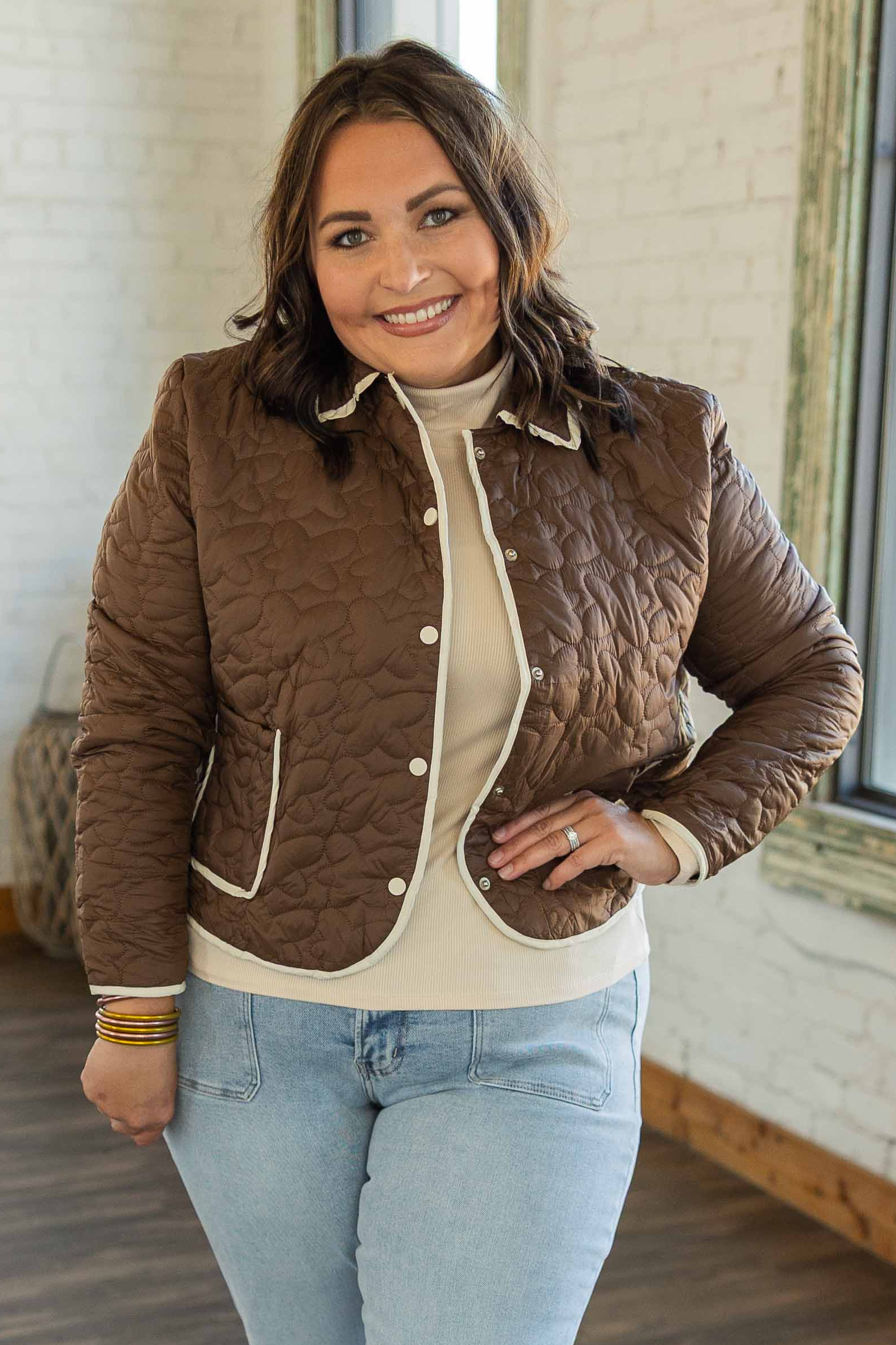 The Angela Plus Jacket gives cozy a polished twist. This lightweight quilted puff jacket features a soft mocha brown color with cream trim, adding the sweetest touch of contrast. The ruffle edge along the collar and pockets makes it feminine without trying too hard.