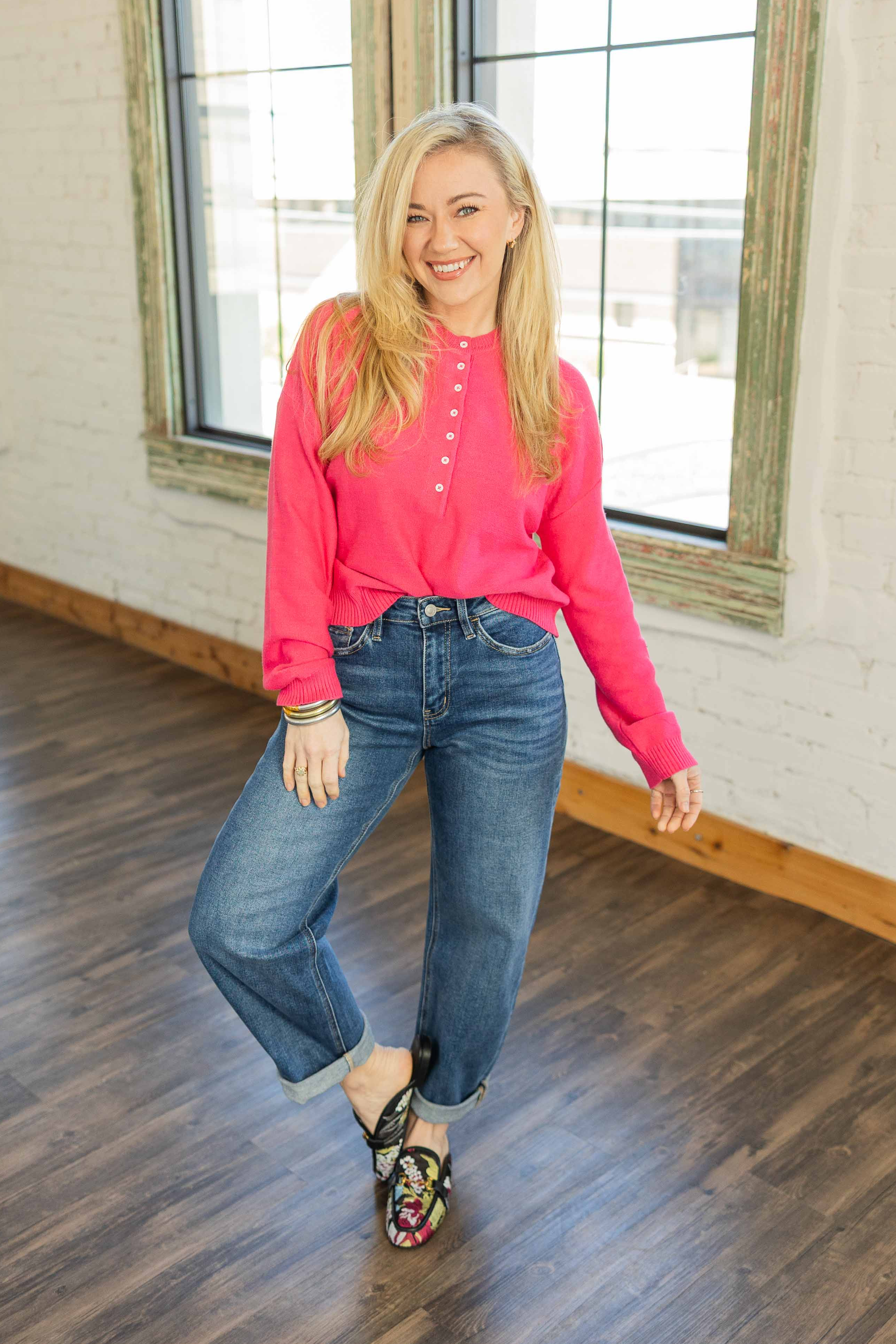 Suggested ALT text. Woman wearing medium dark wash high rise barrel jeans with cuffed hem styled with a bright pink top indoors.