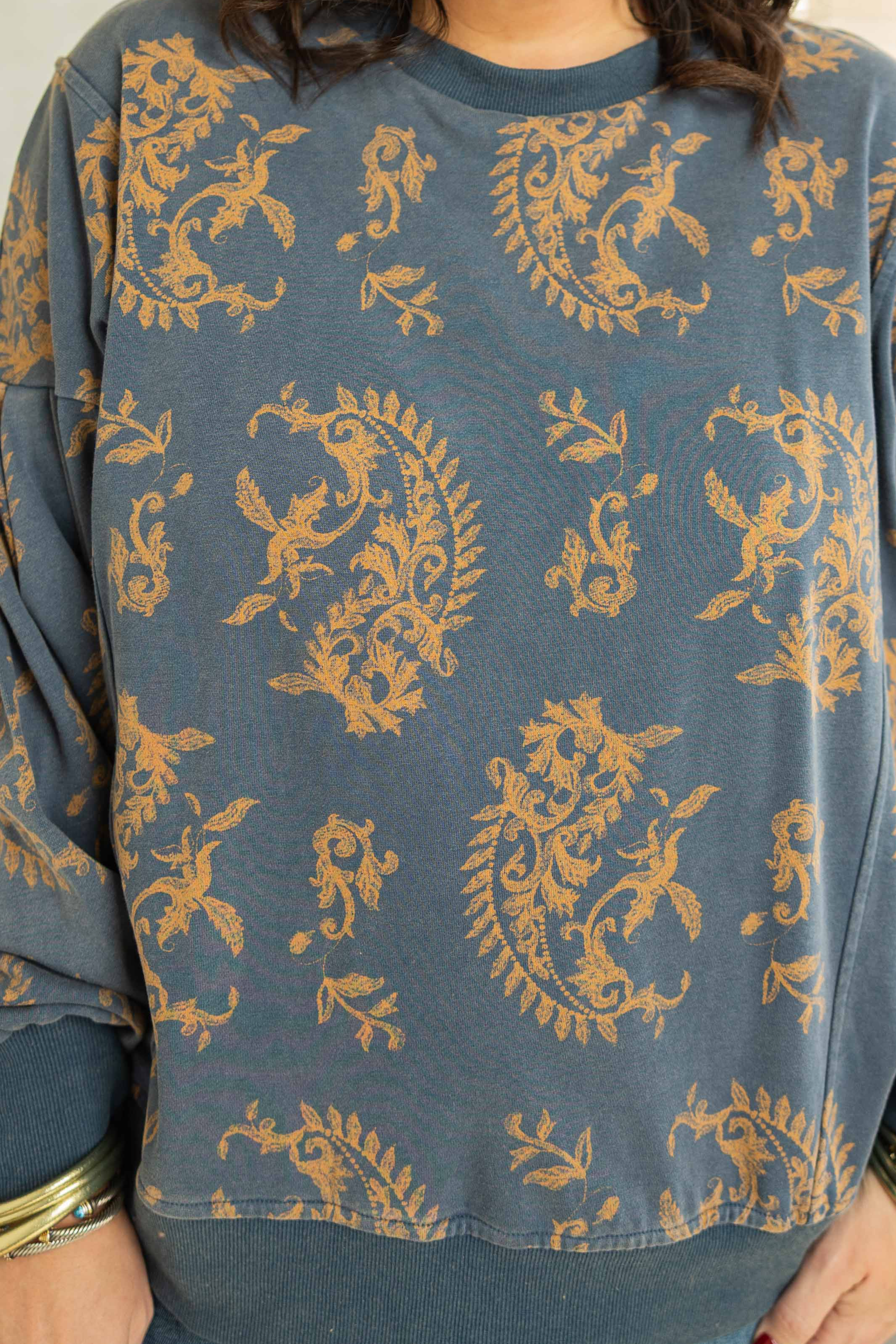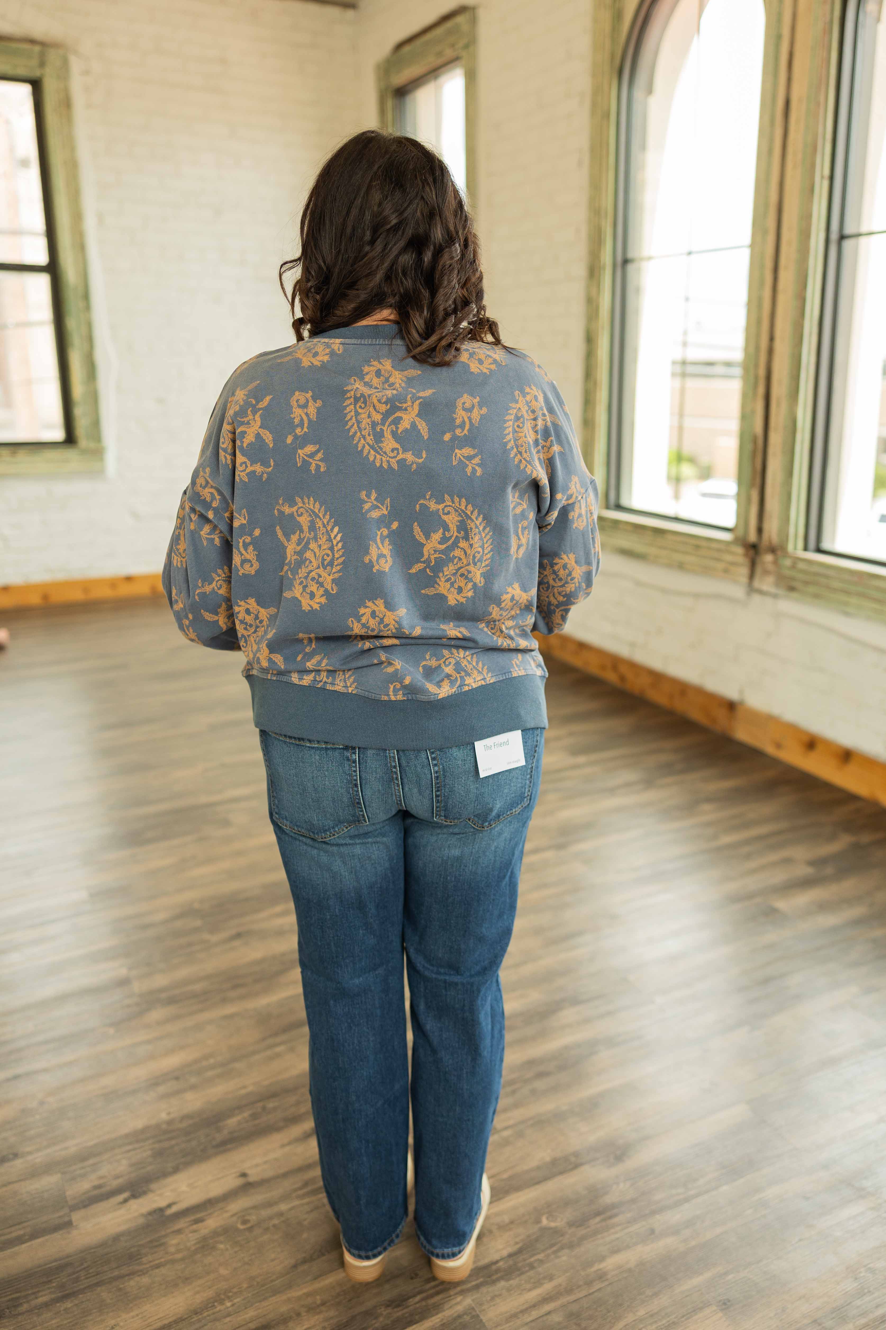 Same favorite feel. Same cool vintage vibe. Made to fit and flatter beautifully. This crewneck is soft, relaxed, and easy in all the right ways. The paisley print adds interest without being loud. It is comfortable enough for everyday but still feels styled.