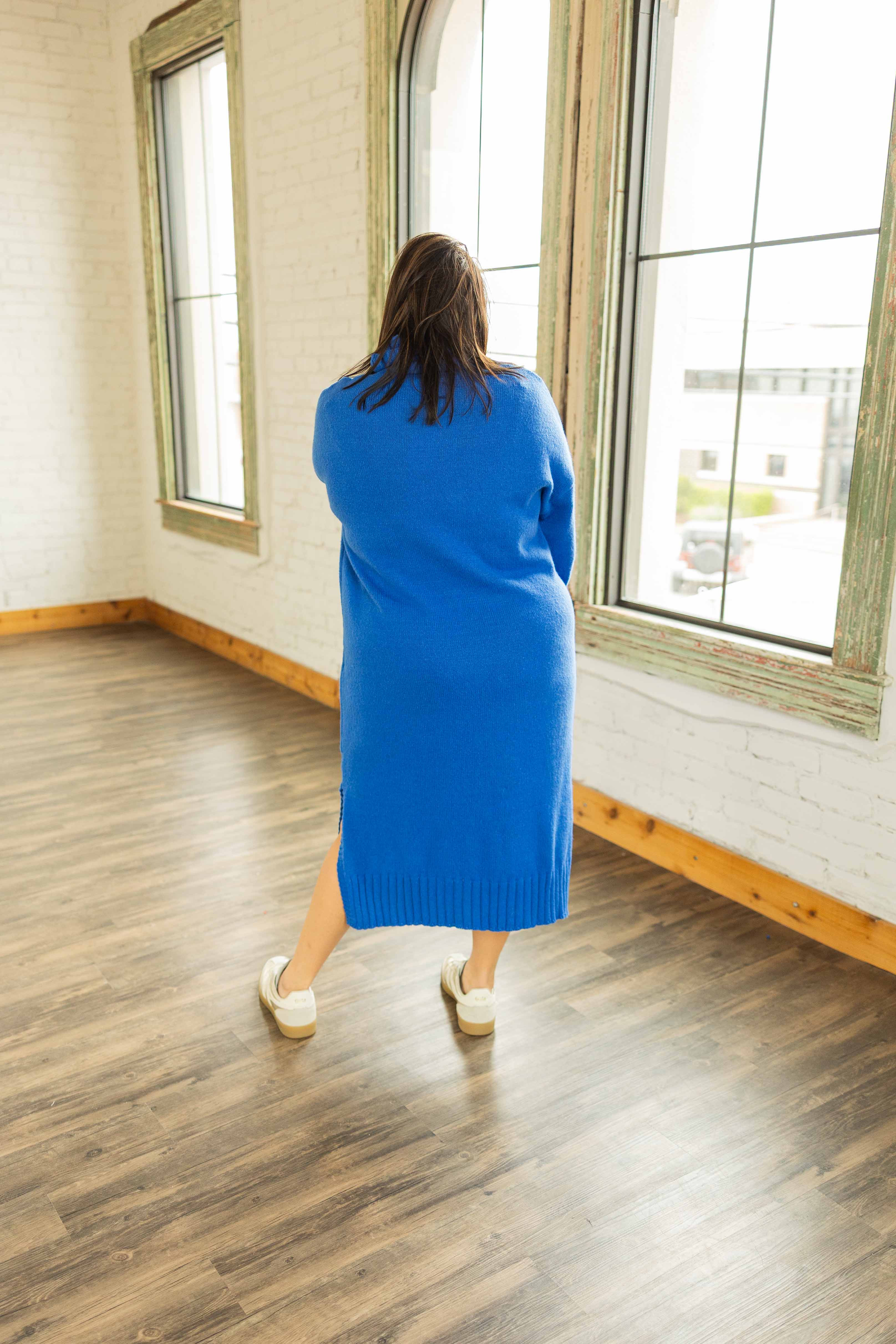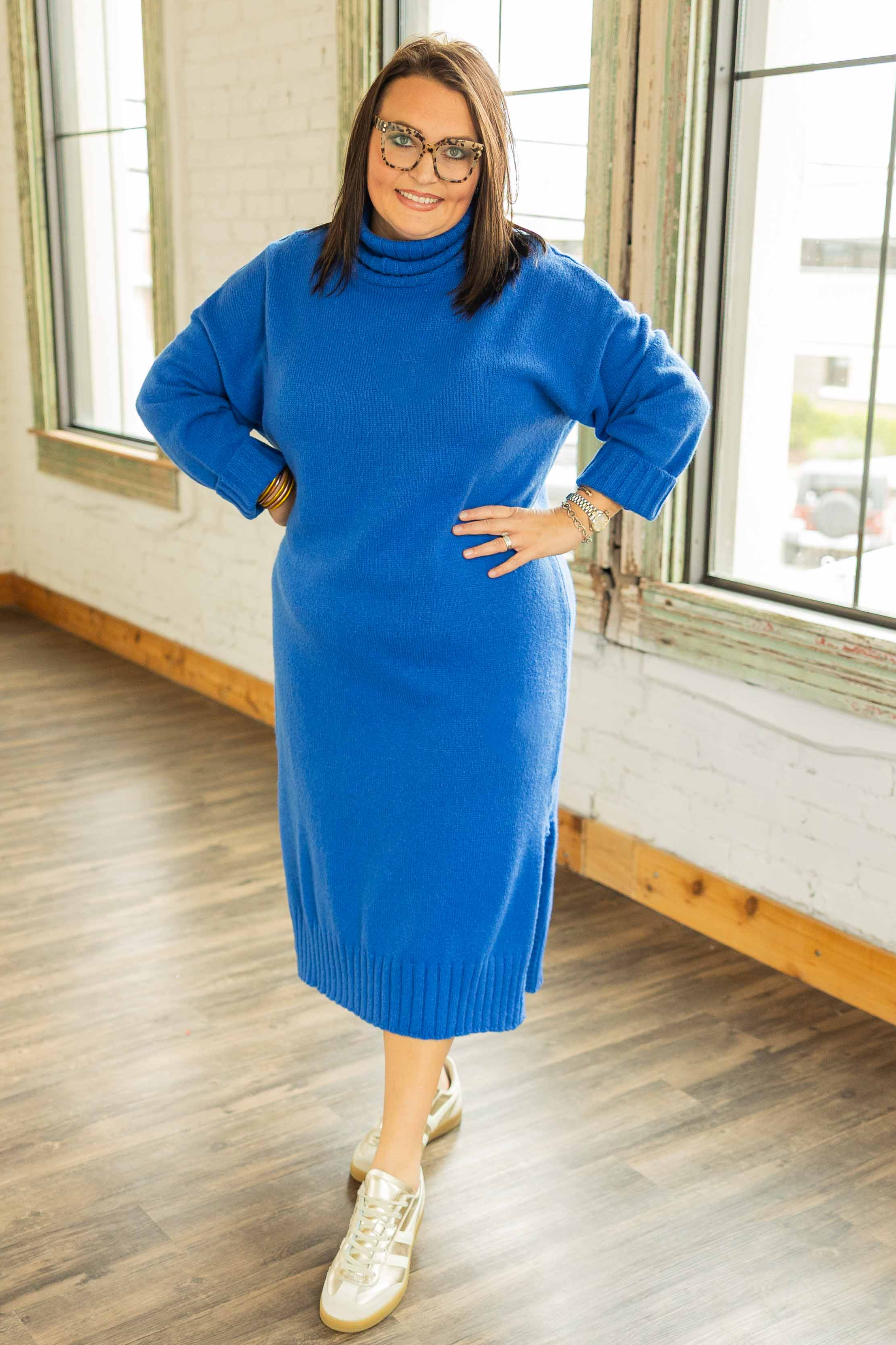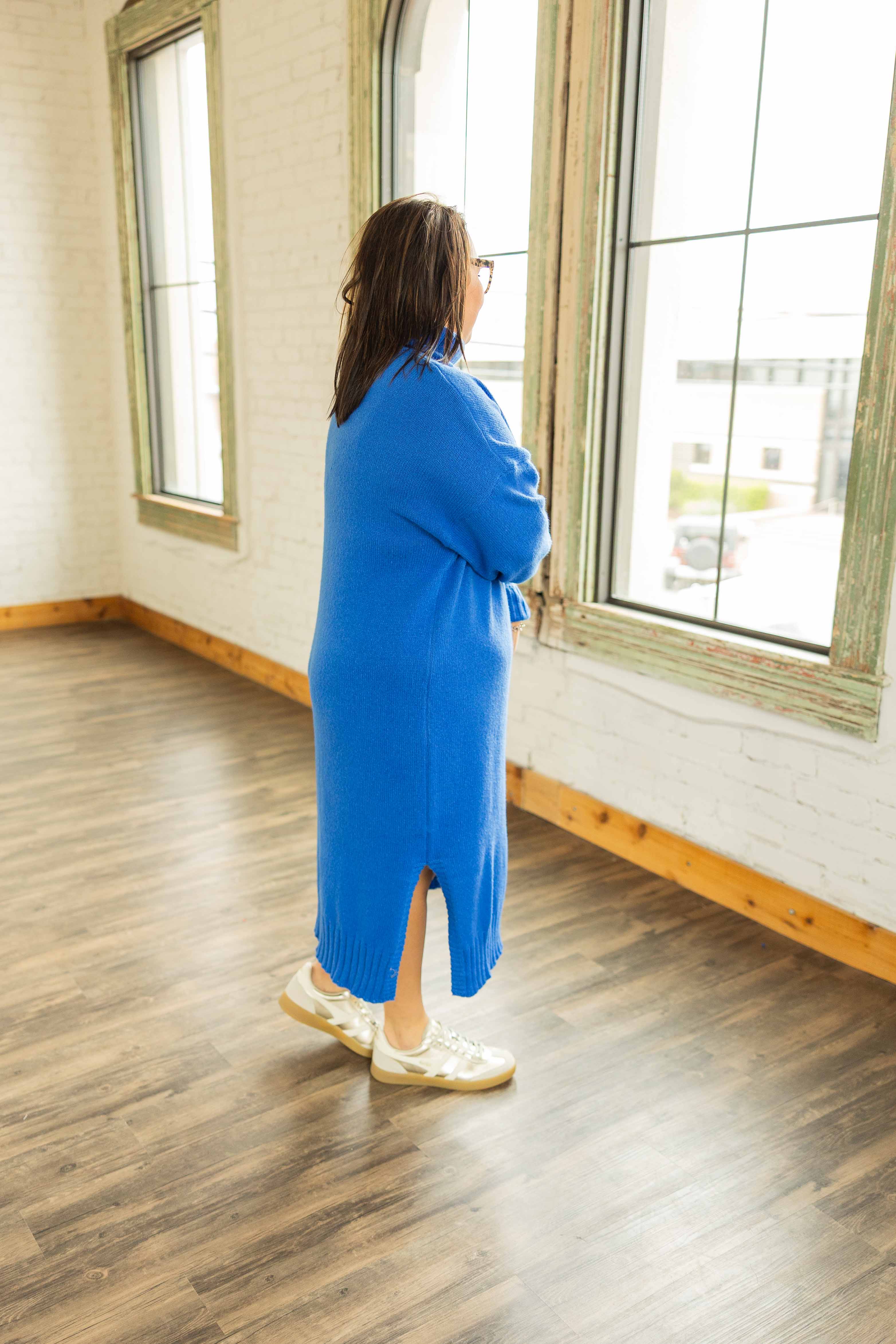 This is the throw it on and look instantly put together kind of dress. Soft knit. Easy stretch. Zero effort required. The turtleneck gives it polish, the relaxed fit keeps it comfy, and the side slits make walking. And sitting. And living. Very doable. The rich cobalt blue color is bold without being loud, and yes, it photographs beautifully.