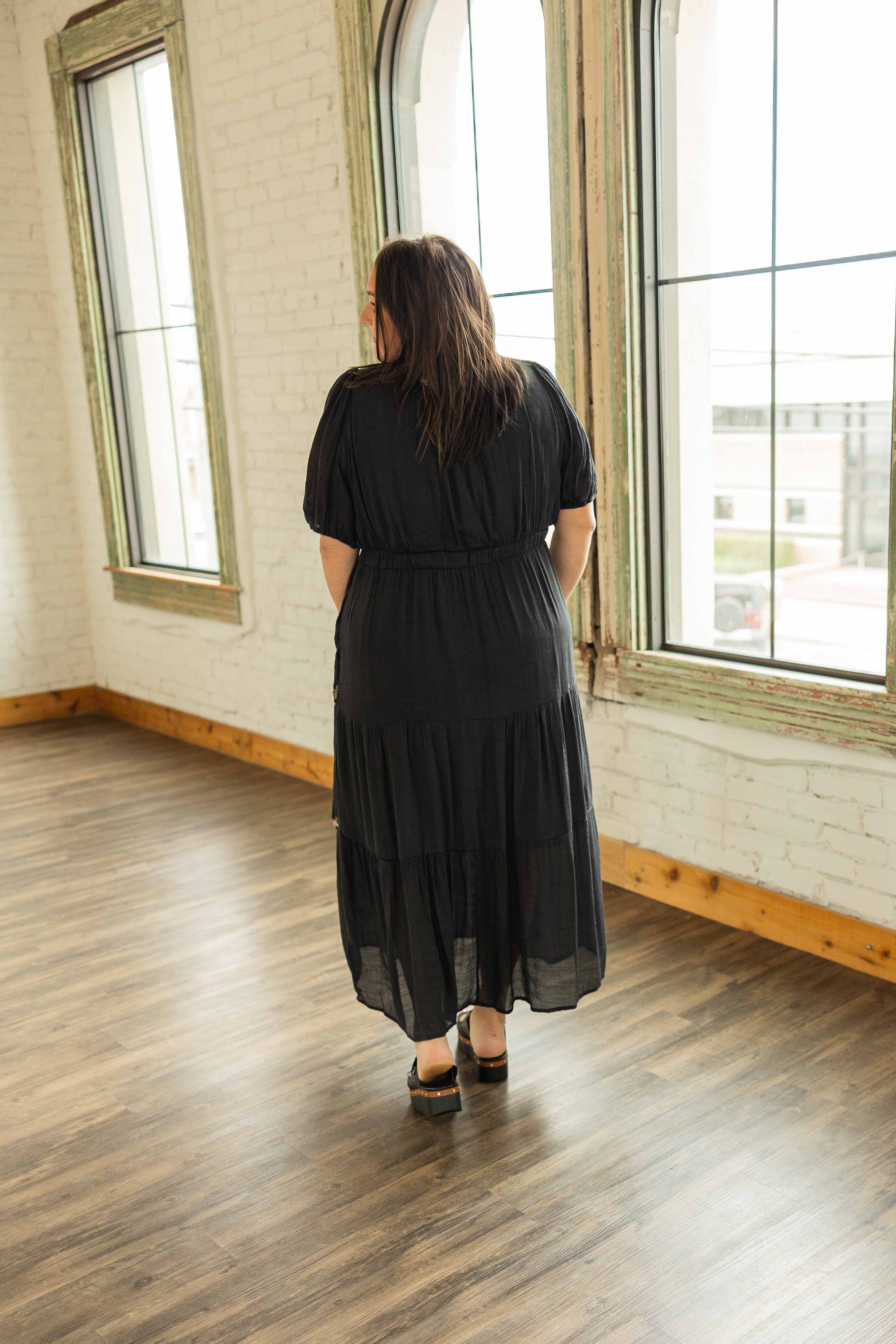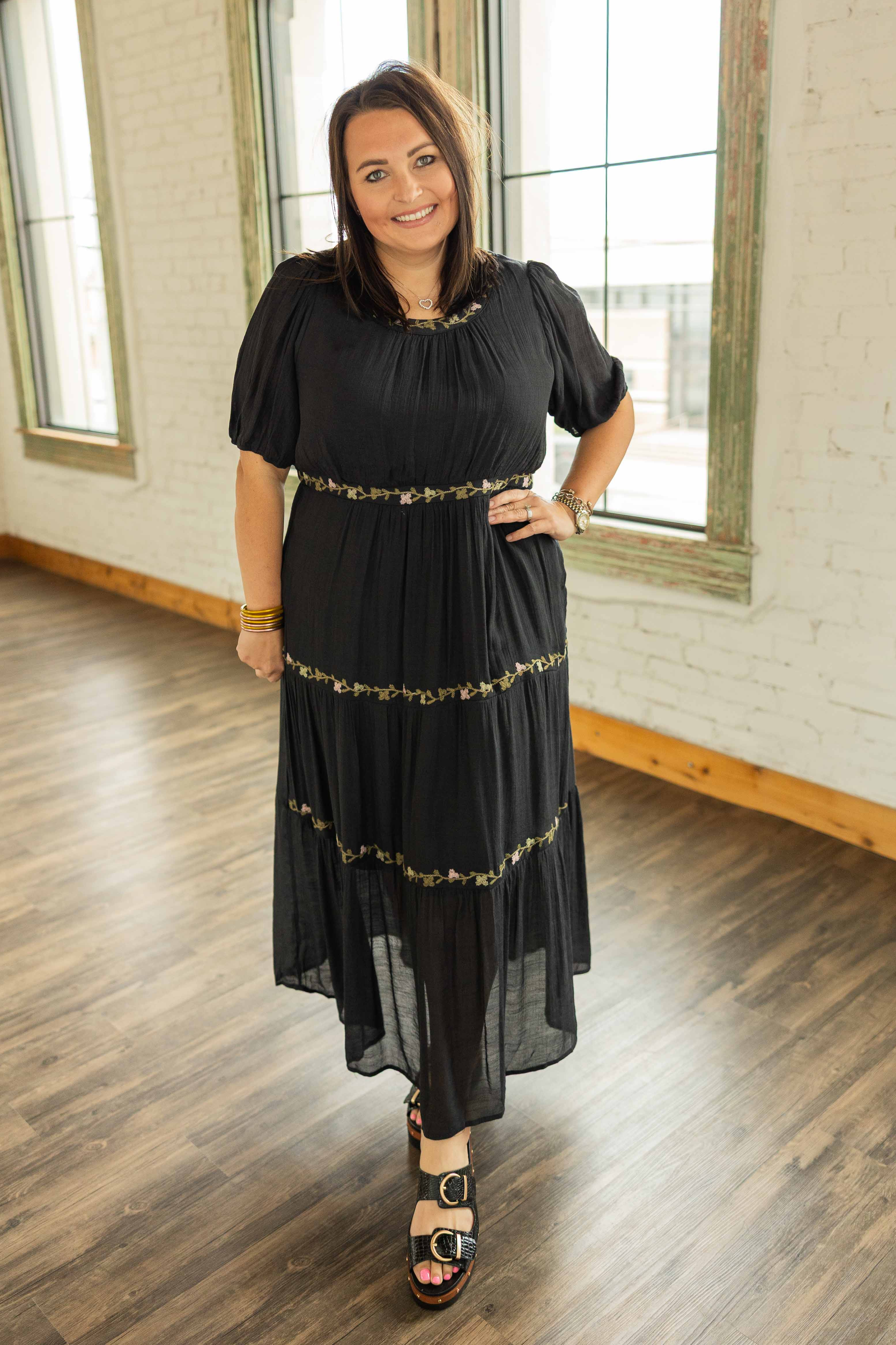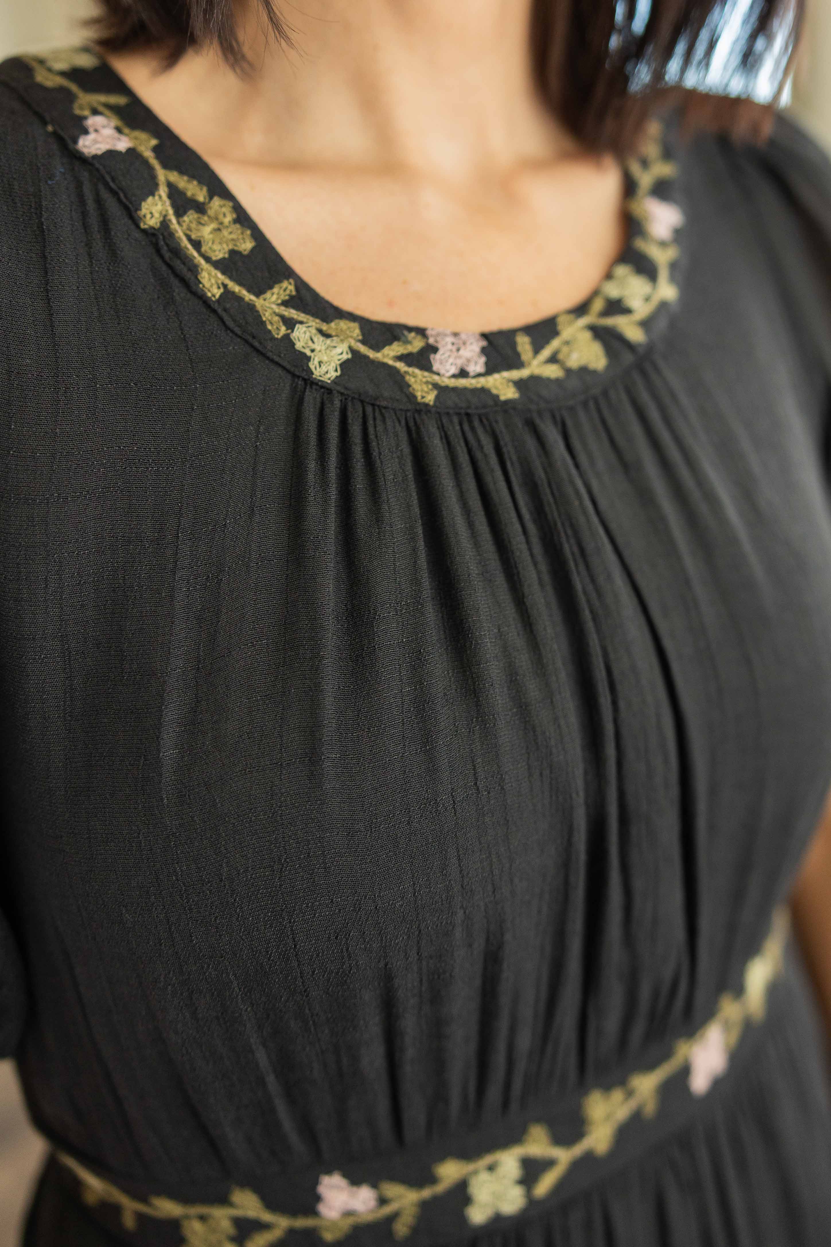 The Rosalee is effortless and quietly stunning. Soft black fabric with delicate embroidery gives it that timeless, heirloom feel without being fussy. The relaxed silhouette moves with you, the elastic waist gives shape without squeezing, and yes, it has pockets. Fully lined so it feels polished and easy all day long. This is the kind of dress you wear once and then wonder how you lived without it.