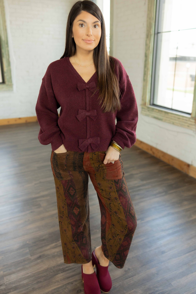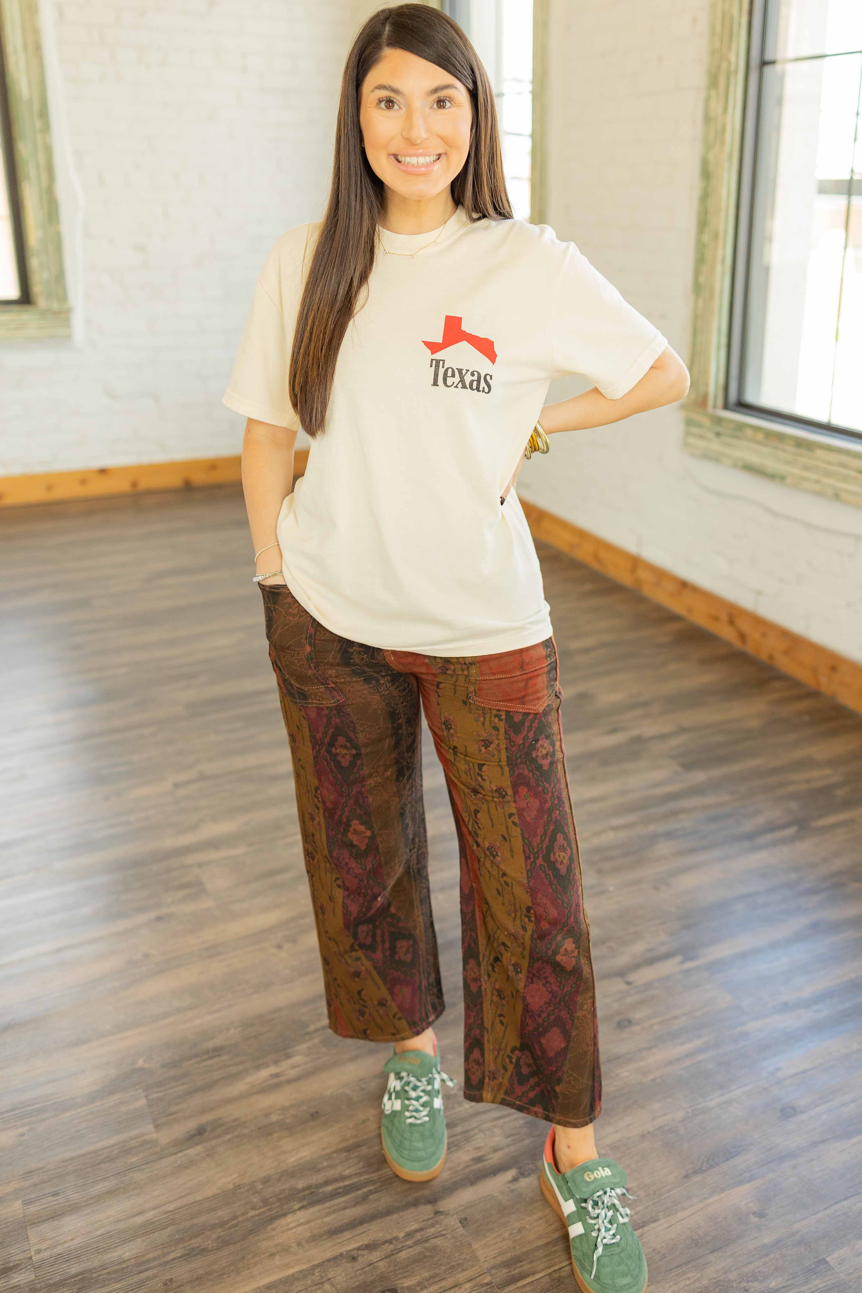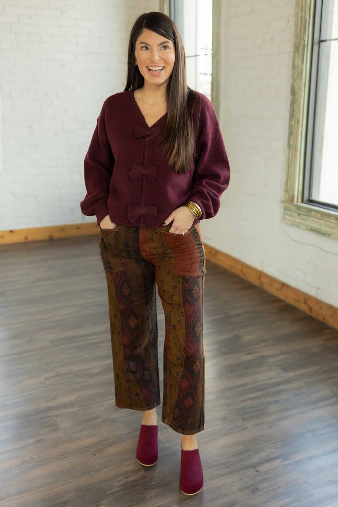 Meet the Anahi — artsy, bold, and ready to steal the spotlight. These cotton barrel pants feature a patchwork-inspired print in warm fall shades of olive, rust, and plum. The cropped wide-leg cut gives them a relaxed, easy vibe while the elastic waistband in the back keeps them comfortable. Finished with square front and back pockets that add a touch of vintage flair.