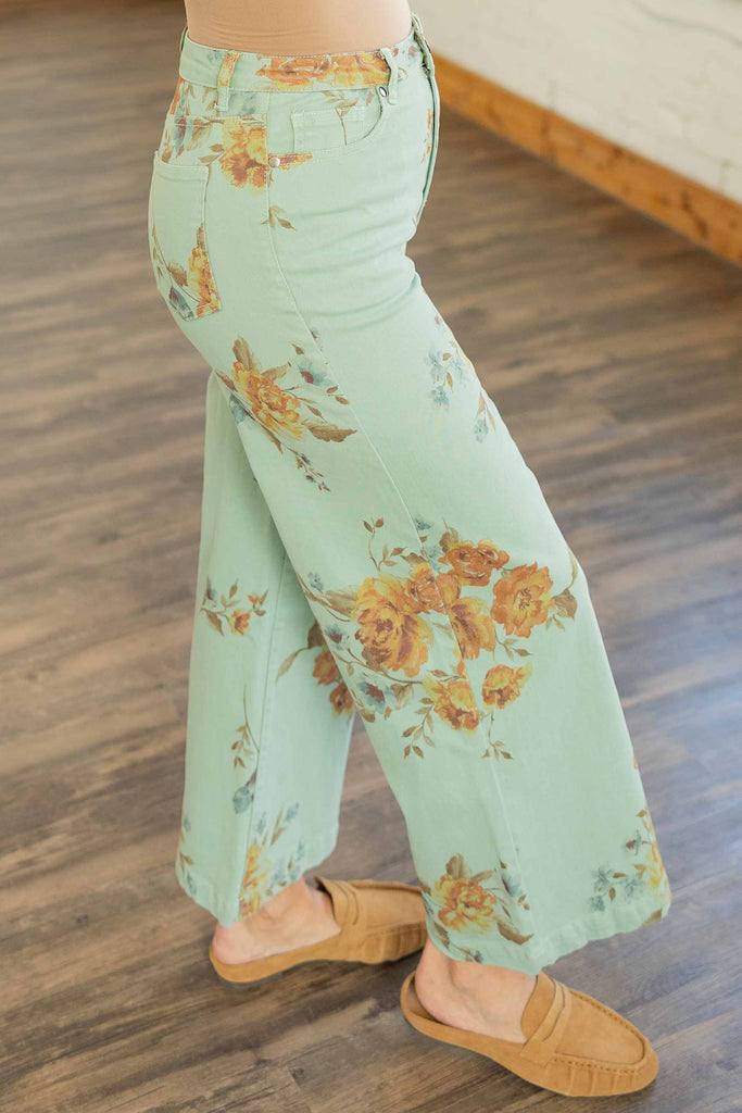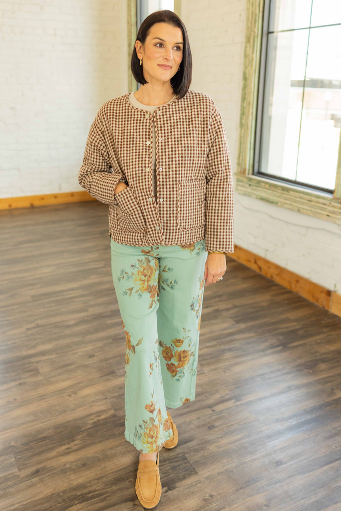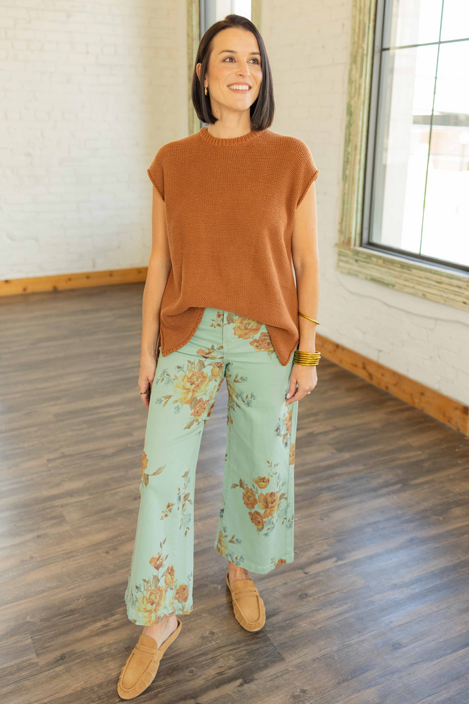 Soft, sweet, and a little unexpected. The Brinley pants bring a fresh twist to fall with their mint base and golden floral print. The cropped wide-leg fit is slightly relaxed, giving you comfort without losing shape. Pair them with knits, denim jackets, or even a tucked graphic tee for easy Texas-fall style.