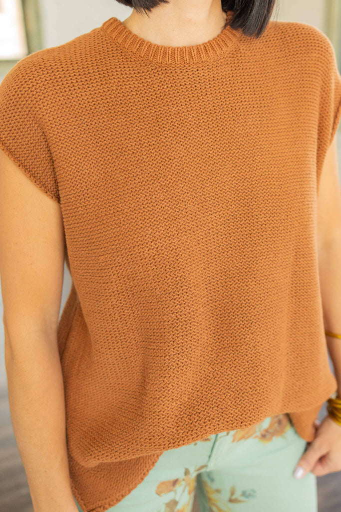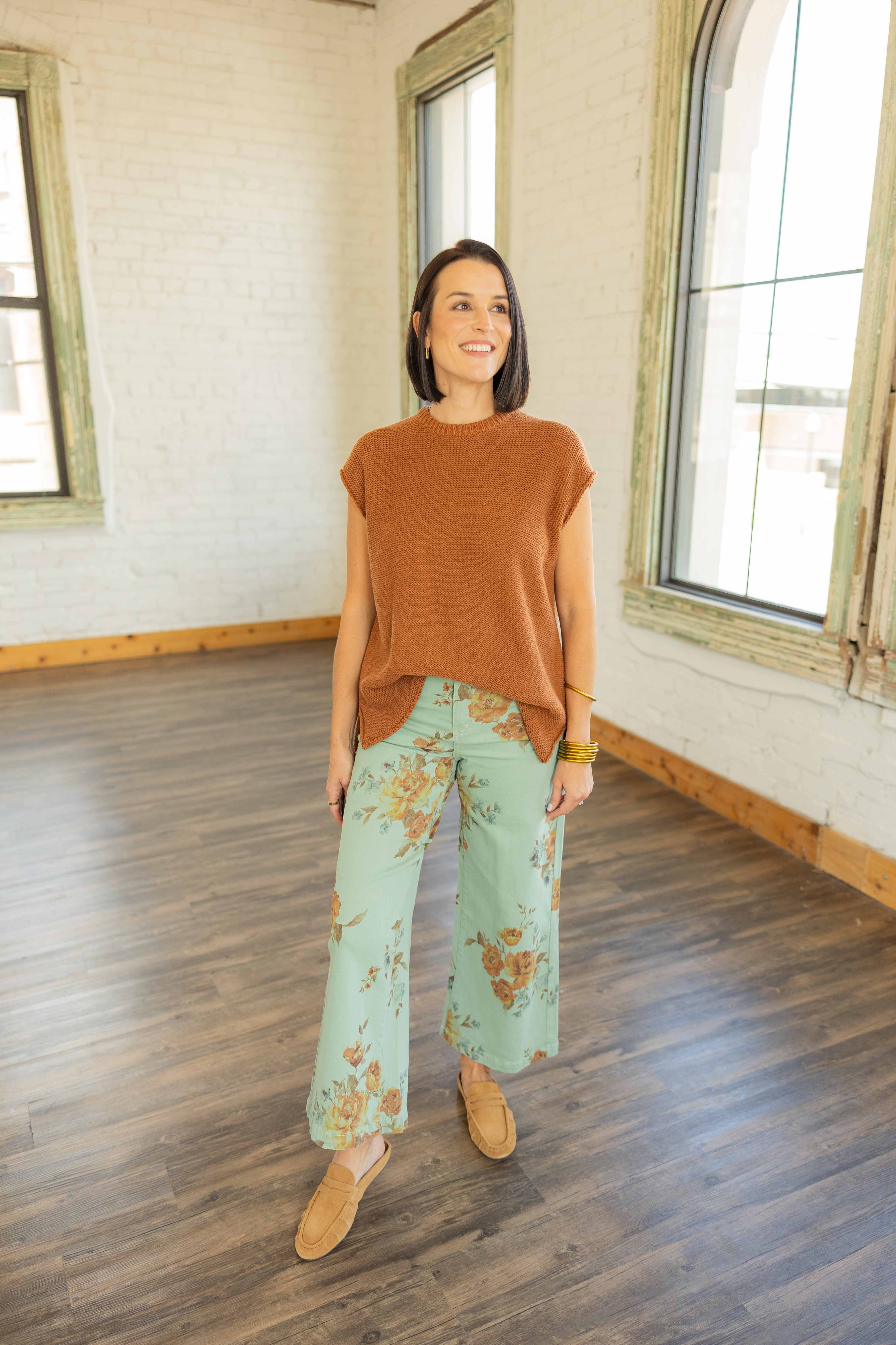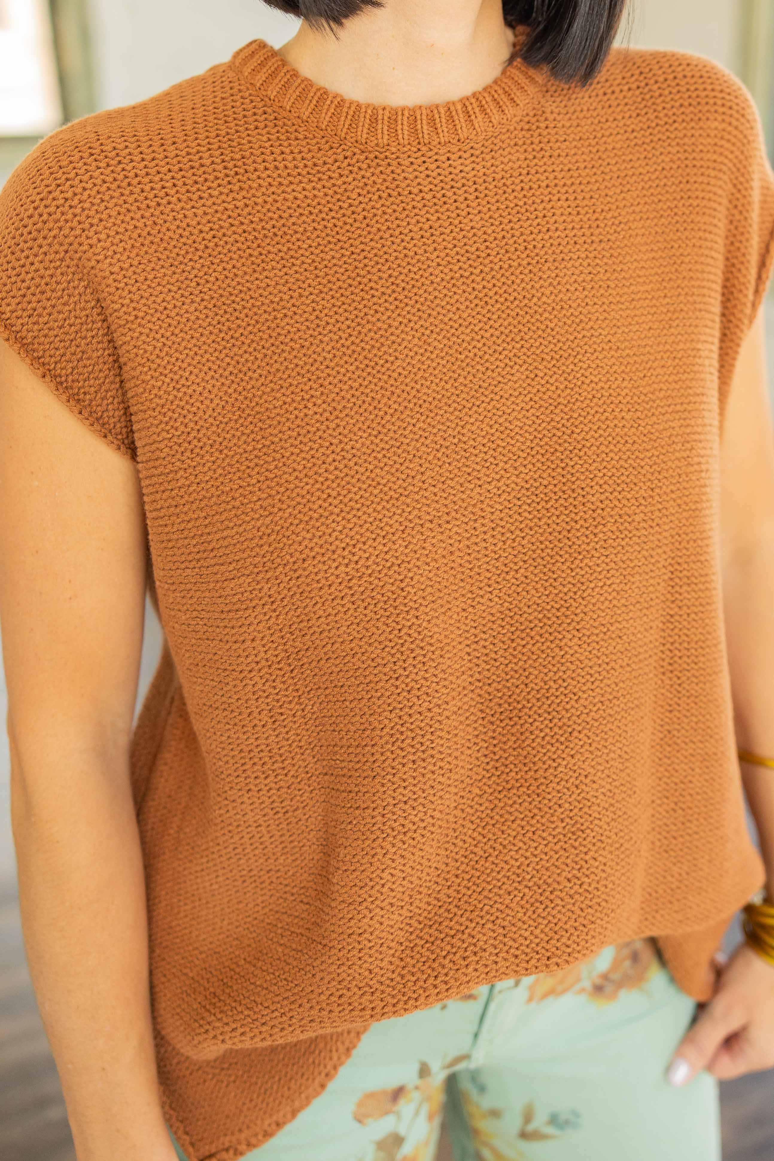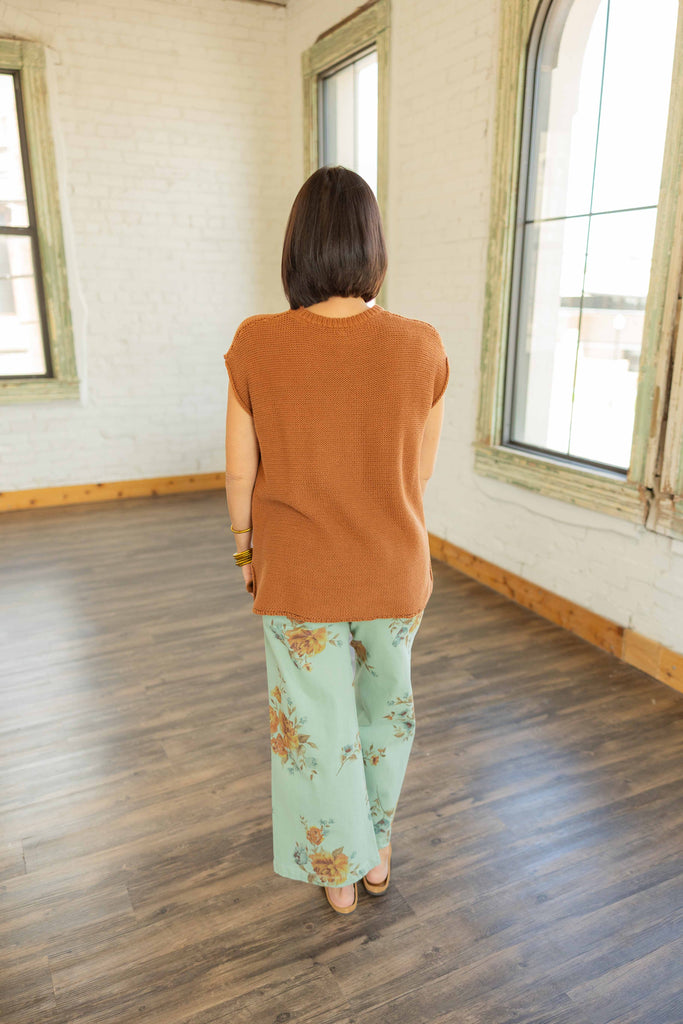 The Eloise is that effortless knit you’ll reach for over and over. This lightweight sweater top in a warm rust hue features cap sleeves, side slits, and a relaxed high-low hem. Easy to front-tuck or leave loose, it layers perfectly through every season—Texas fall included.