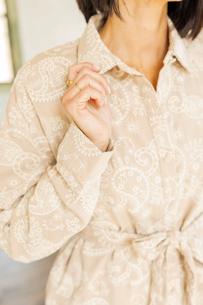 The Emory Plus is soft sophistication in dress form. This taupe embroidered mini features an allover paisley design that adds just enough detail without feeling busy. The self-tie belt lets you define your waist, while the button-up front and collared neckline keep it classic. It’s unlined but non-sheer, lightweight yet structured, and finished with side pockets for the win.