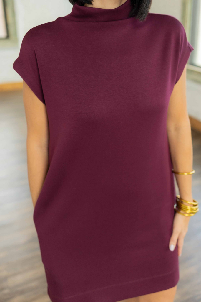 The Eva is proof that simple can still be stunning. This rich maroon pullover mini dress is made from an ultra buttery soft fabric that feels as good as it looks. The relaxed fit, cap sleeves, and mock neck give it that effortless cool-girl vibe, and yes, it has pockets. Dress it up with boots or keep it casual with sneakers—either way, it’s an instant favorite.