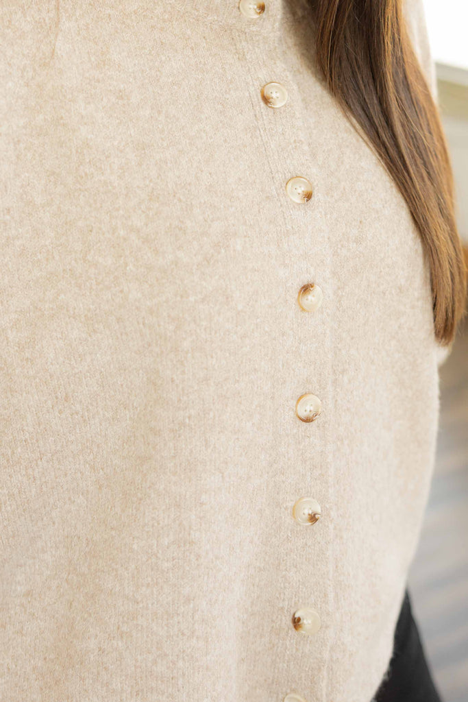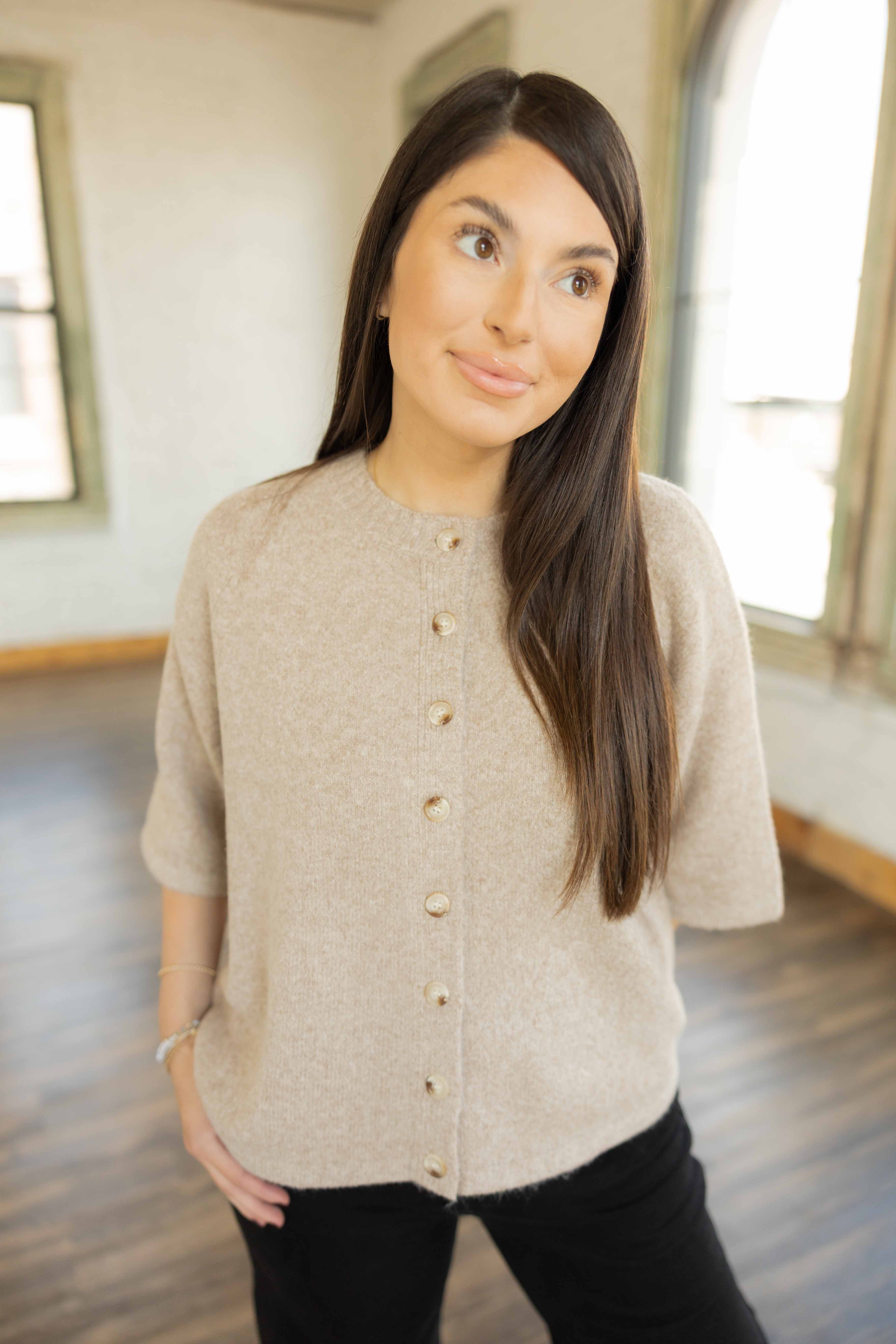 The Hallie sweater is that effortless in-between piece you’ll reach for again and again. With a soft oatmeal hue, functional buttons, and a relaxed 3/4 sleeve, it’s lightweight enough for Texas fall but cozy enough for cooler mornings. Style it buttoned up with jeans or open over a tee for a casual layered look.
