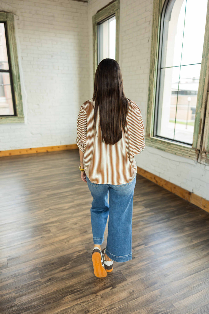 The Jordan is an easy yes for any day of the week. This lightweight top features cinnamon and cream vertical stripes with a pop of teal trim at the neckline for a little surprise color. The relaxed dolman fit keeps things cool and casual, while the elastic sleeve hems give it just enough structure. It’s one of those tops that looks equally good front-tucked or loose and flowy.