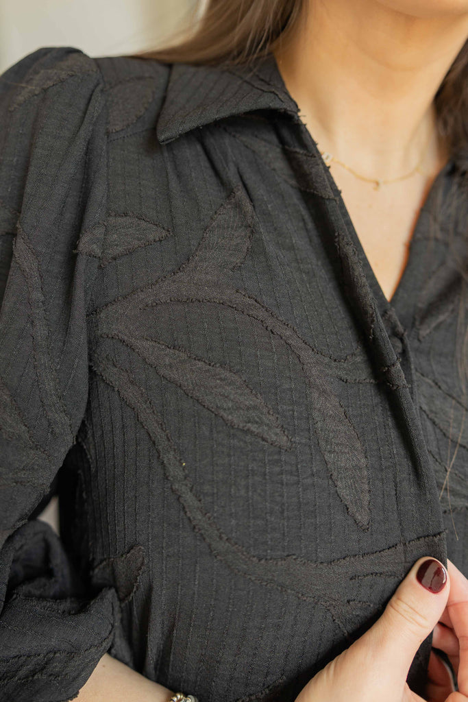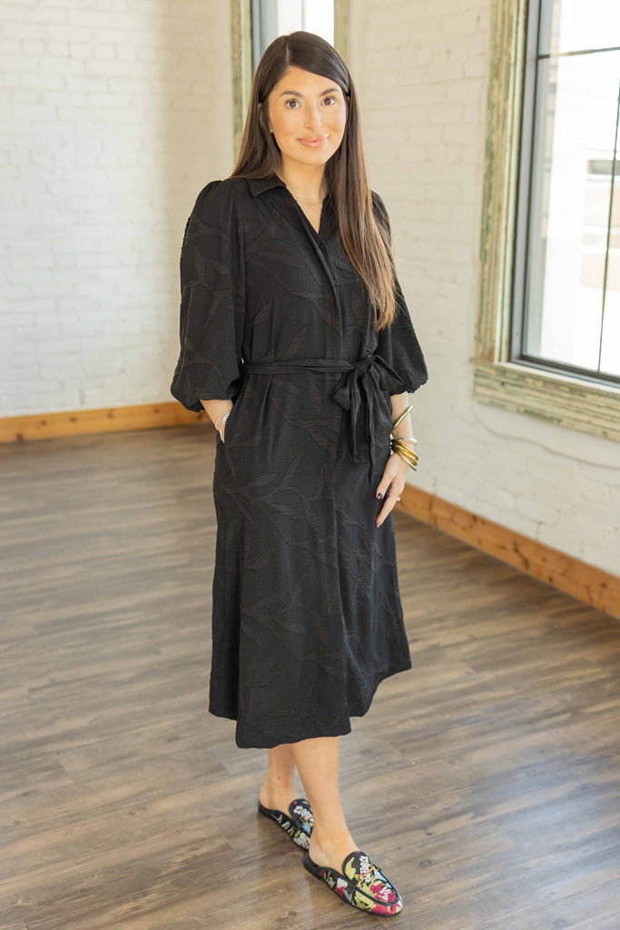 The Lily is that effortlessly chic black dress your closet’s been missing. The textured fabric gives it a subtle pattern that catches the light just right. The 3/4 sleeves and relaxed fit keep it easy, while the self-tie belt defines your waist for a flattering finish. With pockets and a full lining, it’s as practical as it is polished. Pair it with sneakers or heels and call it a day.
