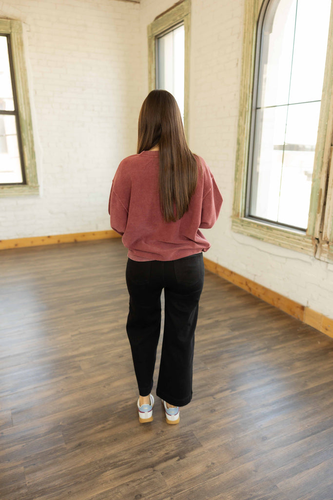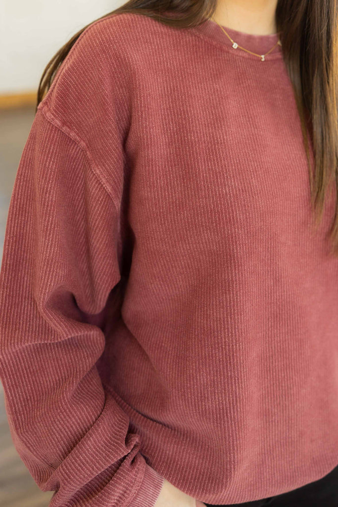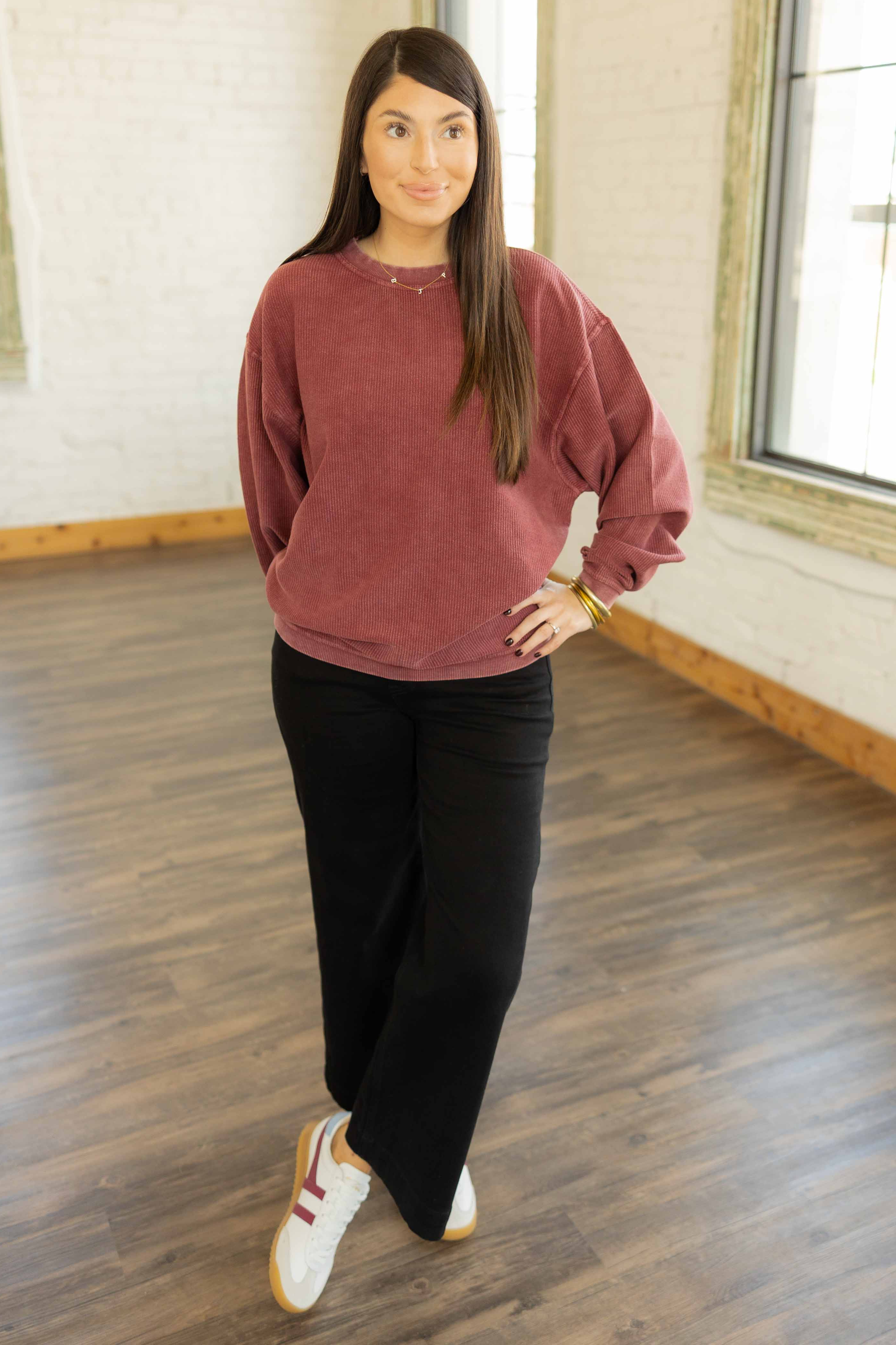 Your new favorite throw-on-and-go top. The Mandie Corded Crewneck is made from soft ribbed cotton with a relaxed, oversized fit that gives you that effortless cool look. The faded maroon color adds a touch of cozy vintage charm, perfect for laid-back days or casual nights out.