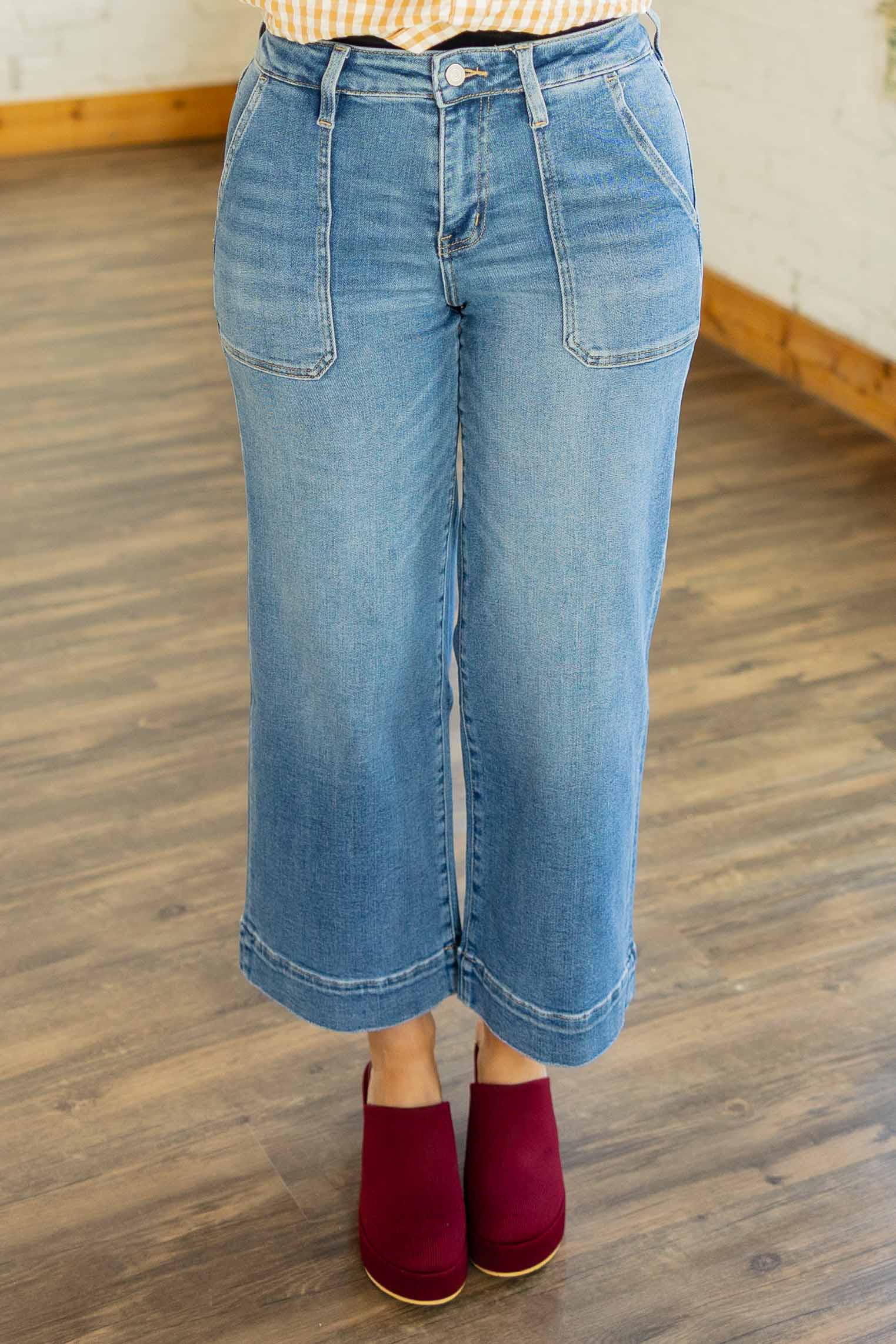 The Serenity jeans are your easy-going, everyday denim dream. Made from soft comfort stretch denim in a classic medium wash, they hit that perfect spot between structured and comfy. The cropped wide leg gives a laid-back vibe, while the utility pocket detail adds a modern twist. These jeans are finished with a trouser-style hem that makes them easy to dress up or down.