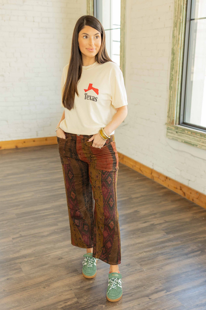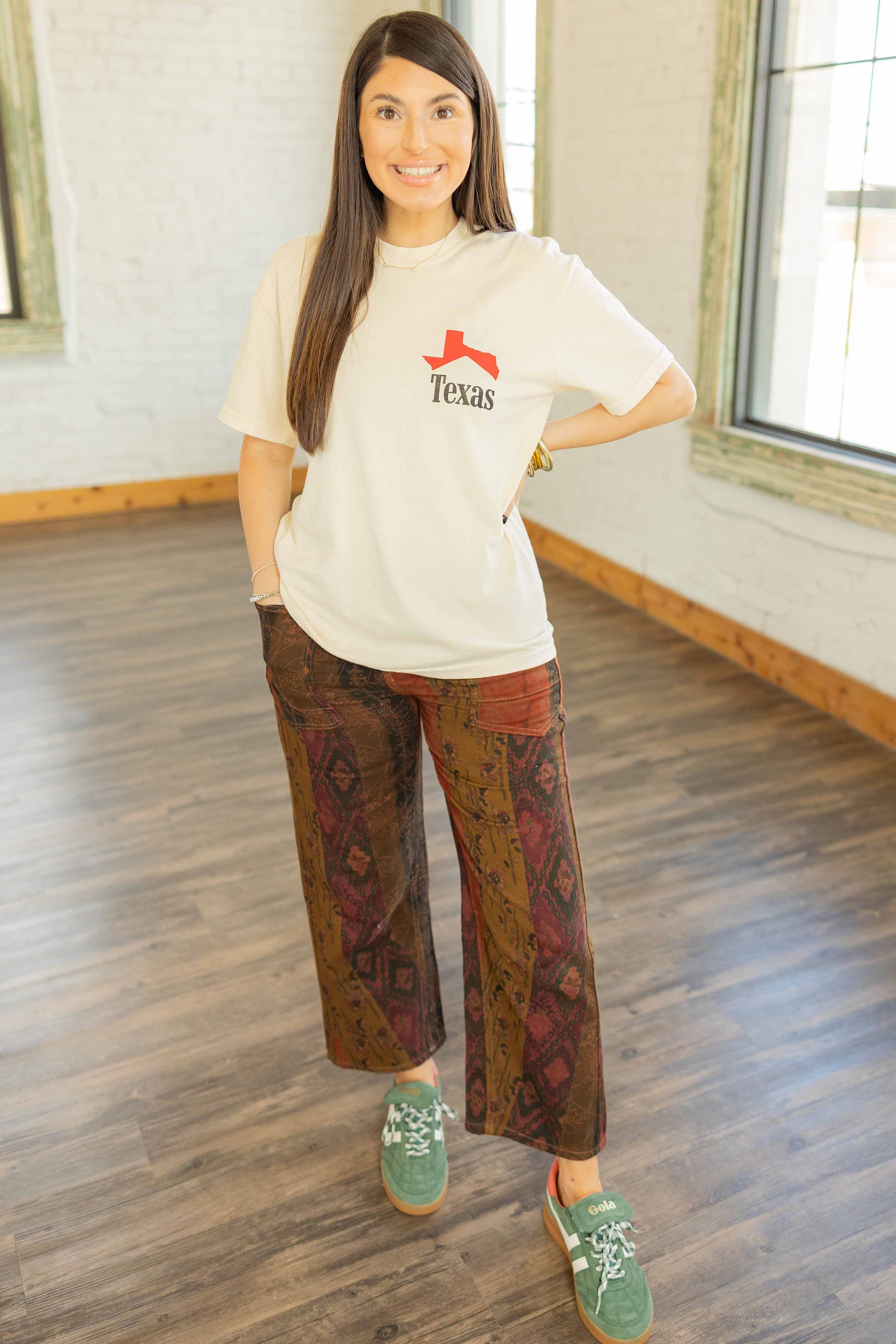 Say howdy to your new favorite tee. This soft 100% cotton graphic top celebrates all things Texas with a bold red state outline on the front and a cowboy-on-horseback print on the back. The creamy natural color makes it easy to pair with denim, skirts, or layered under your favorite shacket.