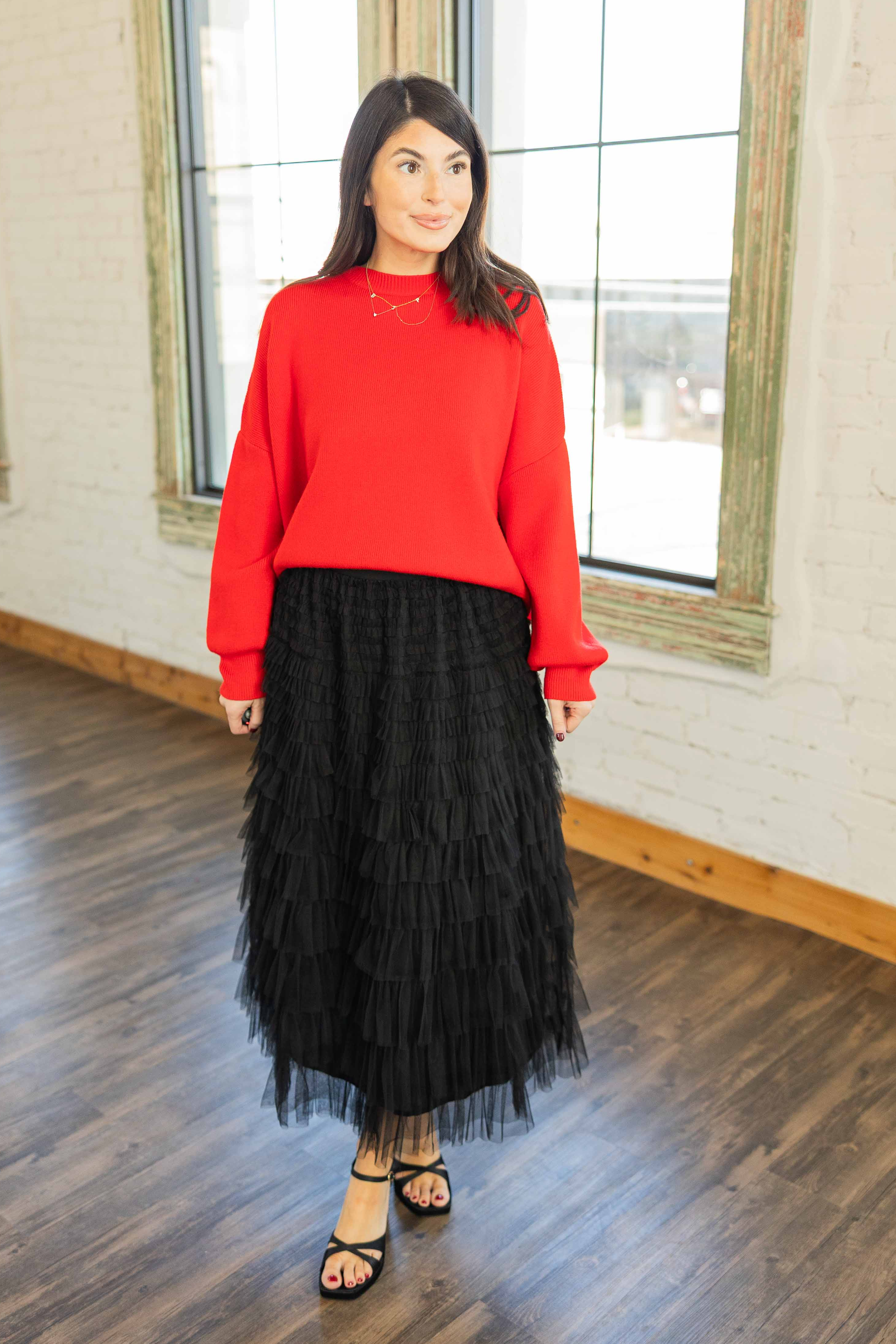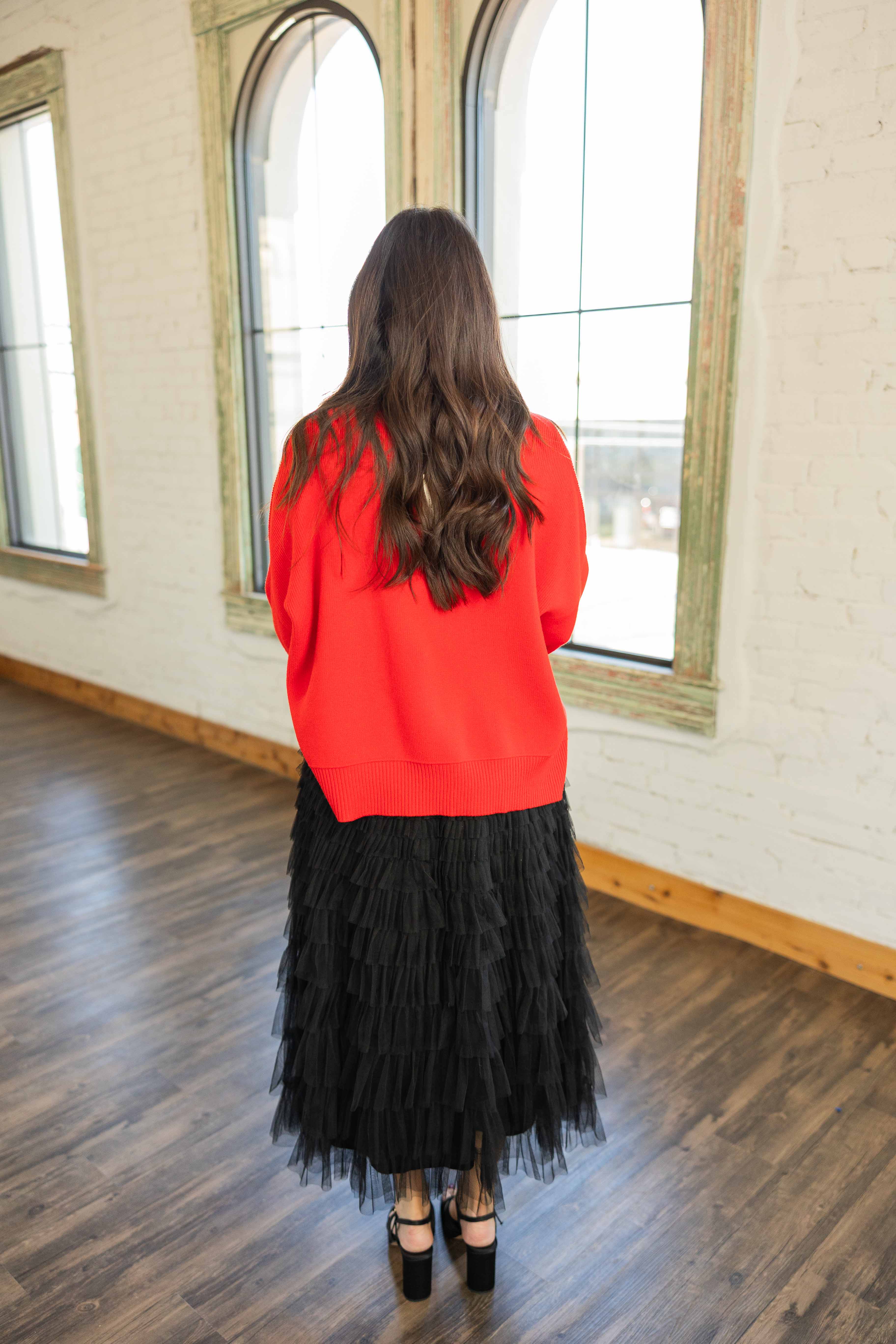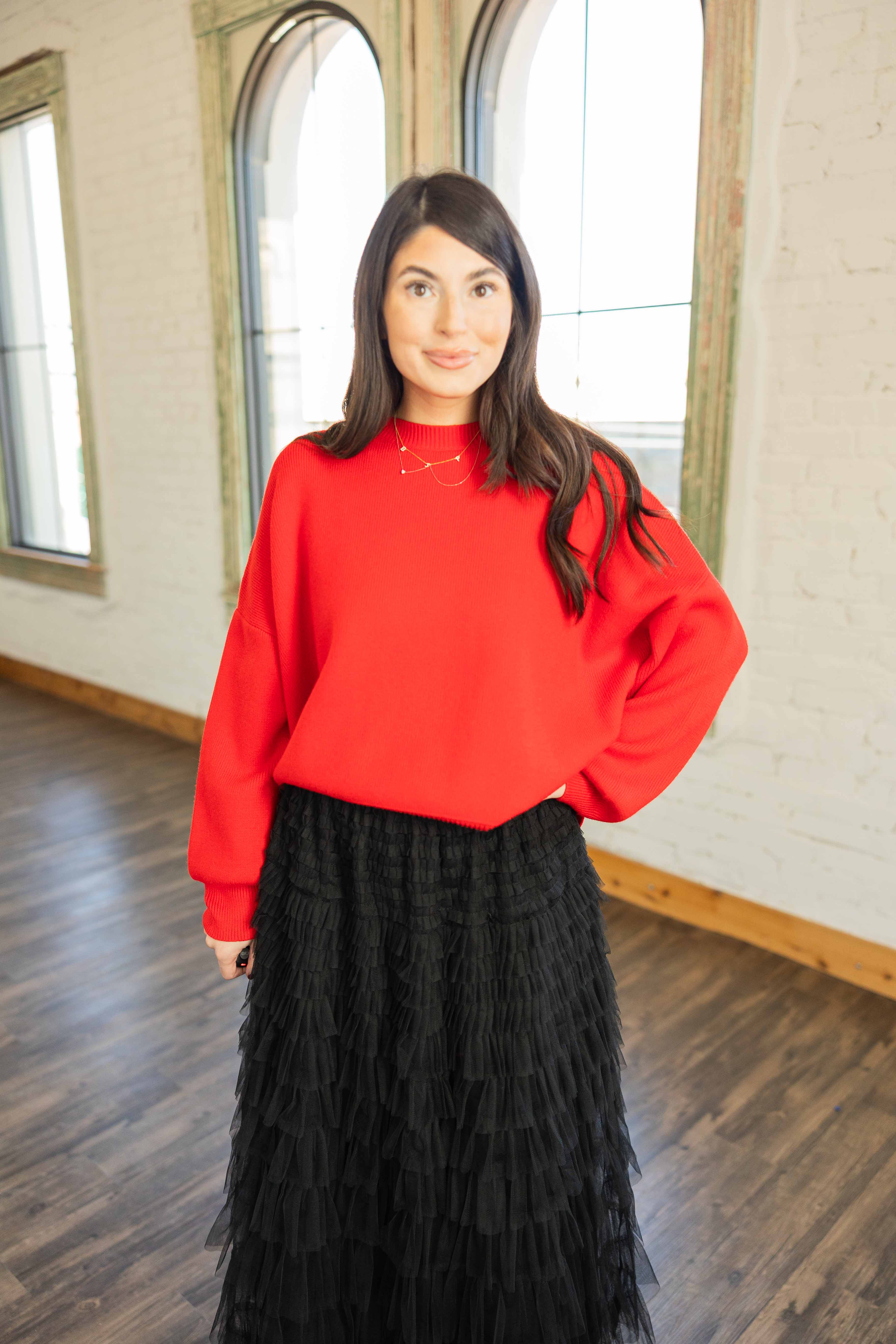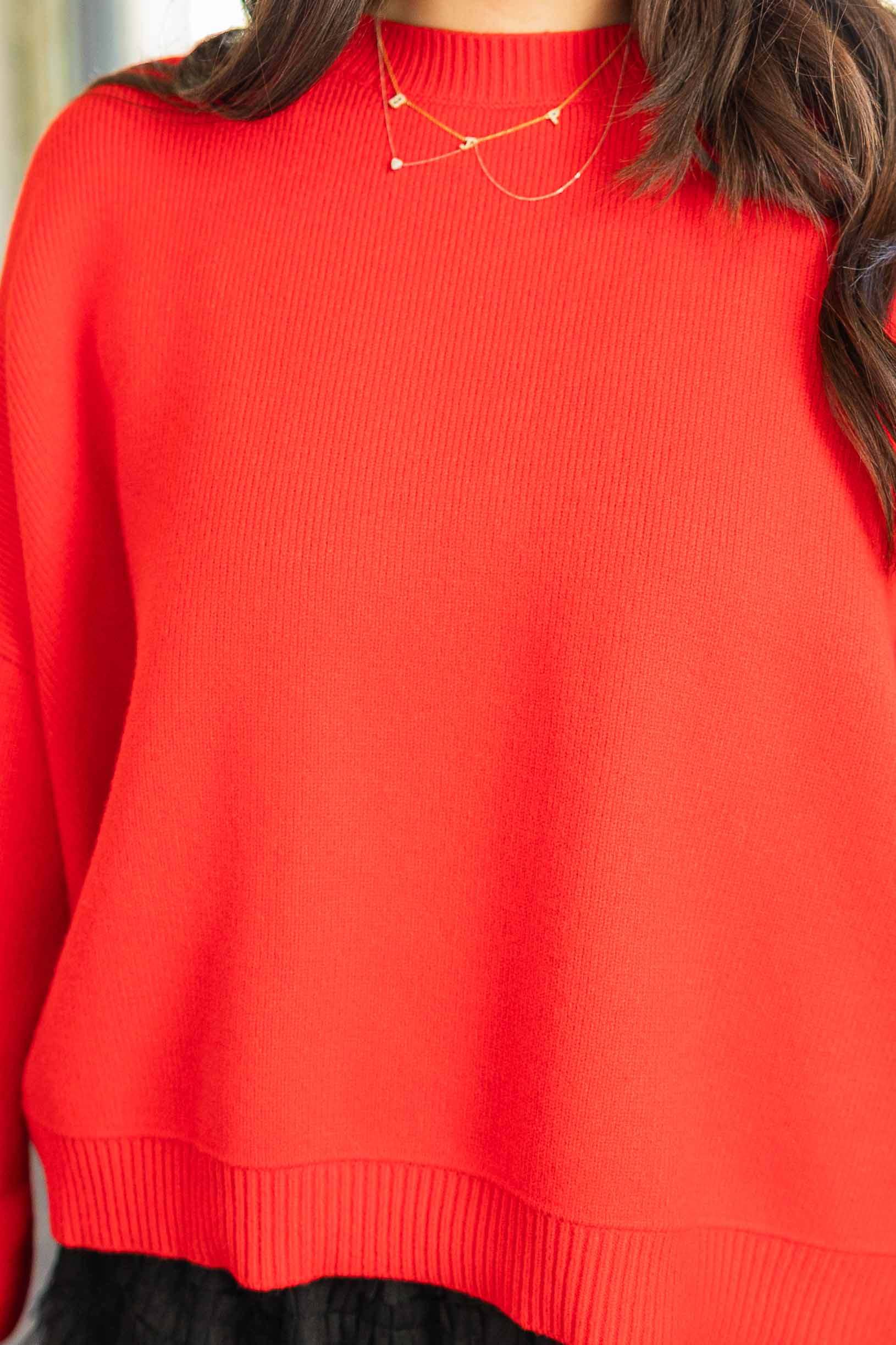Bold, bright, and cozy. This red sweater features an easy drop shoulder silhouette with a relaxed oversized fit. The side slits give it movement and make it front tuck friendly. Soft knit and simple lines keep it wearable for everyday or dressed up moments.