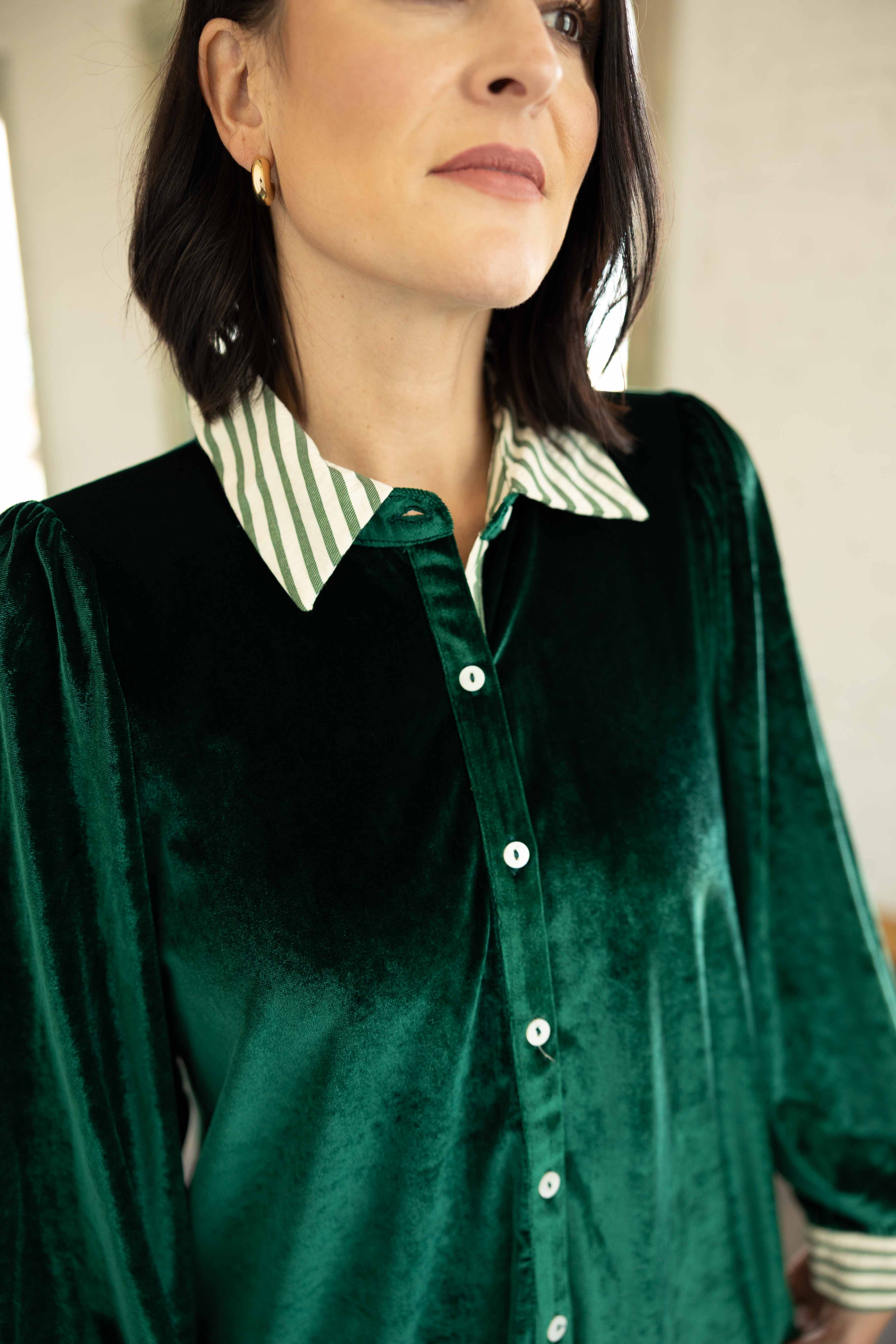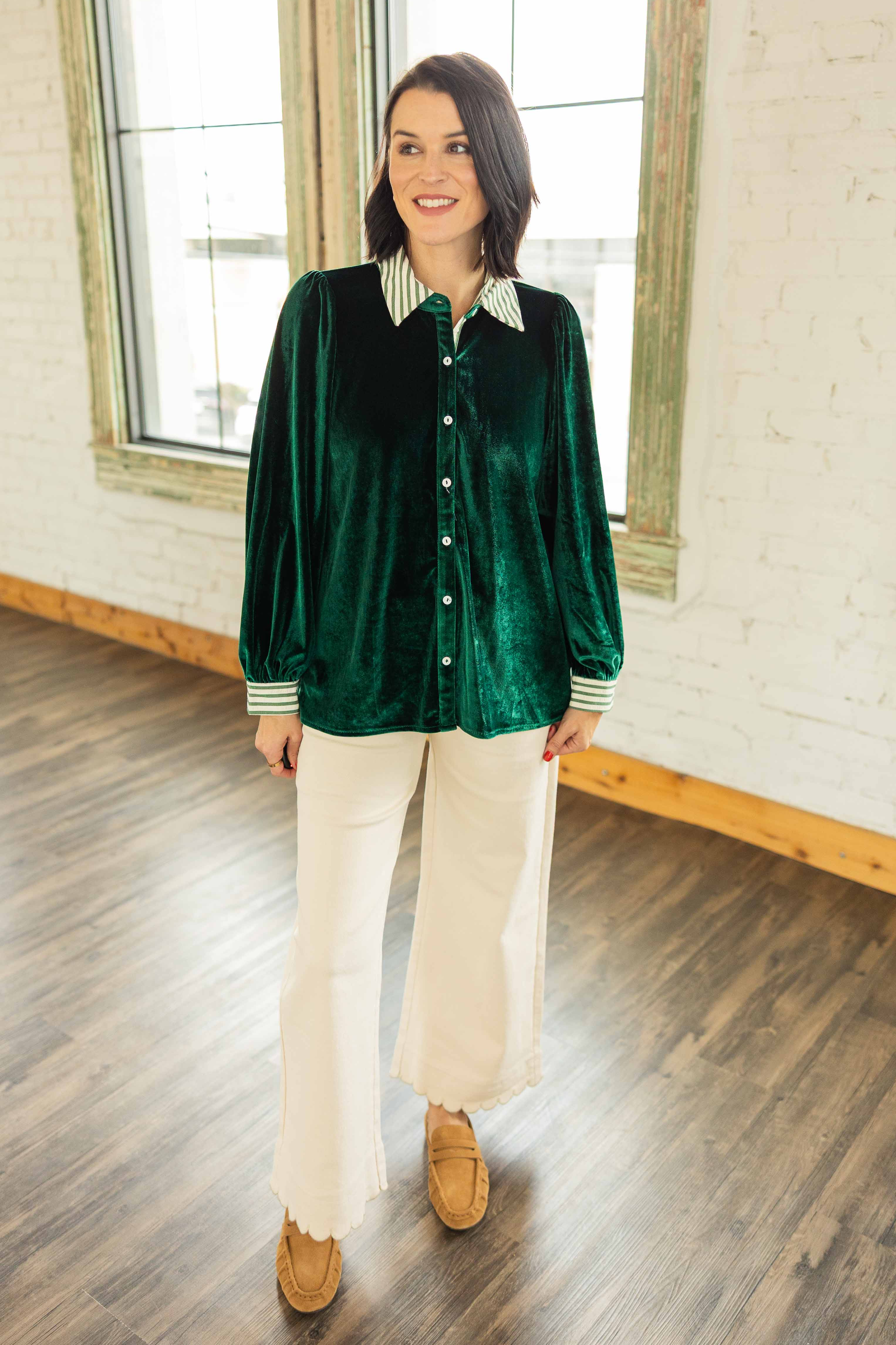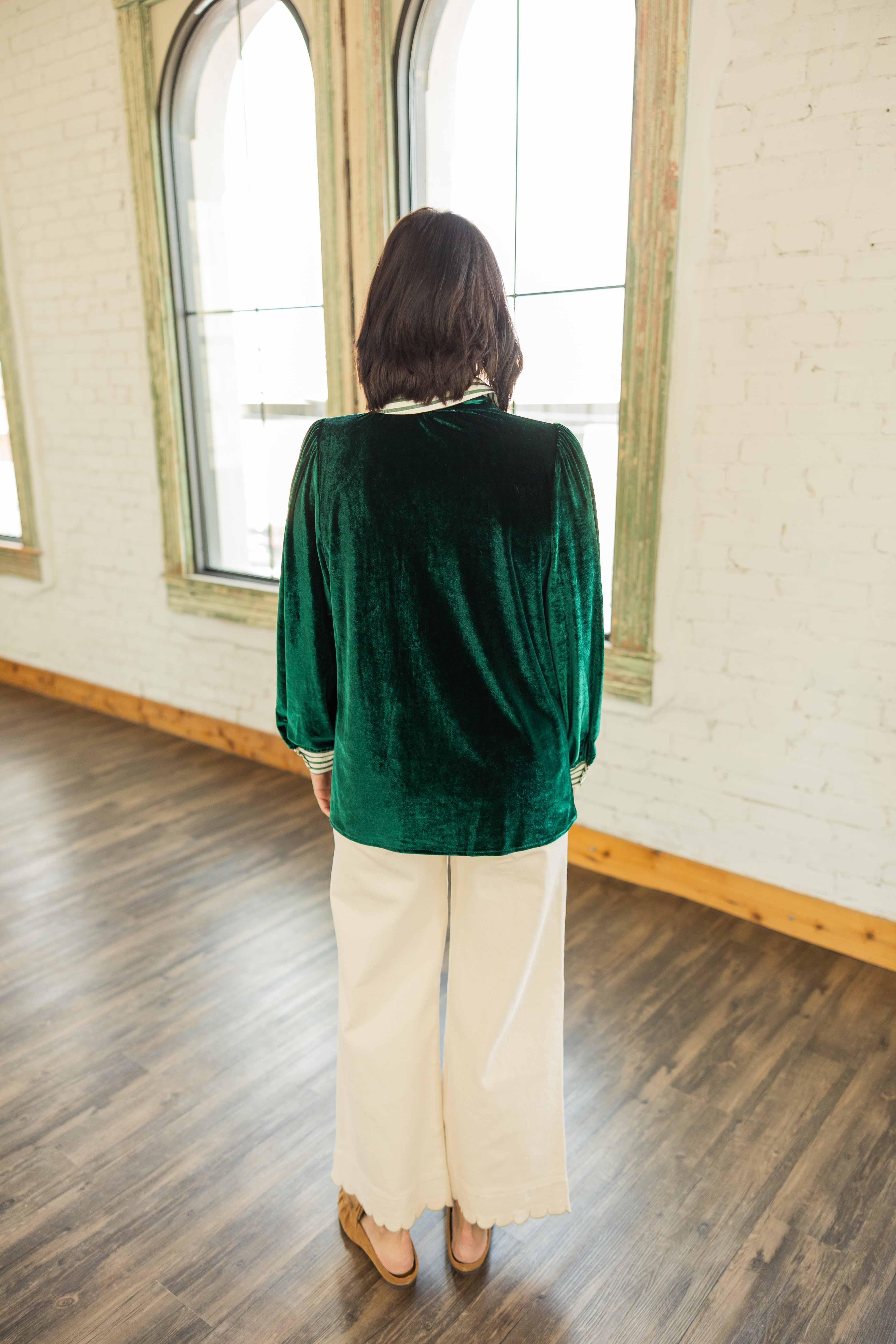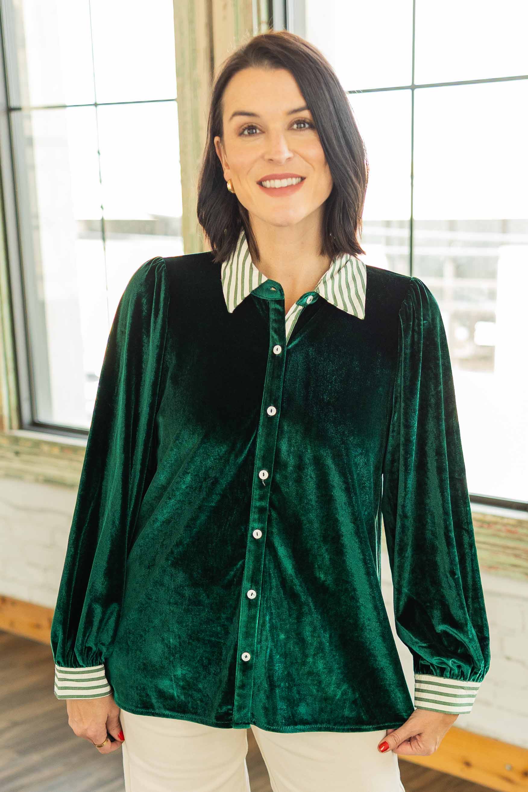 A luxe velvet moment in rich green that feels like holiday magic. The striped contrast collar and cuffs add a playful twist. Easy to dress up or down, Brynlee gives any outfit a soft glow.