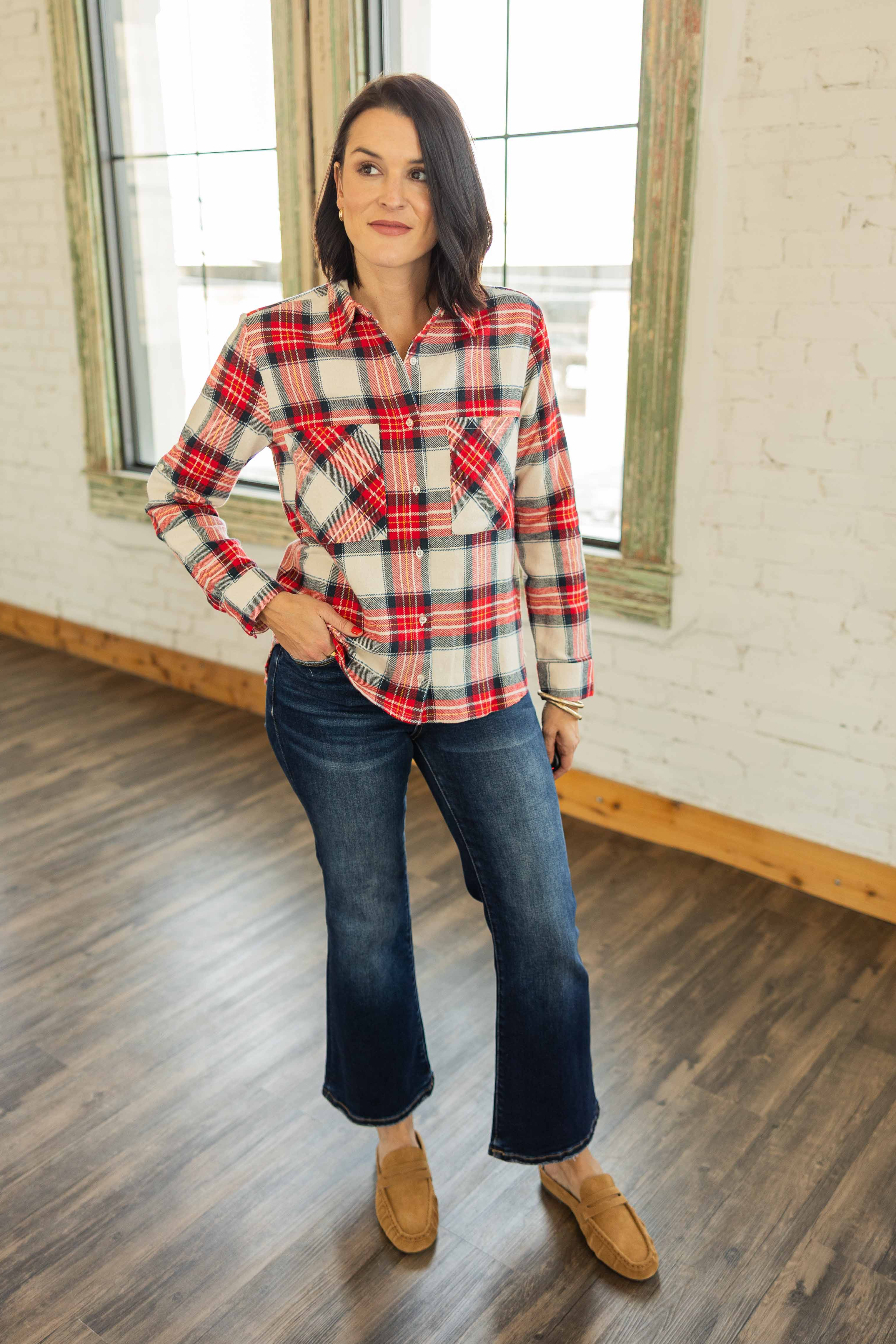 A classic holiday plaid that feels nostalgic and cute. The relaxed boxy fit gives easy comfort. Lightweight flannel fabric works great for our warmer winters. Two front pockets add that casual, lived in look.