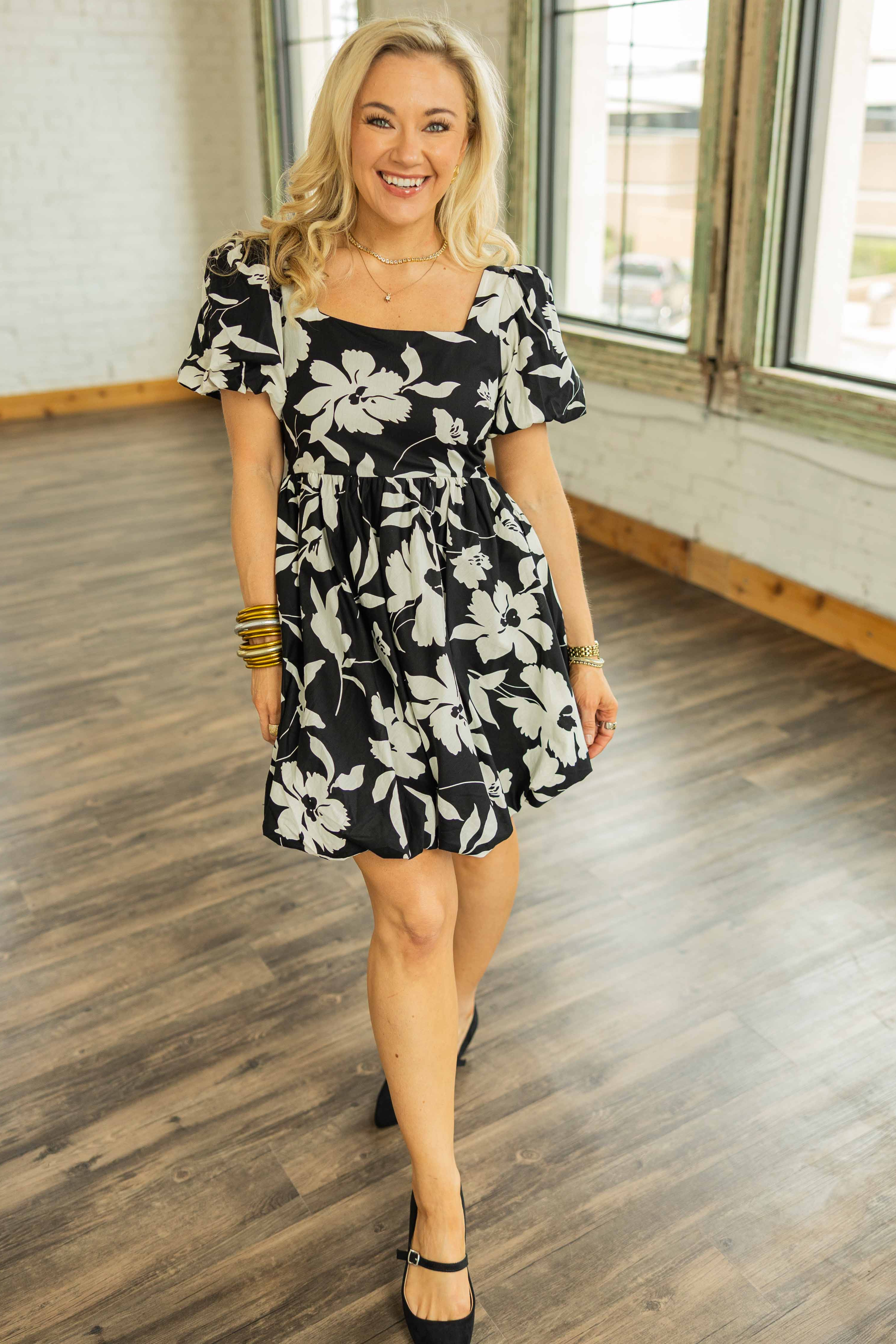 This dress is pure joy. It’s feminine, flirty, and a little bit fancy without trying too hard. The floral print pops against the bold black background, and the babydoll silhouette is universally flattering. That sweet bubble hemline gives it a little extra volume and bounce, and the smocked back with bow detail means it's as comfy as it is cute. Fully lined and 100% cotton, so you’ll stay cool even when your calendar is packed.