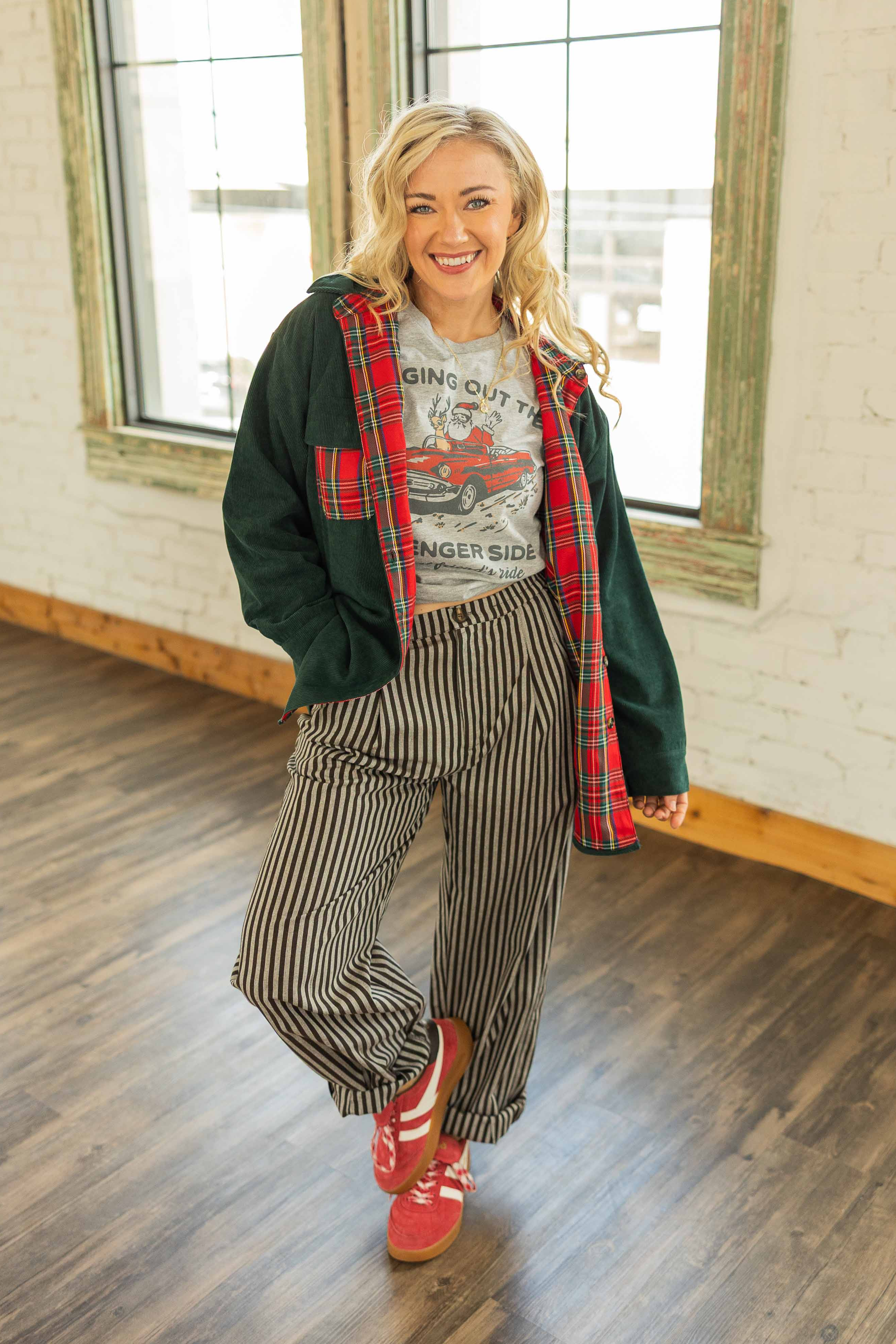 Two looks in one. The rich forest green corduroy brings the cozy, while the red plaid screams festive fun. Flip it depending on your mood or your outfit. It is warm enough to layer like a jacket, but soft enough to wear like a shirt. Holiday magic, but make it practical.