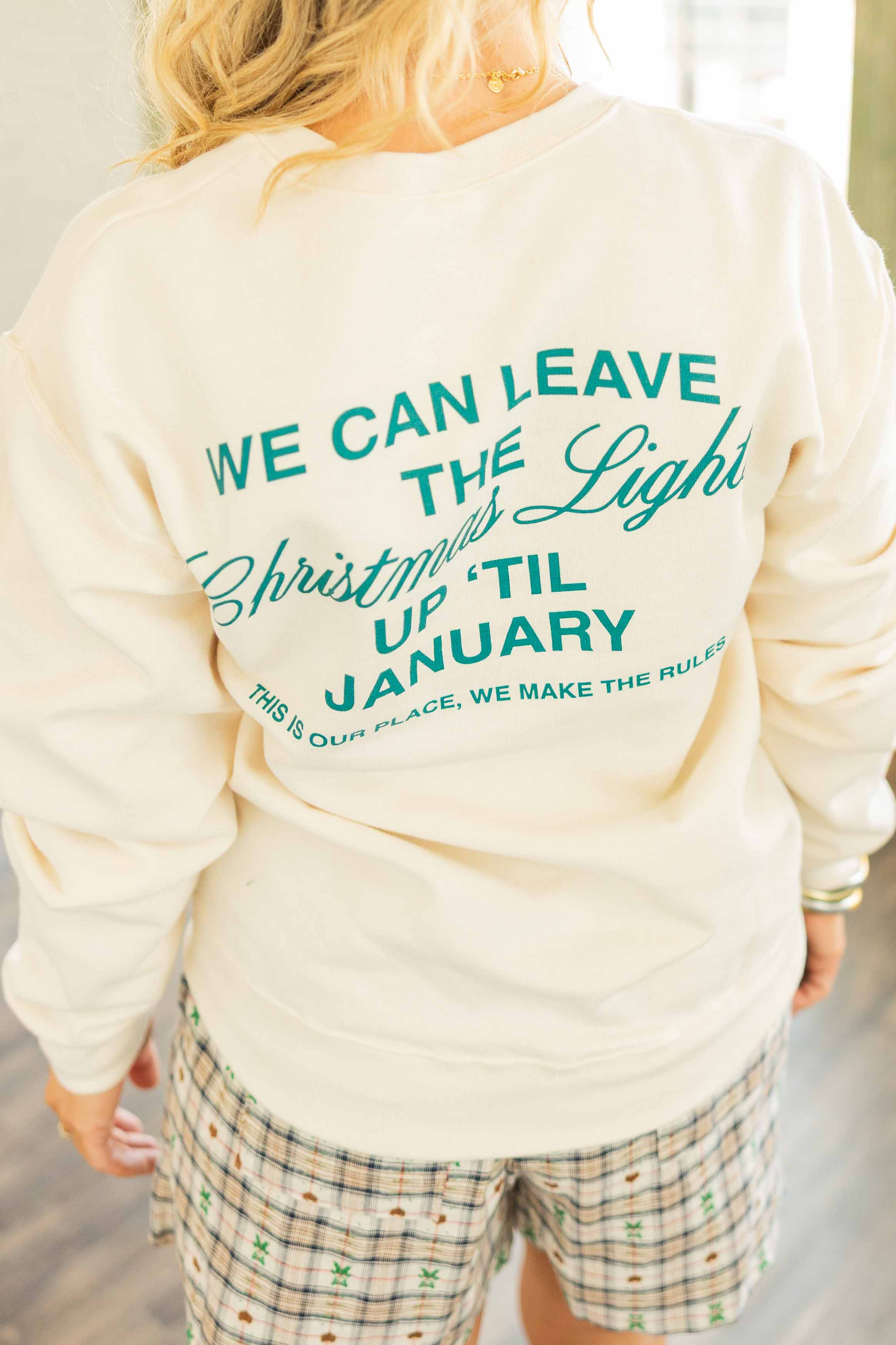 Bright idea. Cozy feel. This beige crewneck brings the cheer with dark teal lettering that reads “We can leave the Christmas lights up ’til January” on the front and back. Soft fleece interior keeps you warm while you pretend you are not still eating holiday cookies. True to size fit that pairs well with jeans, joggers or those boxer shorts you told everyone were “loungewear”.