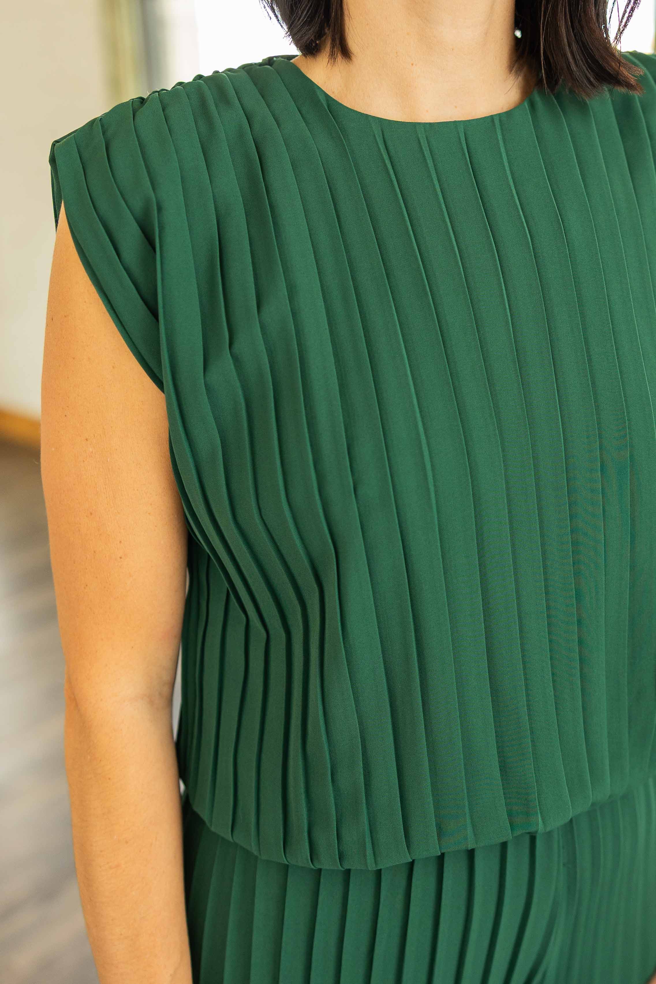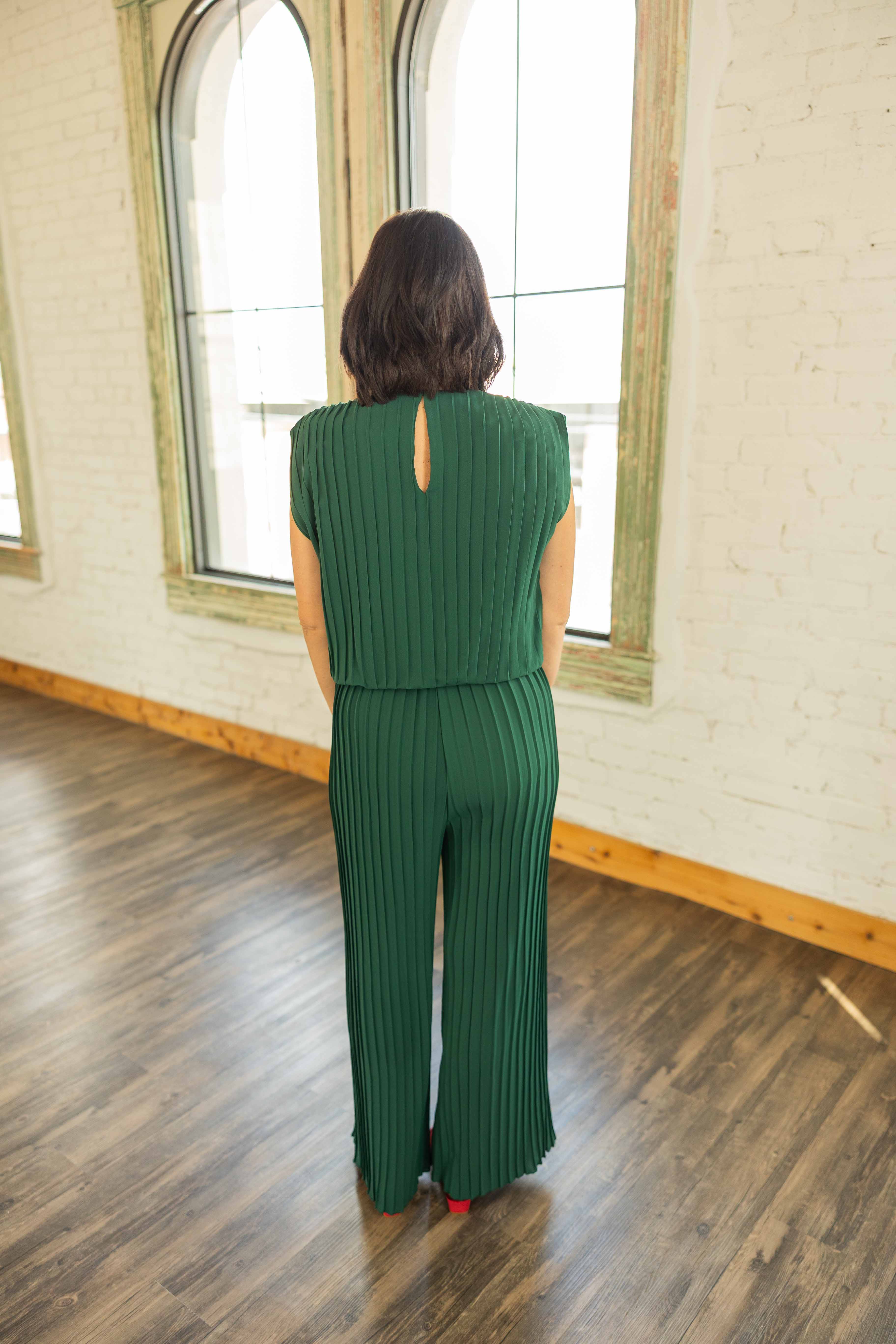 Holiday dressing made easy. This deep green pleated set looks elevated without feeling fussy. The top has a relaxed silhouette with an elastic waist that blouses just right. The matching wide leg pleated pant gives you comfort with major style points. Perfect for parties when you want to look fabulous and still breathe.