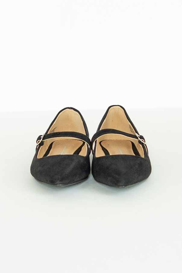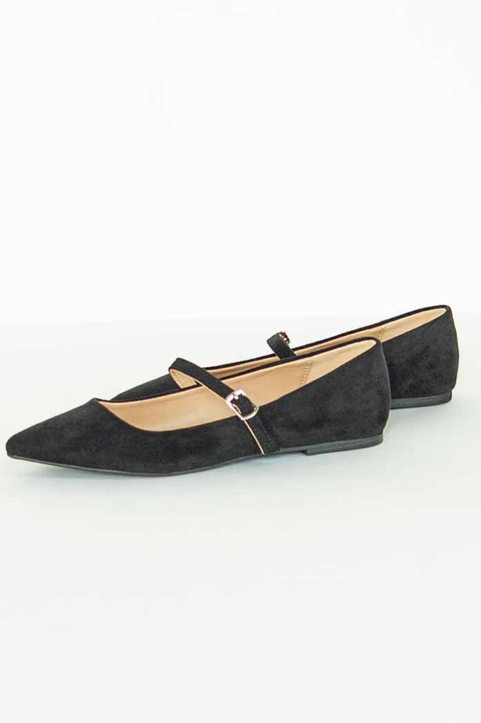 A workwear staple: AVIBA. This everyday flat is made of a lush, black vegan suede upper and features an adjustable buckle and Mary-Jane strap. With a pointed toe design and a cushioned insole, AVIBA is perfect for all day comfort.