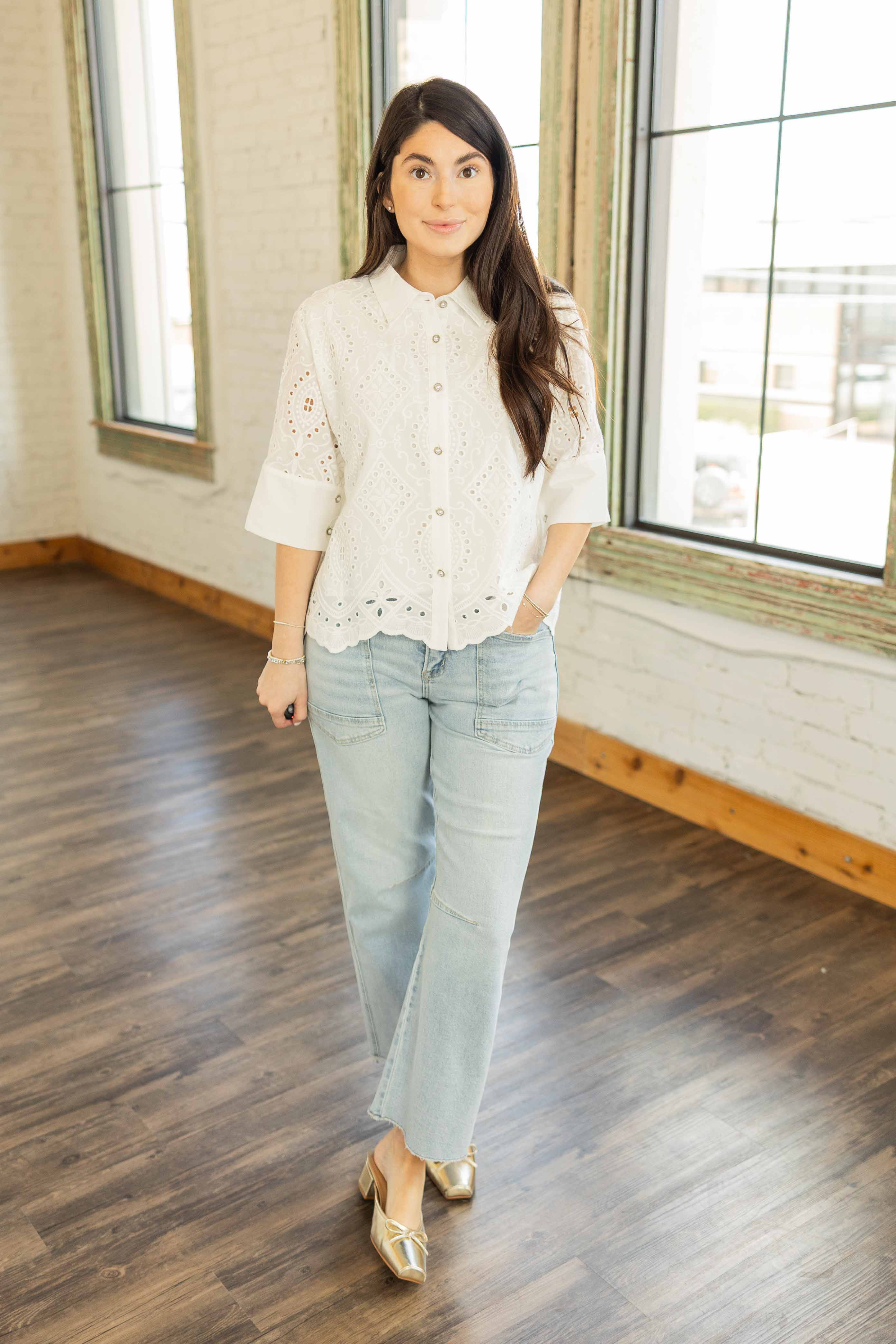 This light blue wash pairs with everything from crisp white tops to bright spring knits. Easy, relaxed, and just the right amount of cool.