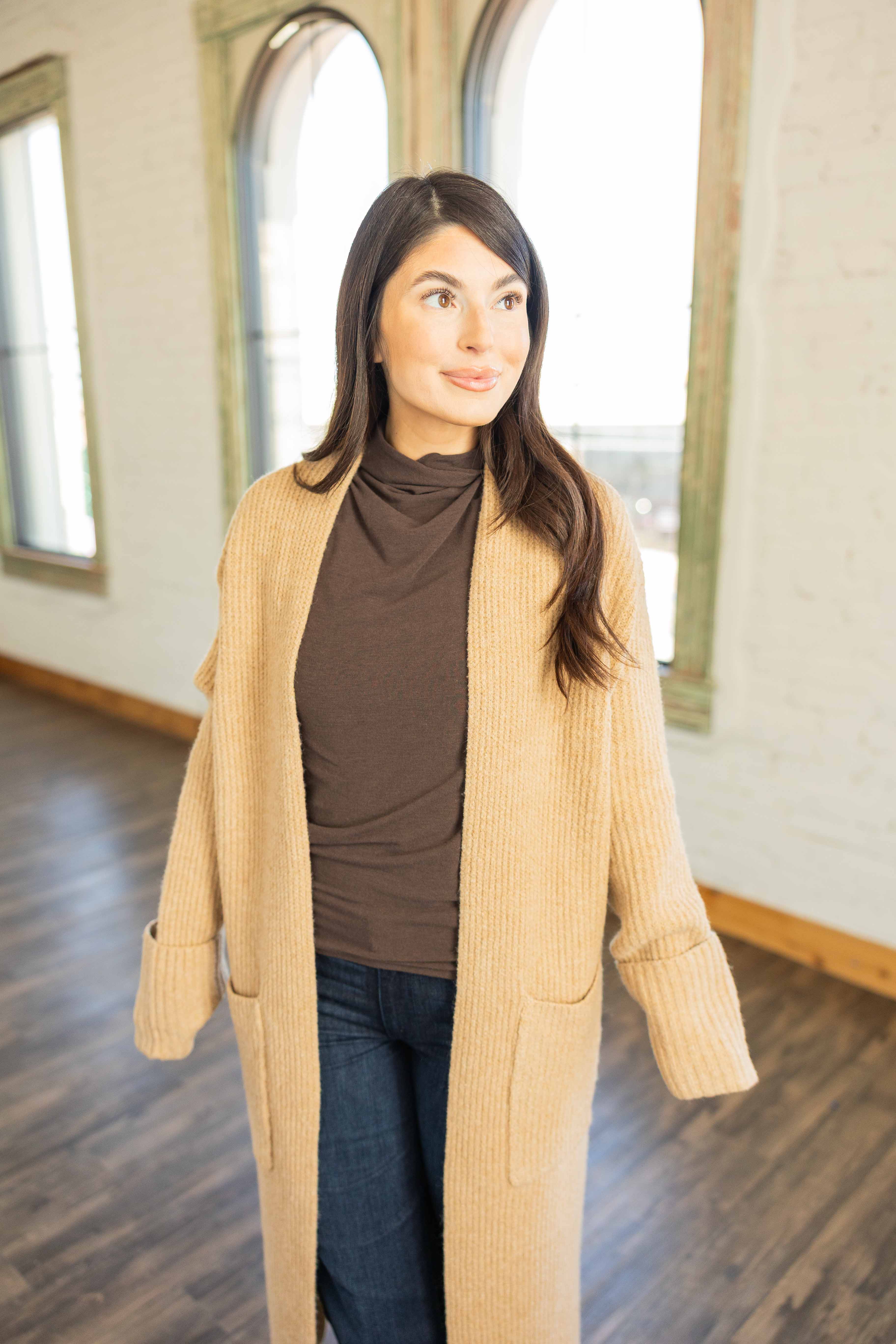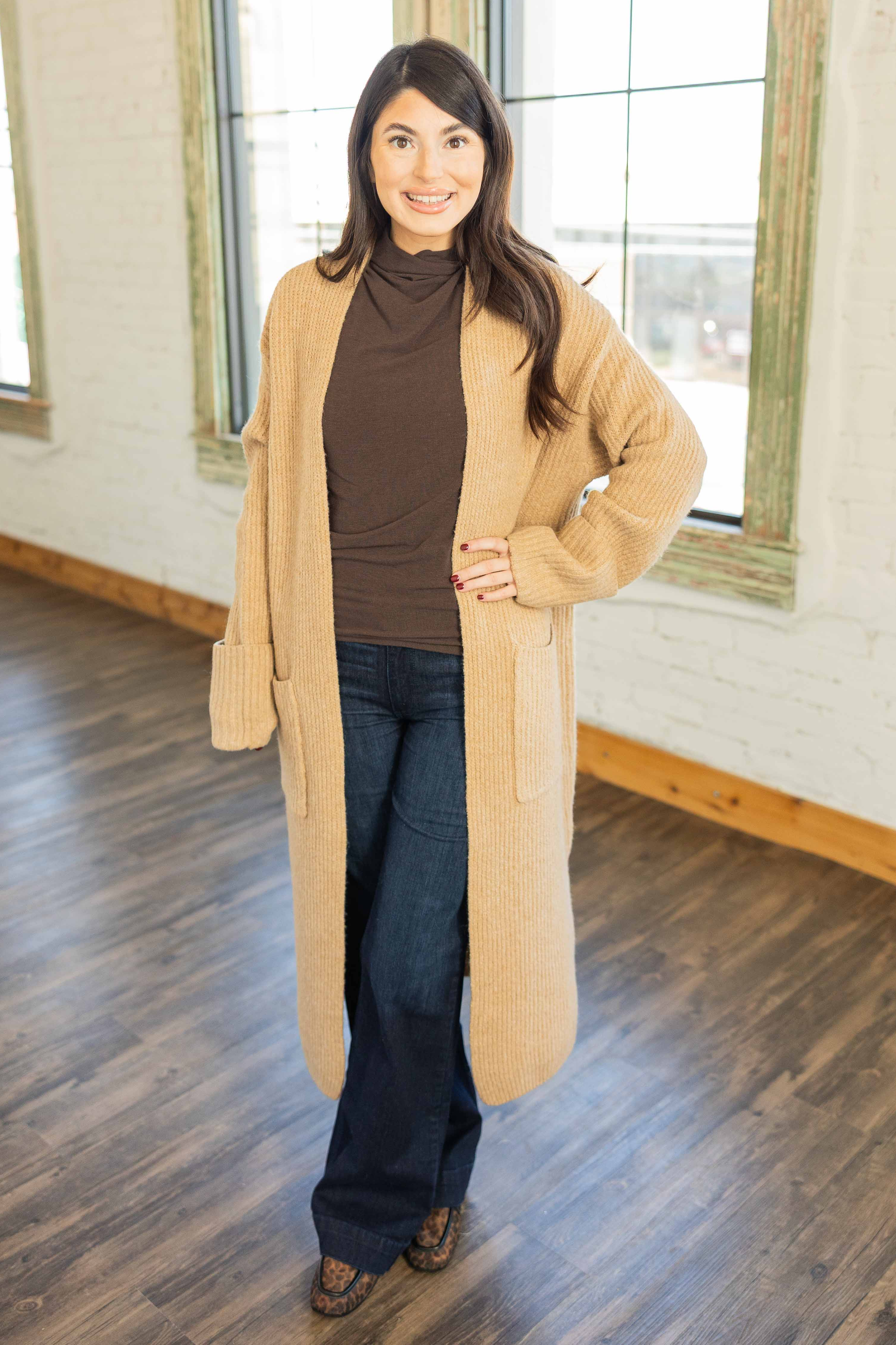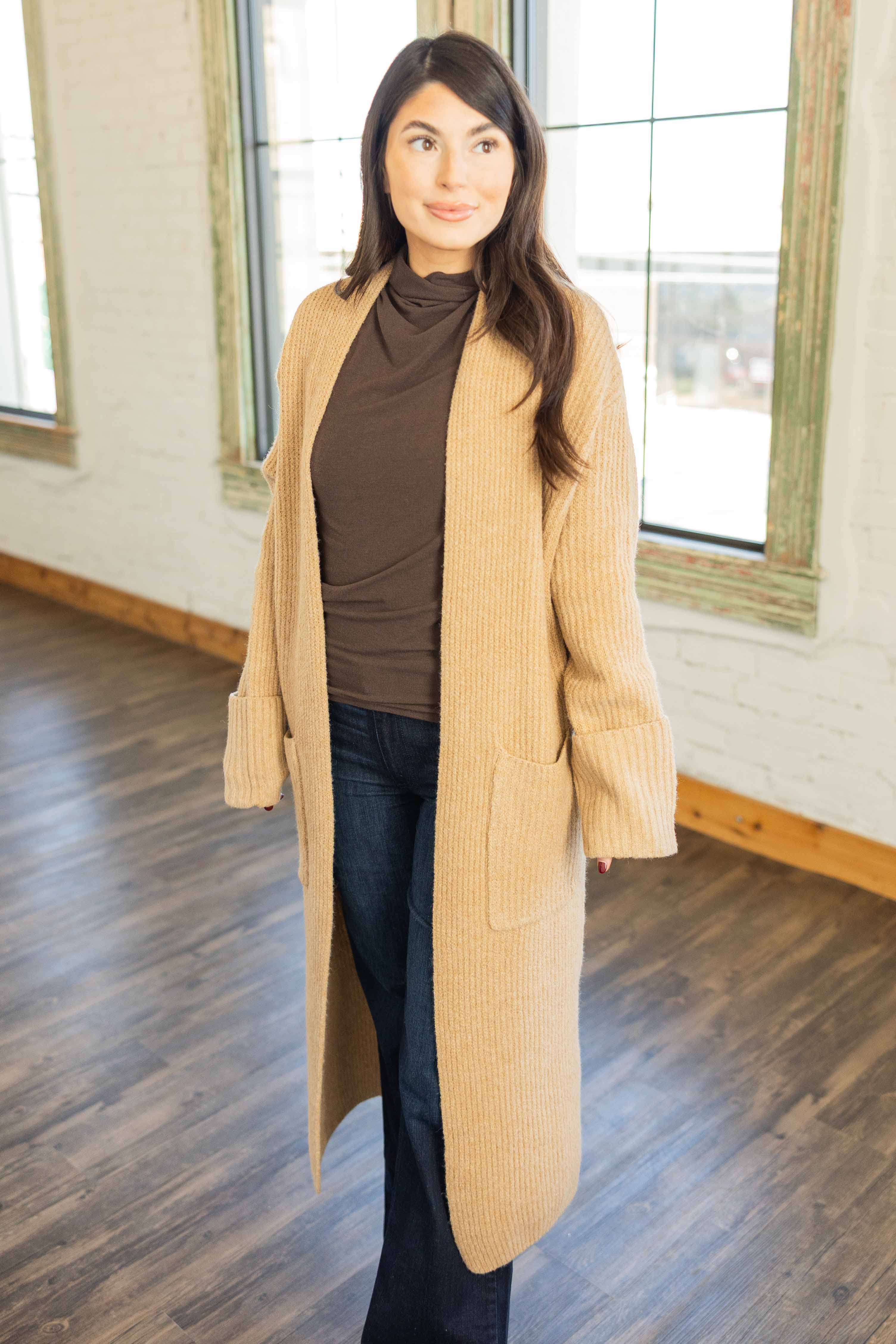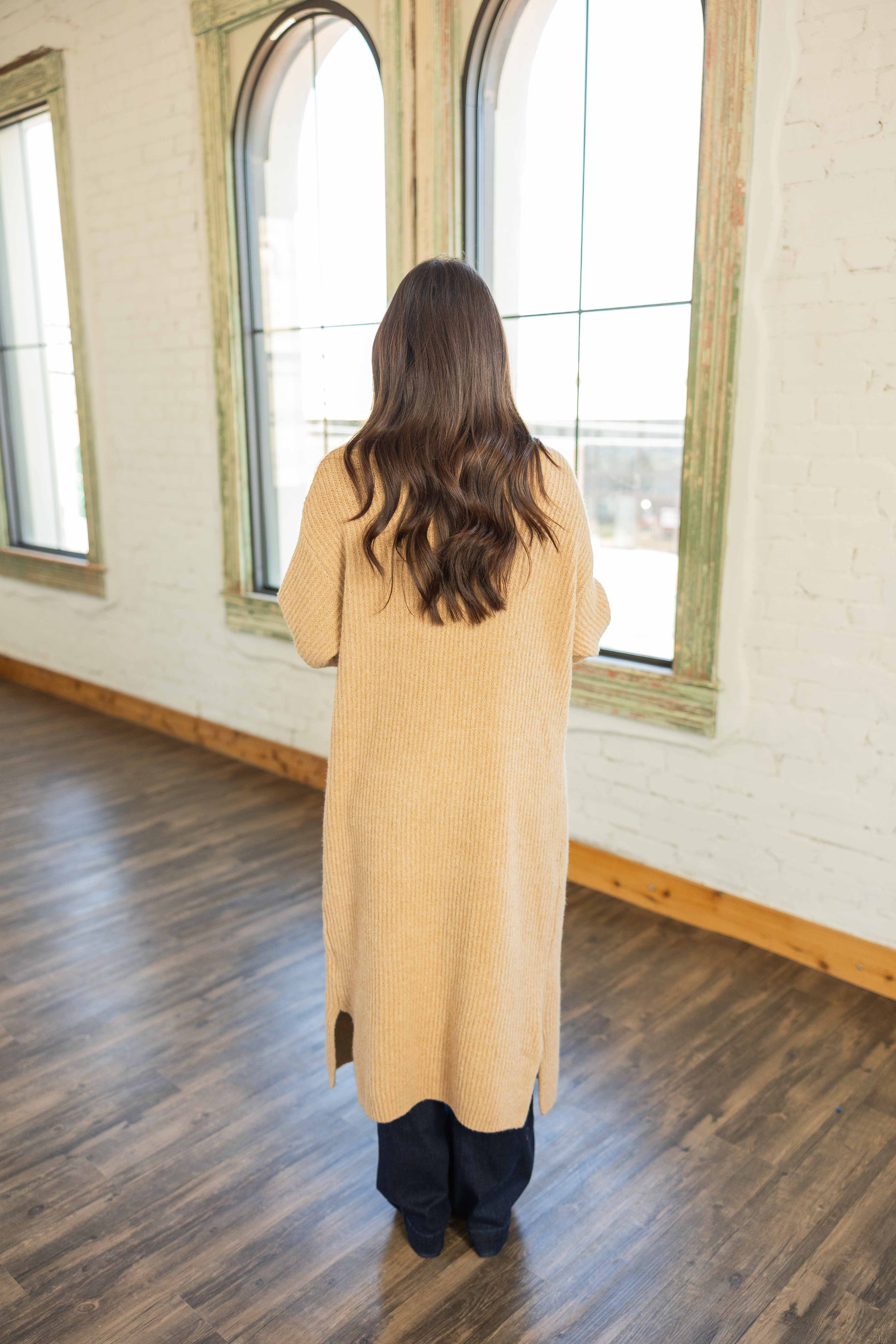 Your winter layer just got elevated. This soft ribbed duster adds warmth without bulk and instantly makes outfits feel intentional. The long sleeves with cuff detail and front pockets keep it practical. The camel tone plays well with denim, dresses, or leggings and it feels like wrapping up in your favorite blanket, but chic.