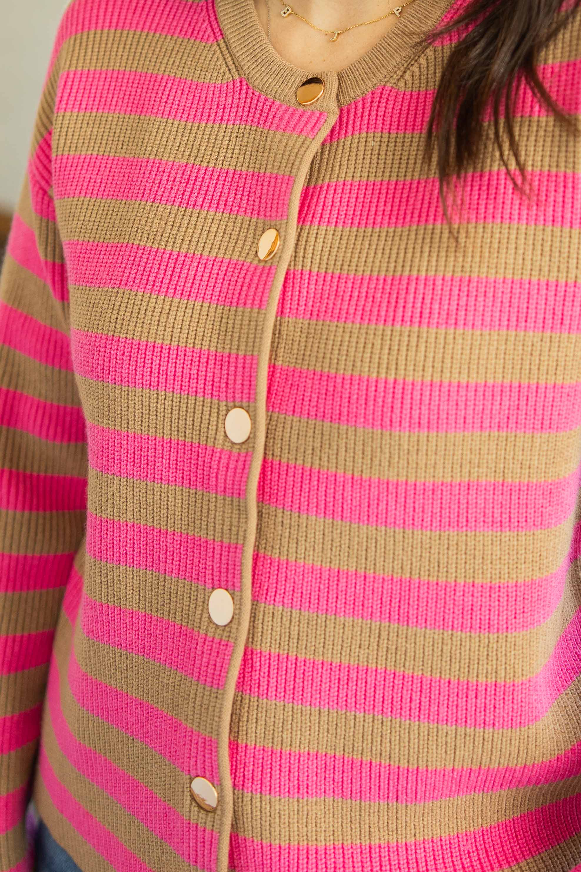 This cardigan is doing the most in the best way. Soft ribbed knit. Easy relaxed fit. The pink and tan stripes feel fun but still wearable, and the gold buttons add just enough polish. It works buttoned up as a top or layered open over a basic tee. Cute with denim. Easy with trousers. Zero effort styling.