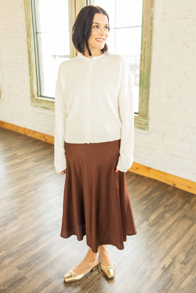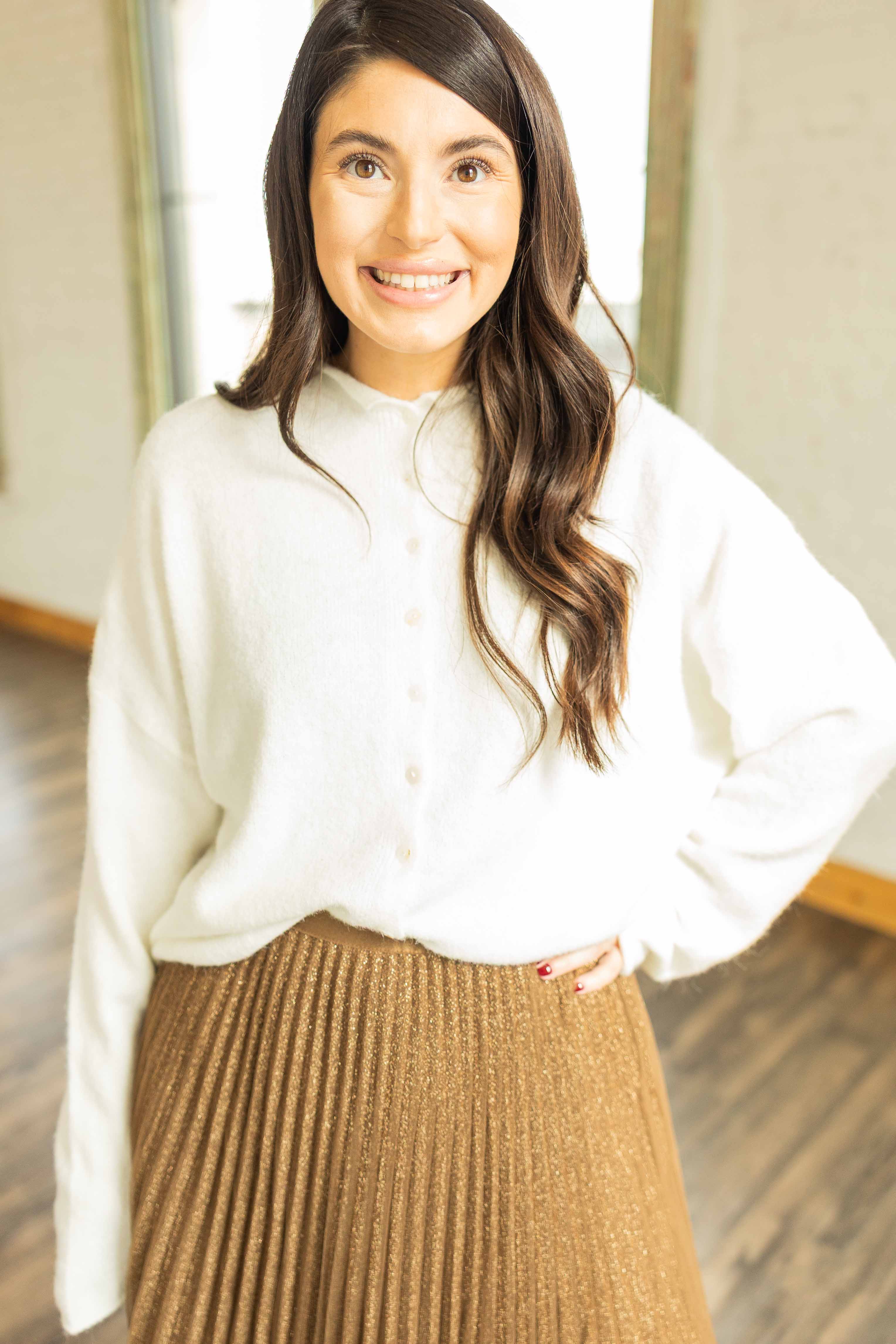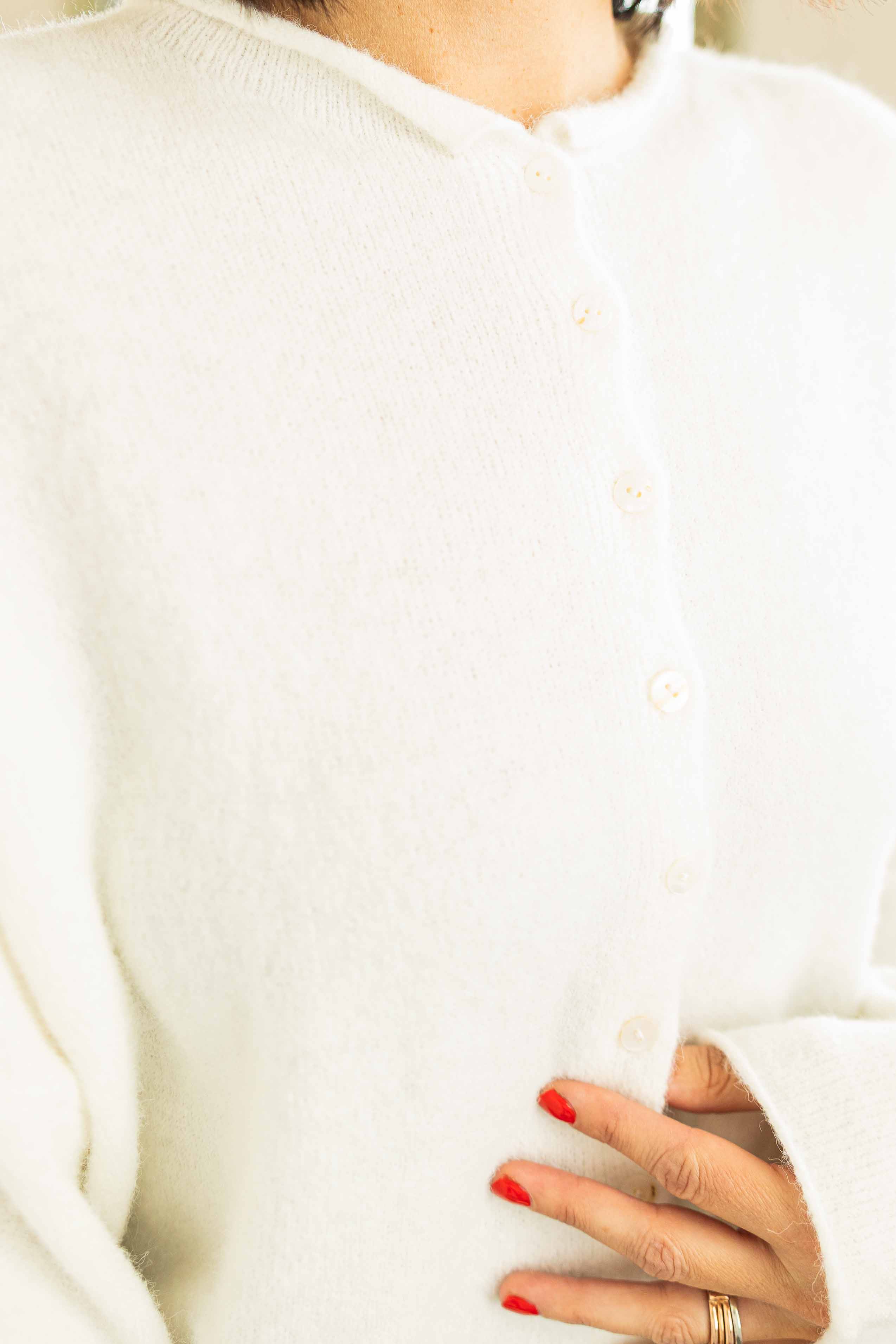 Soft, minimal, and cozy. This white cardigan is the one you reach for when you want simple done right. Relaxed fit with drop shoulders that feel effortless. Functional buttons so you can style it open or closed. Rolled edge trim adds a sweet little detail without trying too hard. Lightweight but warm enough for chilly days.