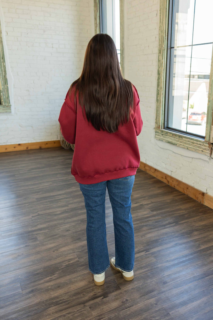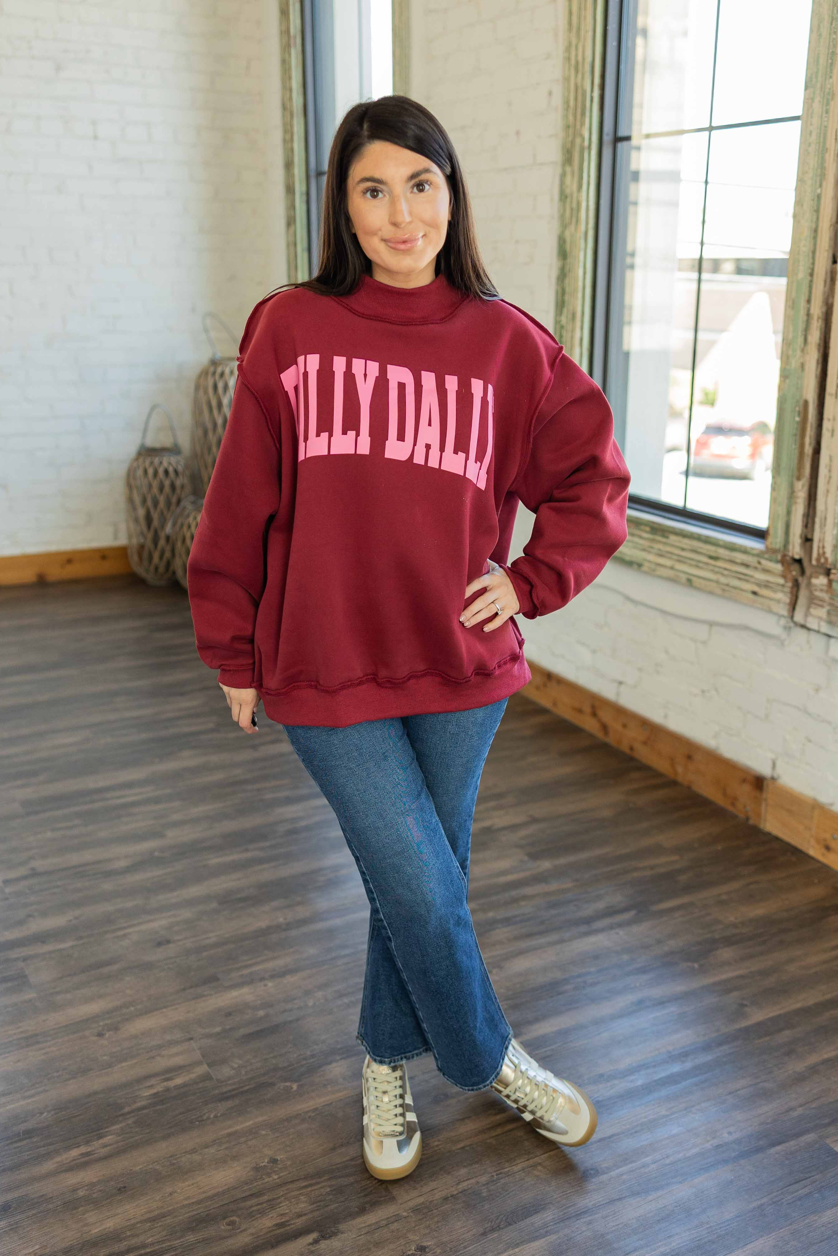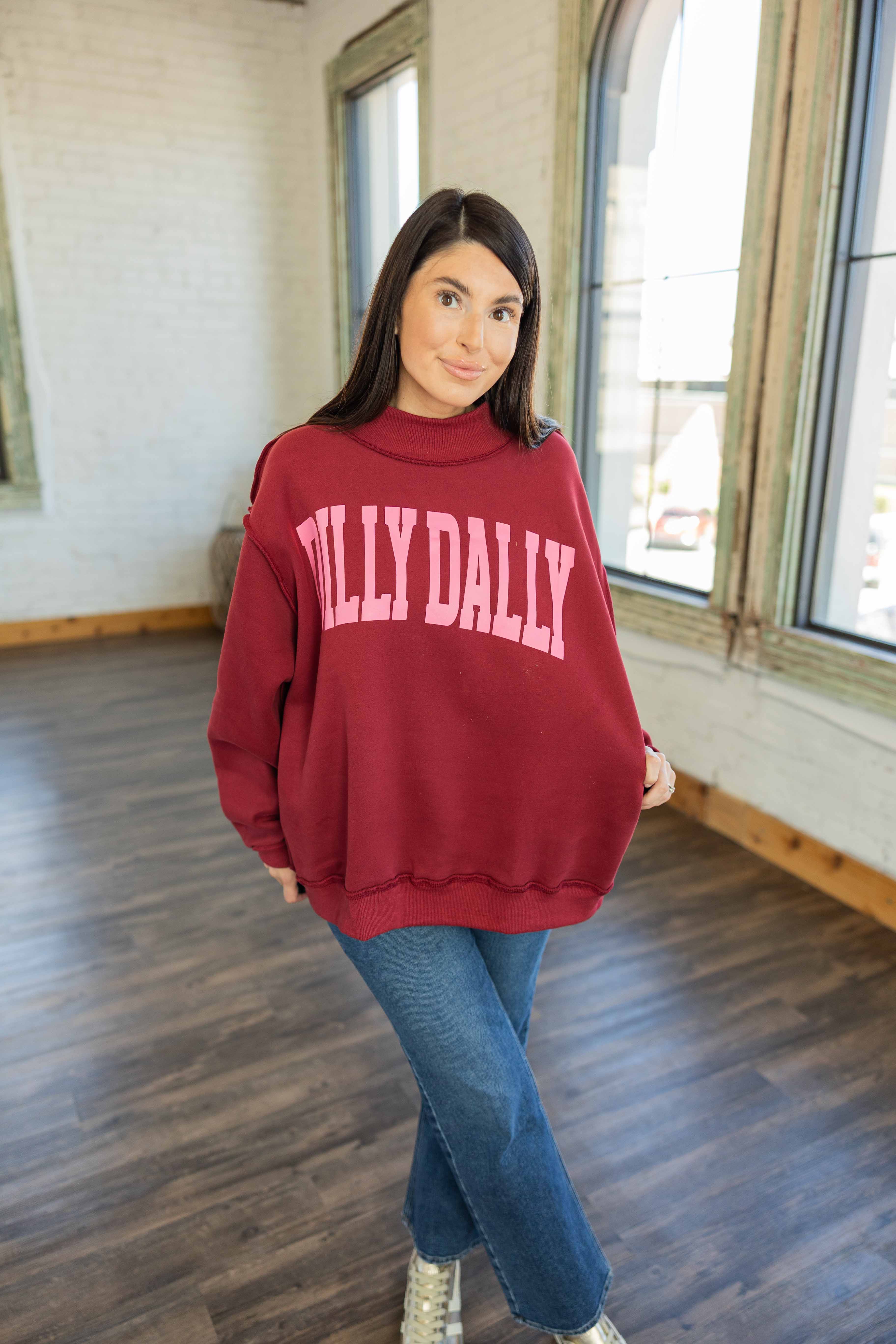 For the days when you’re doing everything or absolutely nothing. The Dilly Dally Crewneck is that oversized, perfectly slouchy sweatshirt that gives main-character-late-for-brunch energy. Made from the softest brushed fabric, it’s roomy, cozy, and ridiculously comfortable. The pink varsity lettering pops against the deep red, keeping it cute while you keep it casual.