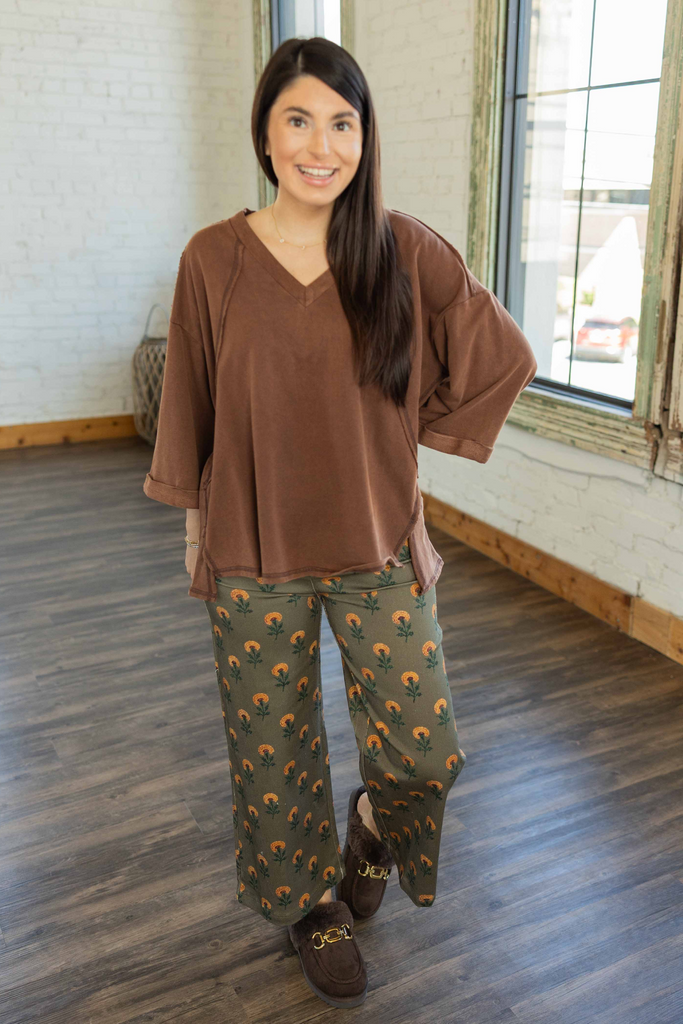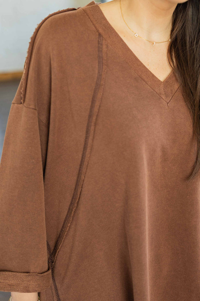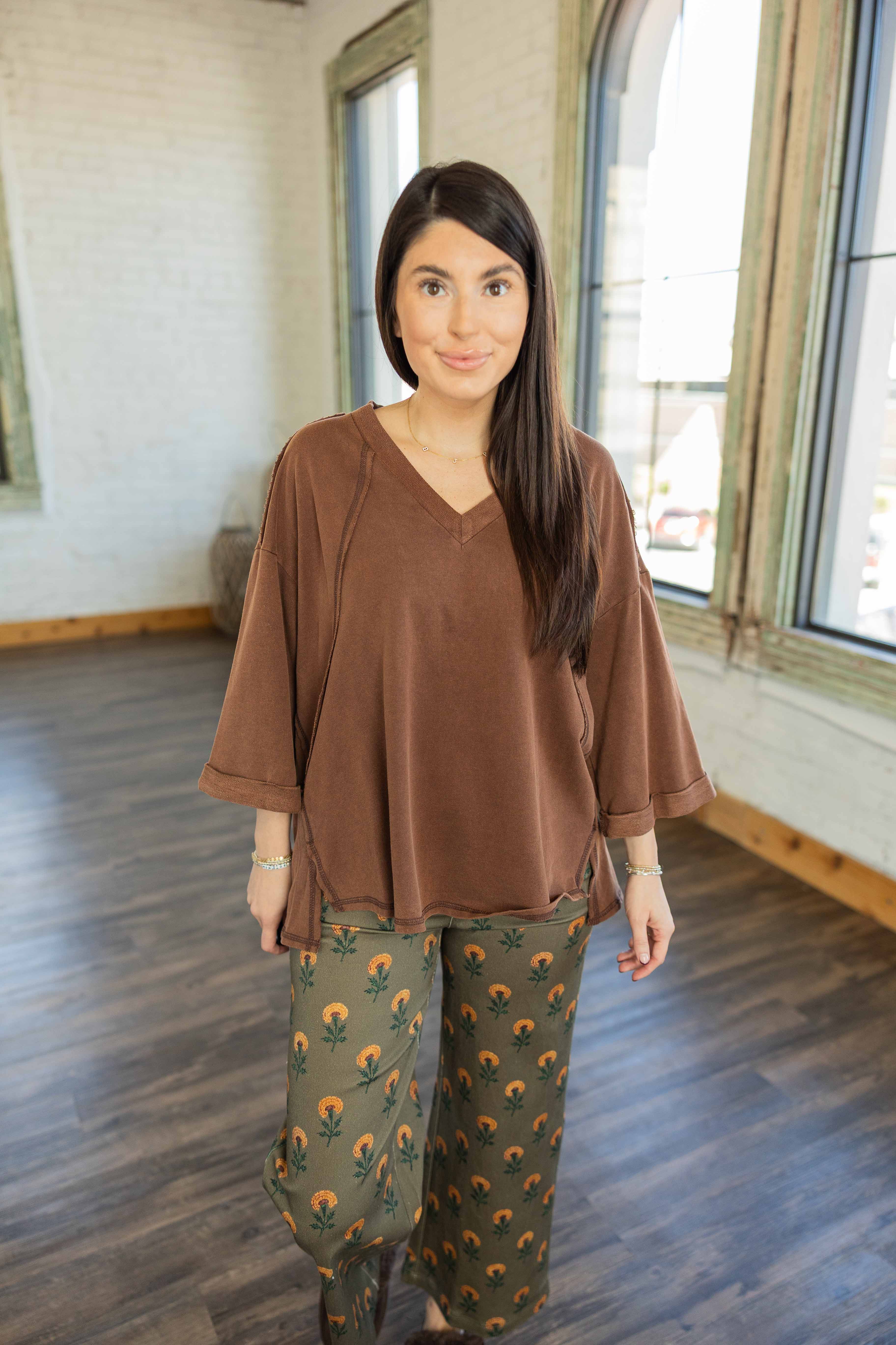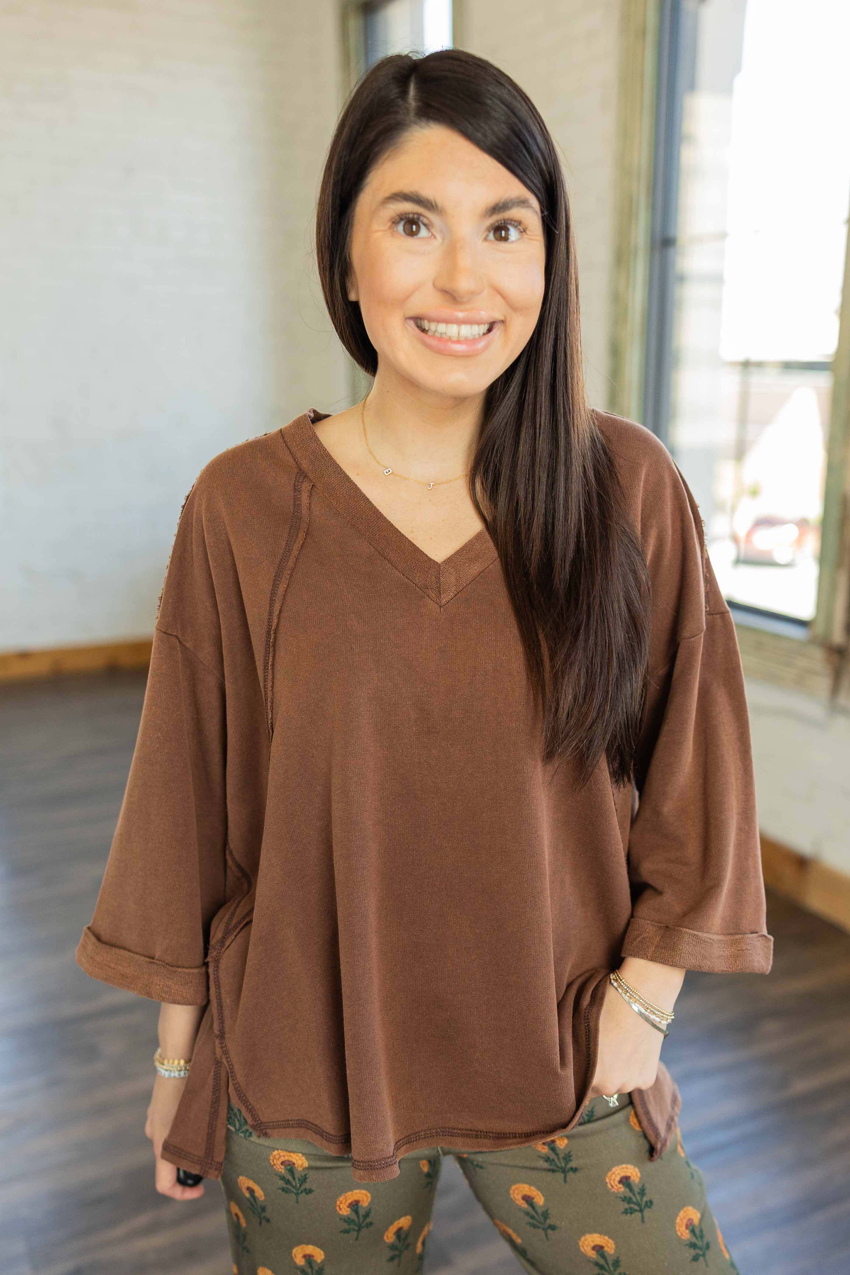 Comfy, lived-in, and totally effortless. The Millie Top is that easy throw-on piece you’ll reach for every time. Its soft cotton fabric and relaxed silhouette make it perfect for layering or lounging. The raw edge trim and rolled cuffs give it that “cool without trying” vibe, and the warm cocoa brown color keeps it perfectly in season.