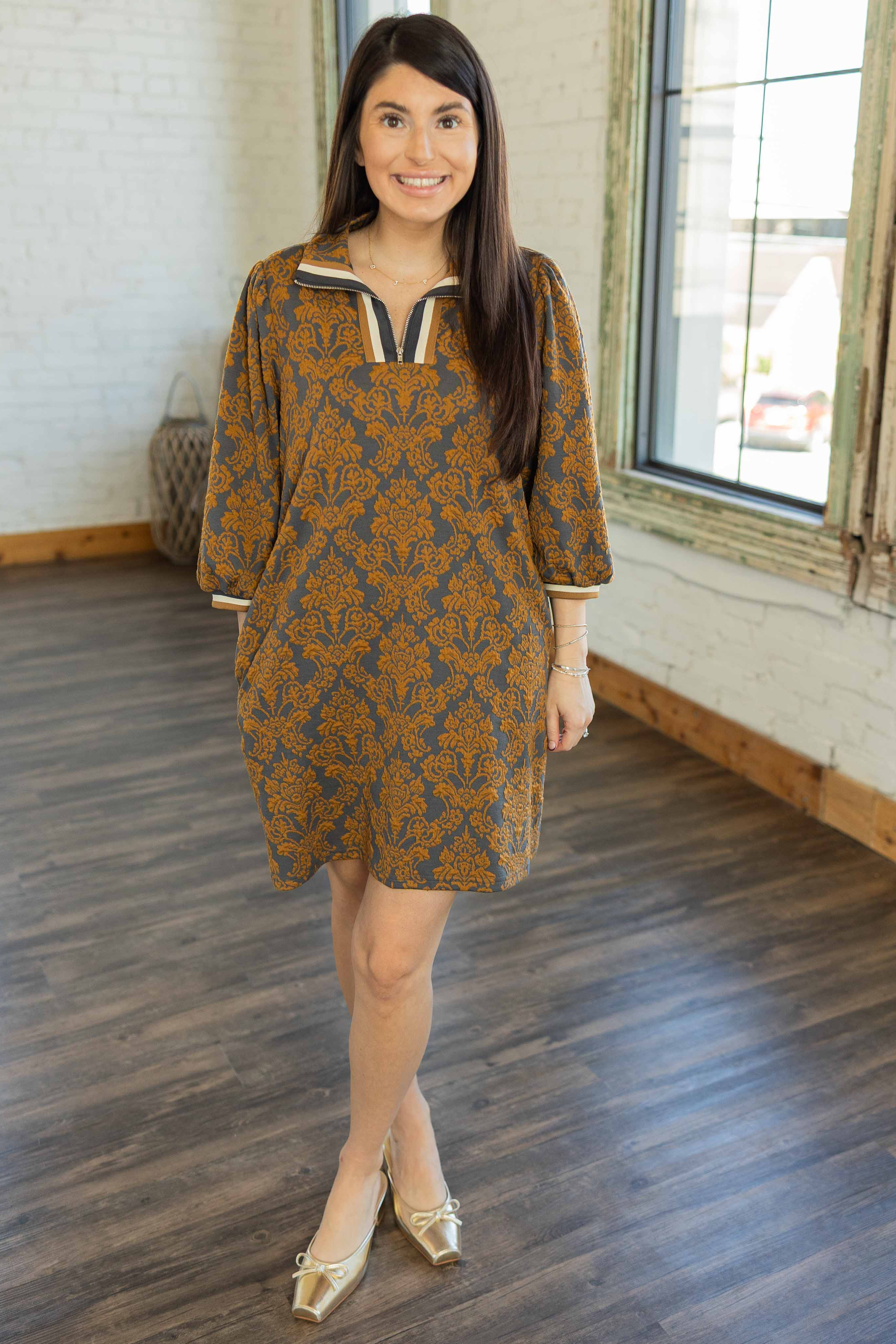 The Raven Dress is giving modern boho meets cozy chic. With its rich mustard and charcoal textured pattern, this easy shift dress is one of those throw-on-and-go pieces that still looks put together. The zip-front neckline and rib trim add just the right amount of sporty contrast, while the side pockets keep it practical.