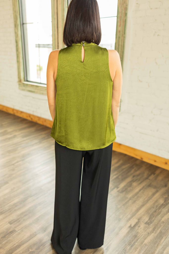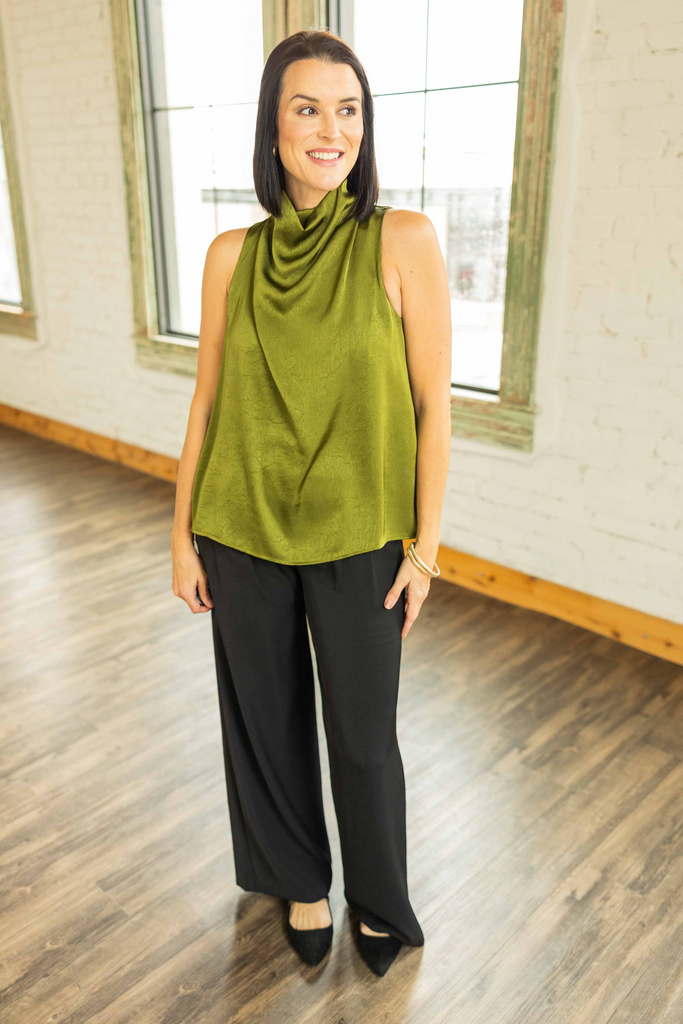 A chic draped neckline gives this sleeveless top an elegant shape while the chartreuse green satin adds a stylish pop. The flowy cut skims without clinging, keeping you cool when the Texas weather refuses to cooperate. Dress it up with trousers or pair with denim for an easy elevated look. Kandace is wearing a small and the fit runs true to size.