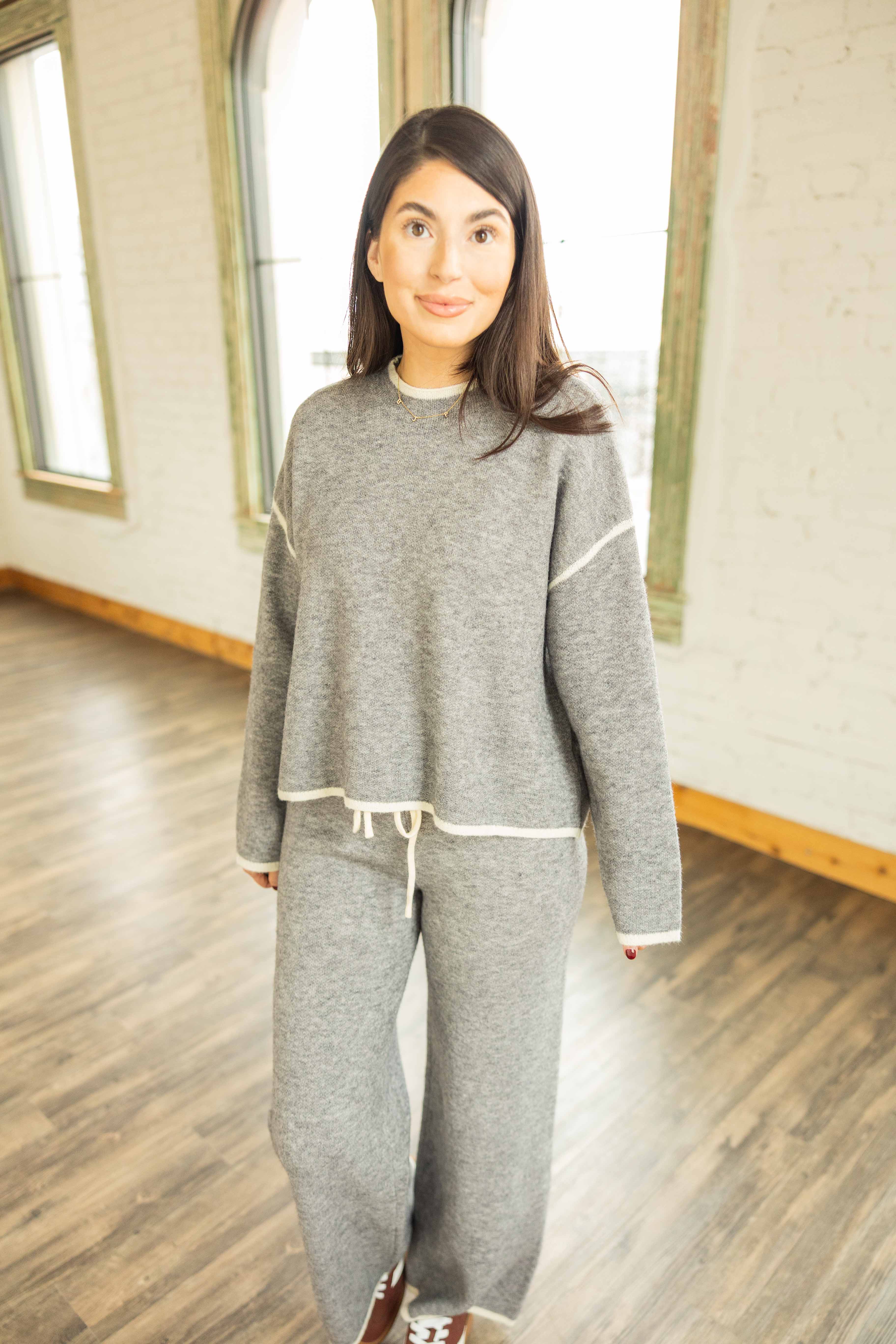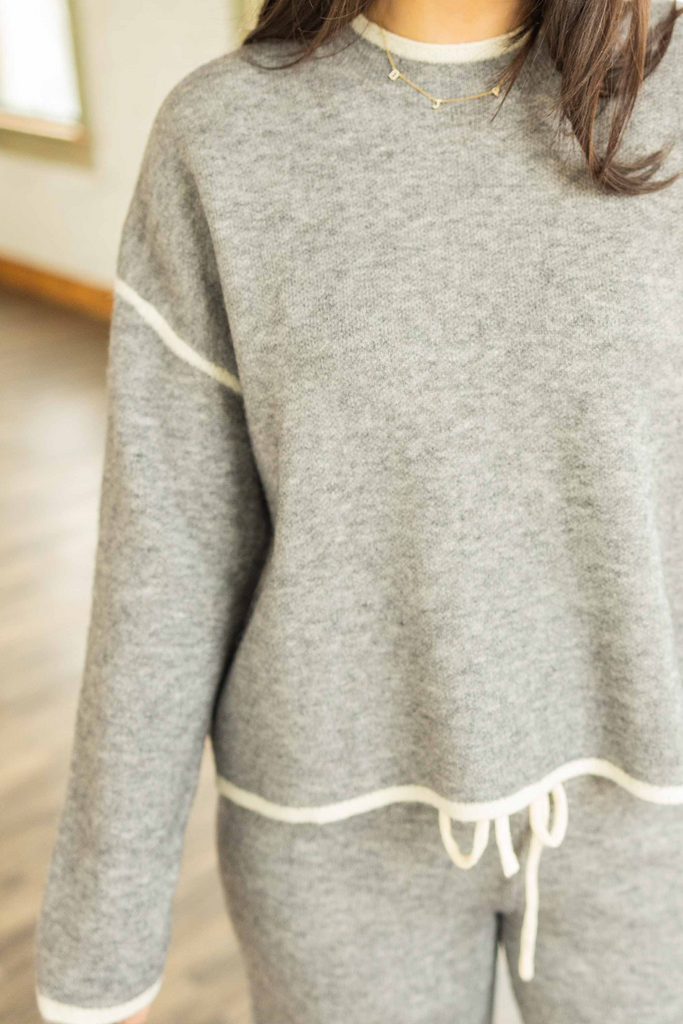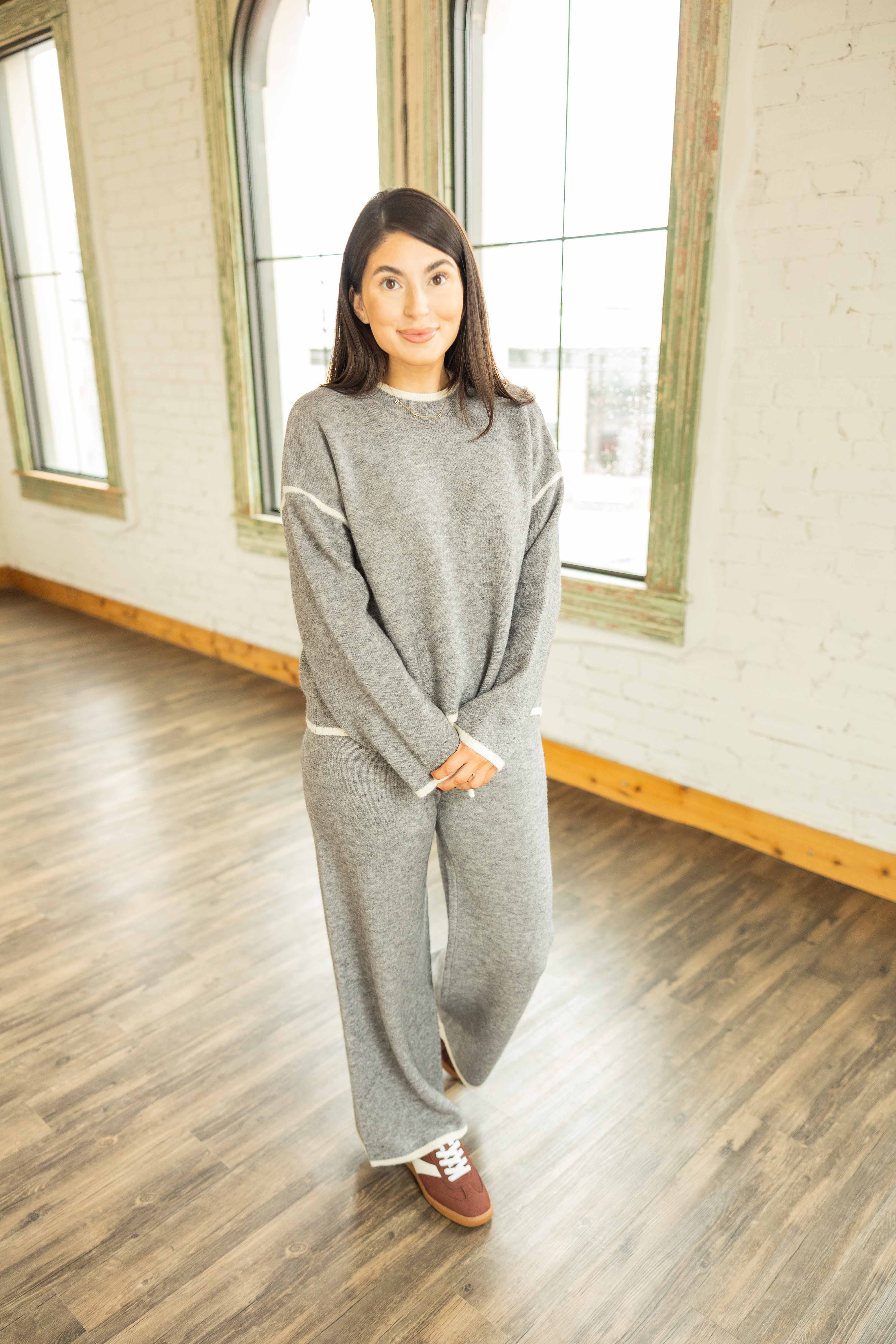 Meet your new cozy sidekick. This soft heather grey sweater gives you effortless style without trying. The relaxed fit, drop shoulder, and subtle ecru trim make it feel elevated and easy. Pair it with the matching Heather Sweater Wide Leg Pants when you want to look like you have your life together while actually living in a blanket. Texas winter friendly and perfect for real life.