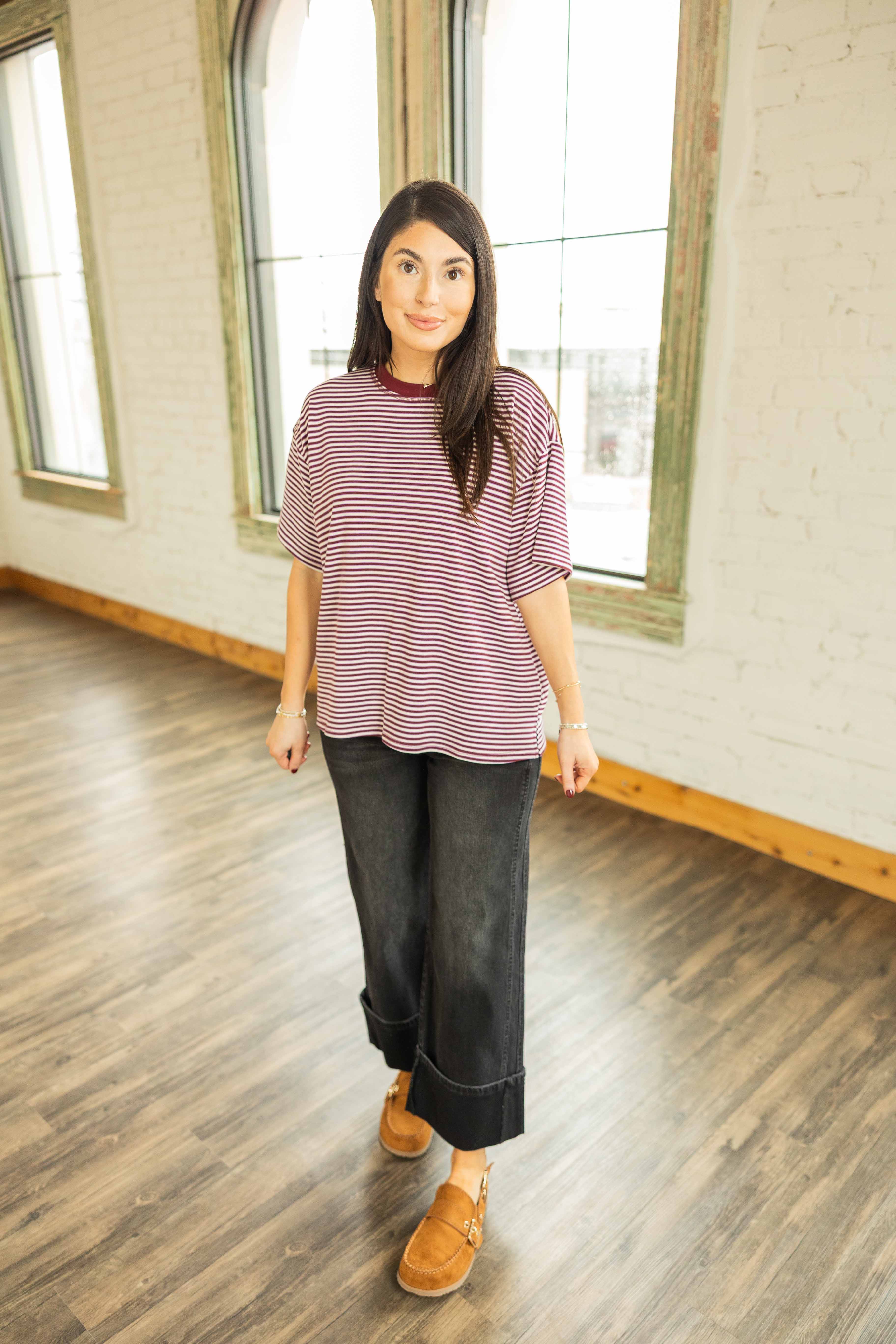 These dark wash cuffed jeans bring modern shape with everyday comfort. The baggy wide leg silhouette feels effortless and the single cuff hem gives you a styled finish without trying. Comfort stretch makes them an easy all day wear. They pair great with sweaters, fitted tops, and fun jackets.
