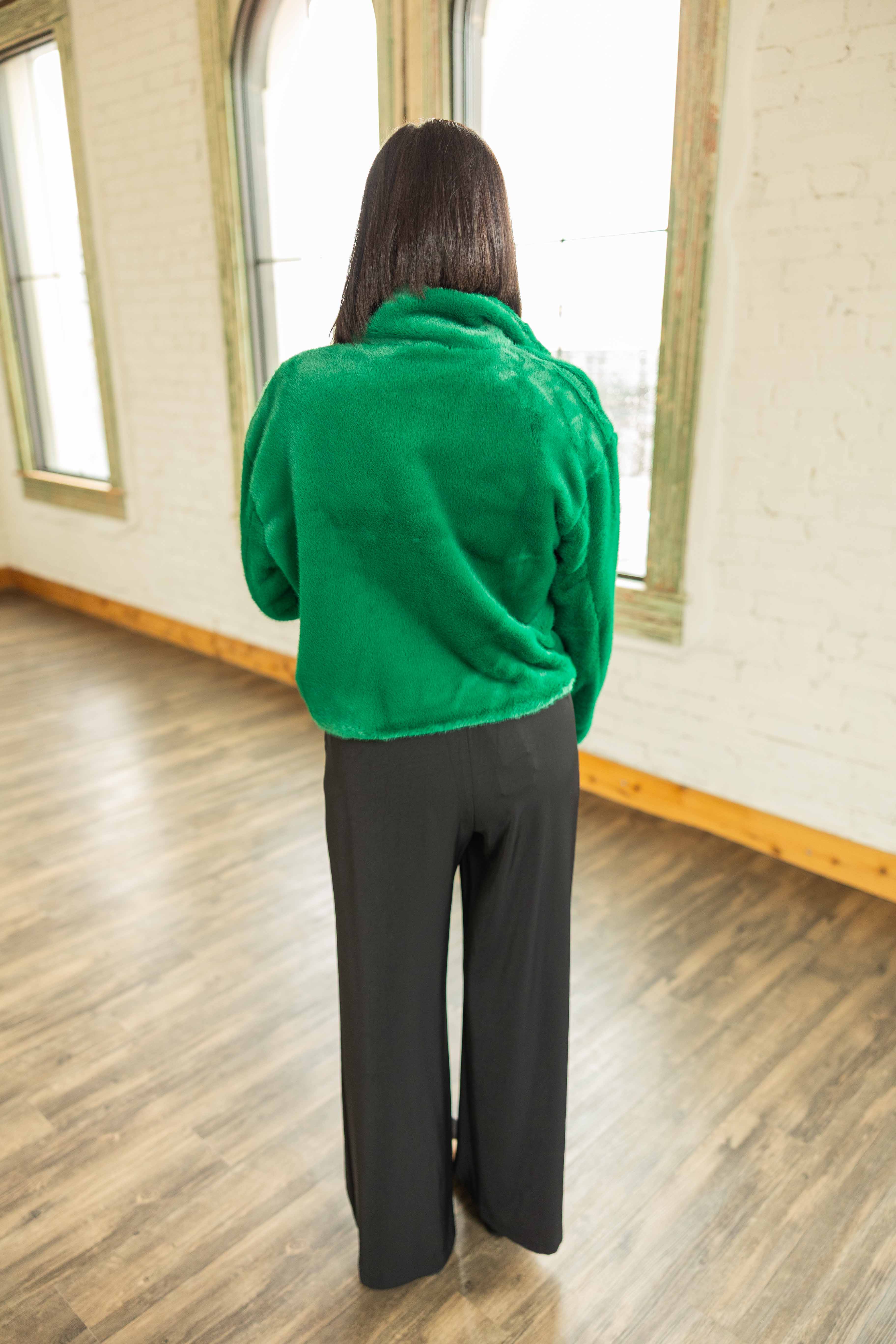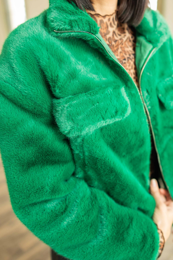Cozy meets cool girl. This rich green faux fur bomber gives you instant texture and a fun pop of color. It feels soft and plush without being heavy. The relaxed cut layers easily over your basics and the zipper front keeps it casual. The faux front pockets add style while the side pockets actually hold your stuff.
