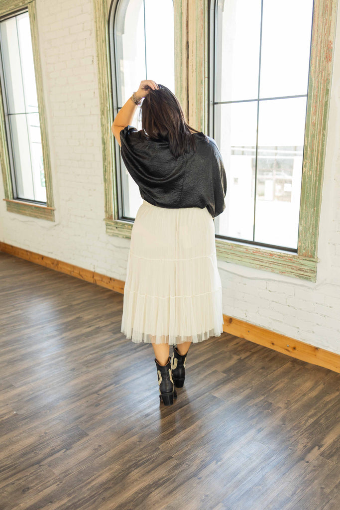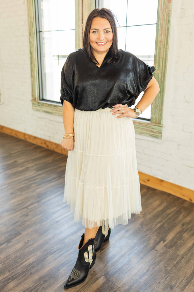 A sleek black metallic finish gives this top a subtle shine without screaming festive sweater party. The flowy dolman sleeves and relaxed silhouette make it easy to wear and flattering on everyone. Lightweight and non sheer, it keeps you cool indoors while still feeling elevated. Lainey is in a XL and the fit is flowy and roomy.