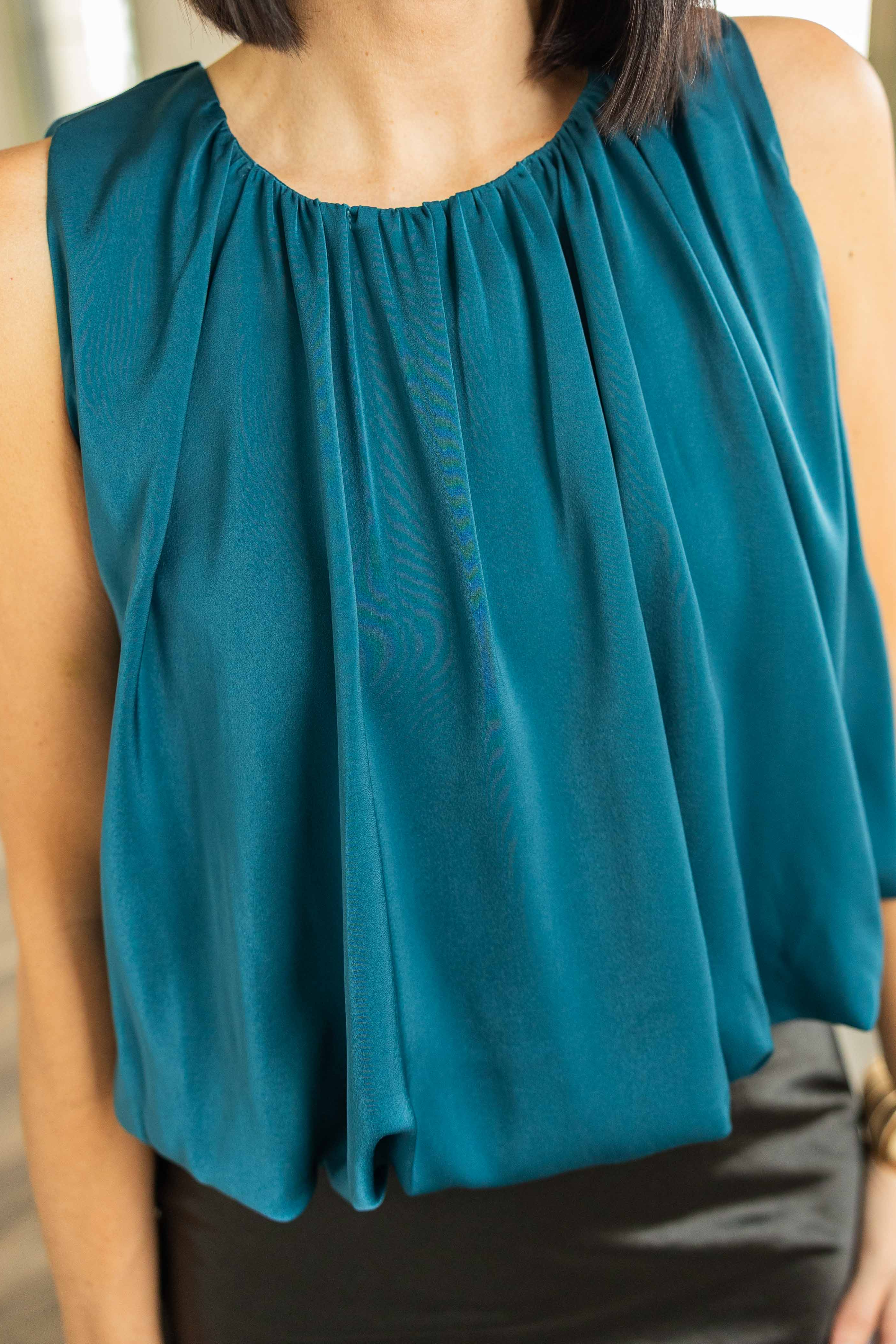 Rich teal satin gives this sleeveless top a polished look while the bubble hem creates a tucked effect without the effort. The cropped length balances beautifully with skirts or high rise denim. This satin finish feels elevated yet easy, perfect for Texas winters that laugh at coats. Kandace is wearing a small and the fit runs true to size.