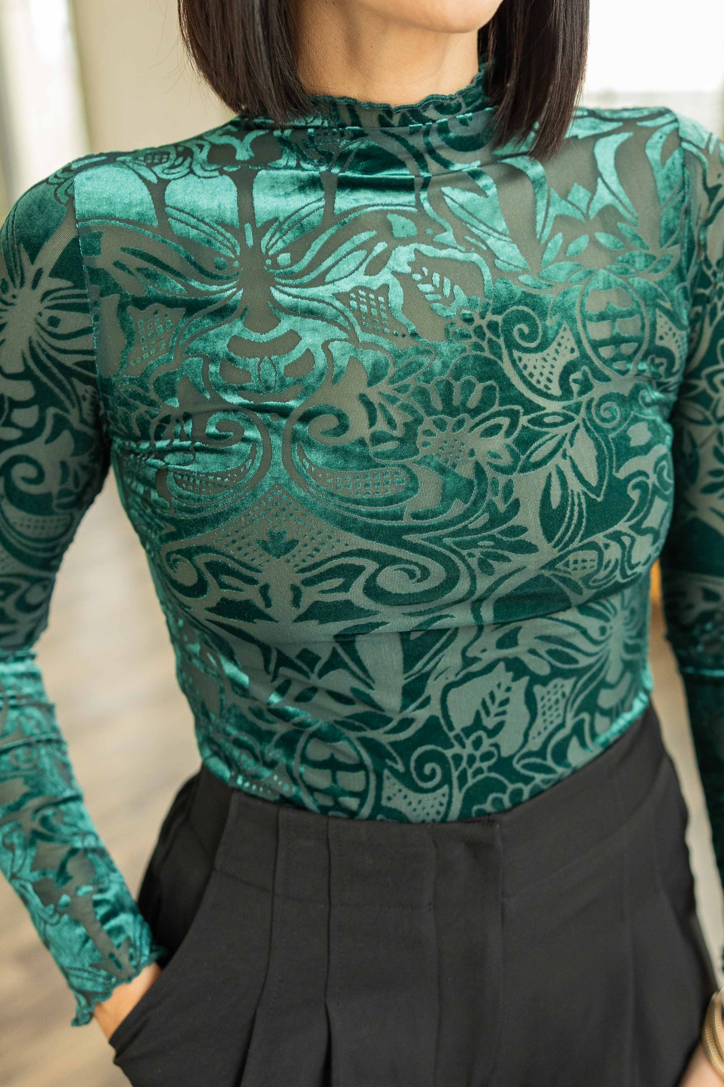 PHOEBE GREEN VELVET PATTERN MESH LONG SLEEVE FITTED TOP
