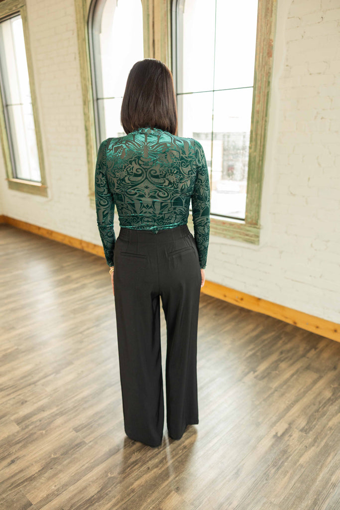 A rich emerald twist on a closet favorite. This fitted mesh top has a velvet burnout pattern that adds depth and shine without feeling heavy. Lots of stretch keeps it comfortable and sleek while the high crew neck and lettuce edges give it a polished finish. Slightly sheer for a luxe layered look whether you wear it solo or under a blazer. Kandace is wearing a small and the fit runs true to size.