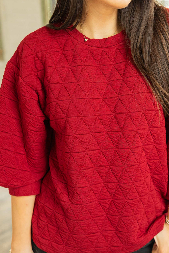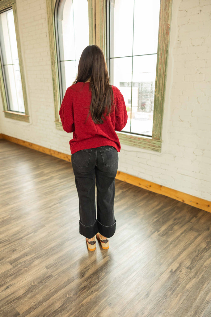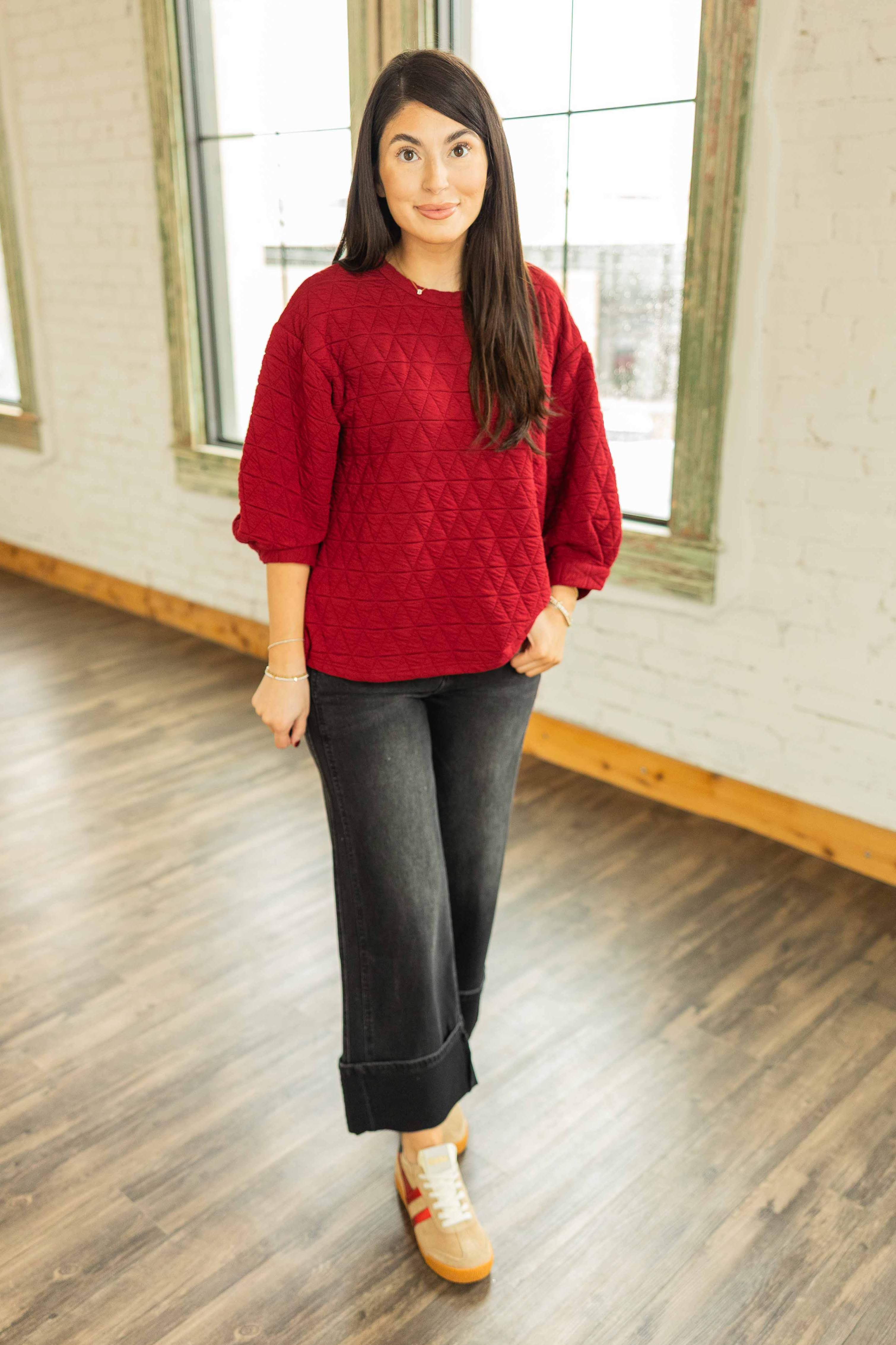 This rich cranberry quilted pullover brings cozy texture without the bulk. The relaxed fit and drop shoulder sleeve make it easy to style while the button cuff detail adds a little charm. Lightweight but warm, it is perfect for chilly mornings or indoor holiday events. Kayla is in a small and the fit is relaxed.