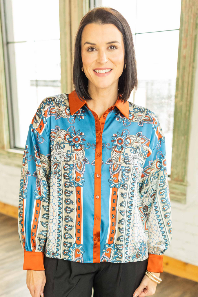 CYNTHIA SCARF PRINT LONG SLEEVE BUTTON DOWN TOP