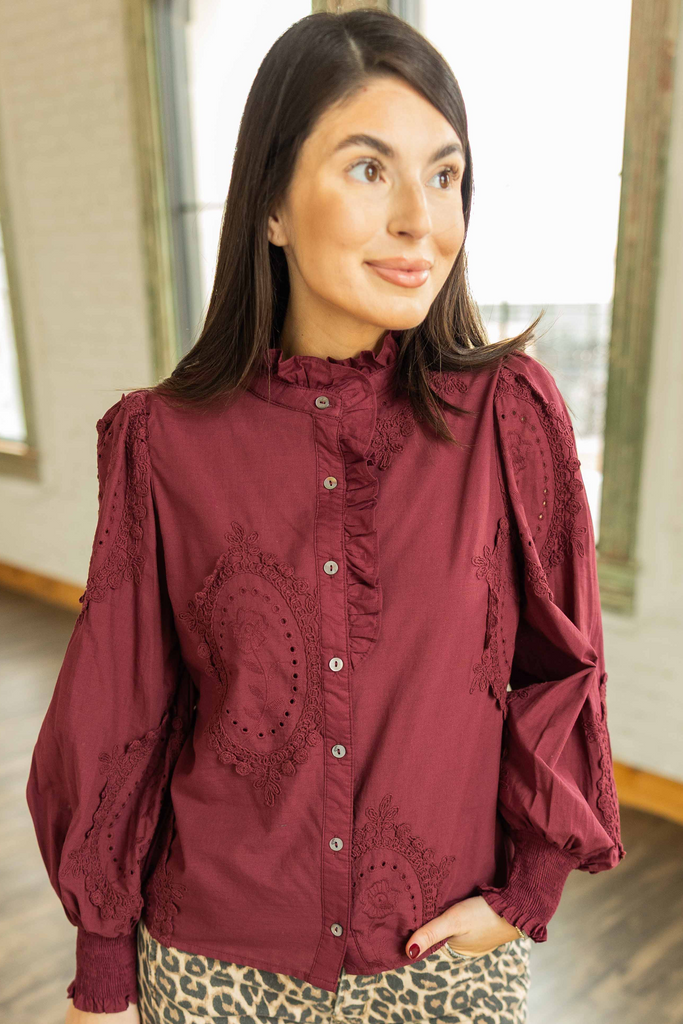 MAREN SOLID EMBROIDERED EYELET BUTTON DOWN TOP