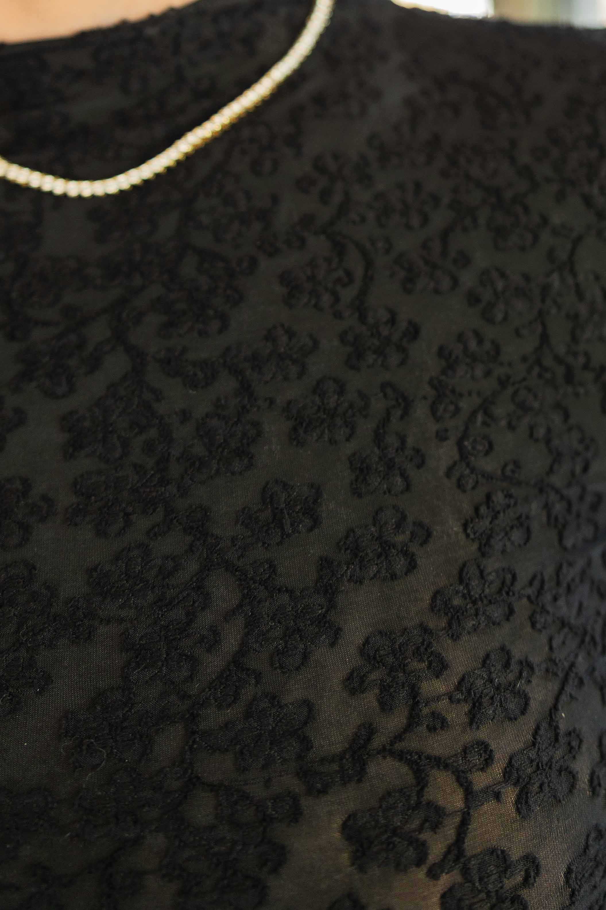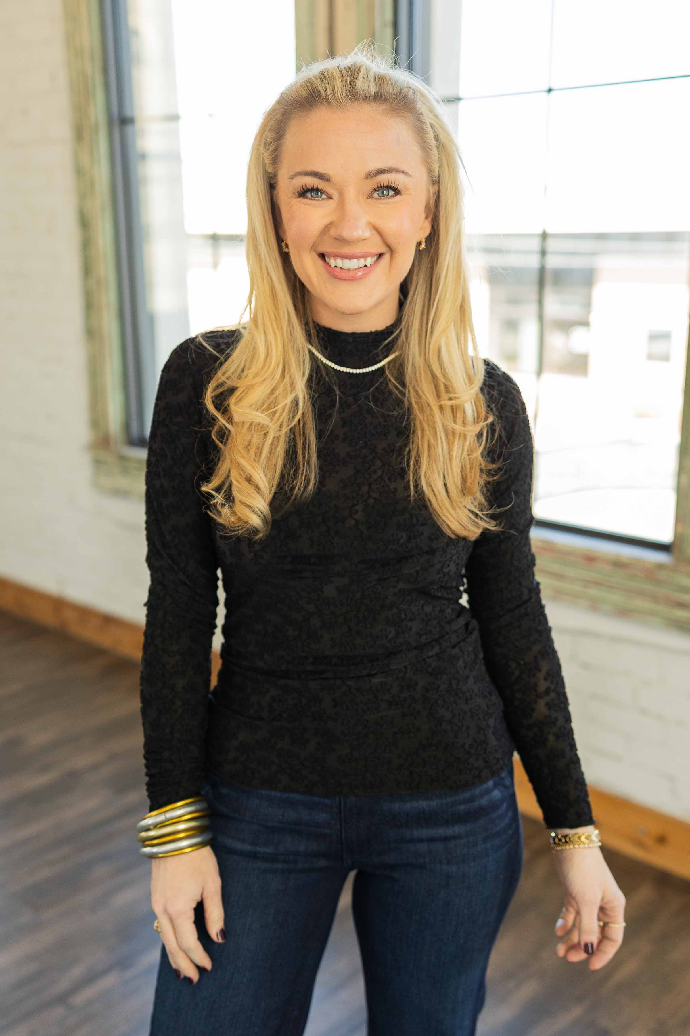 Chic, sleek, and a little sultry. This black textured mesh mock neck top fits snug and elevates any look with its subtle pattern and fitted silhouette. Lightweight and stretchy, it layers beautifully or stands strong on its own. Holly and Kayla are both wearing a small.