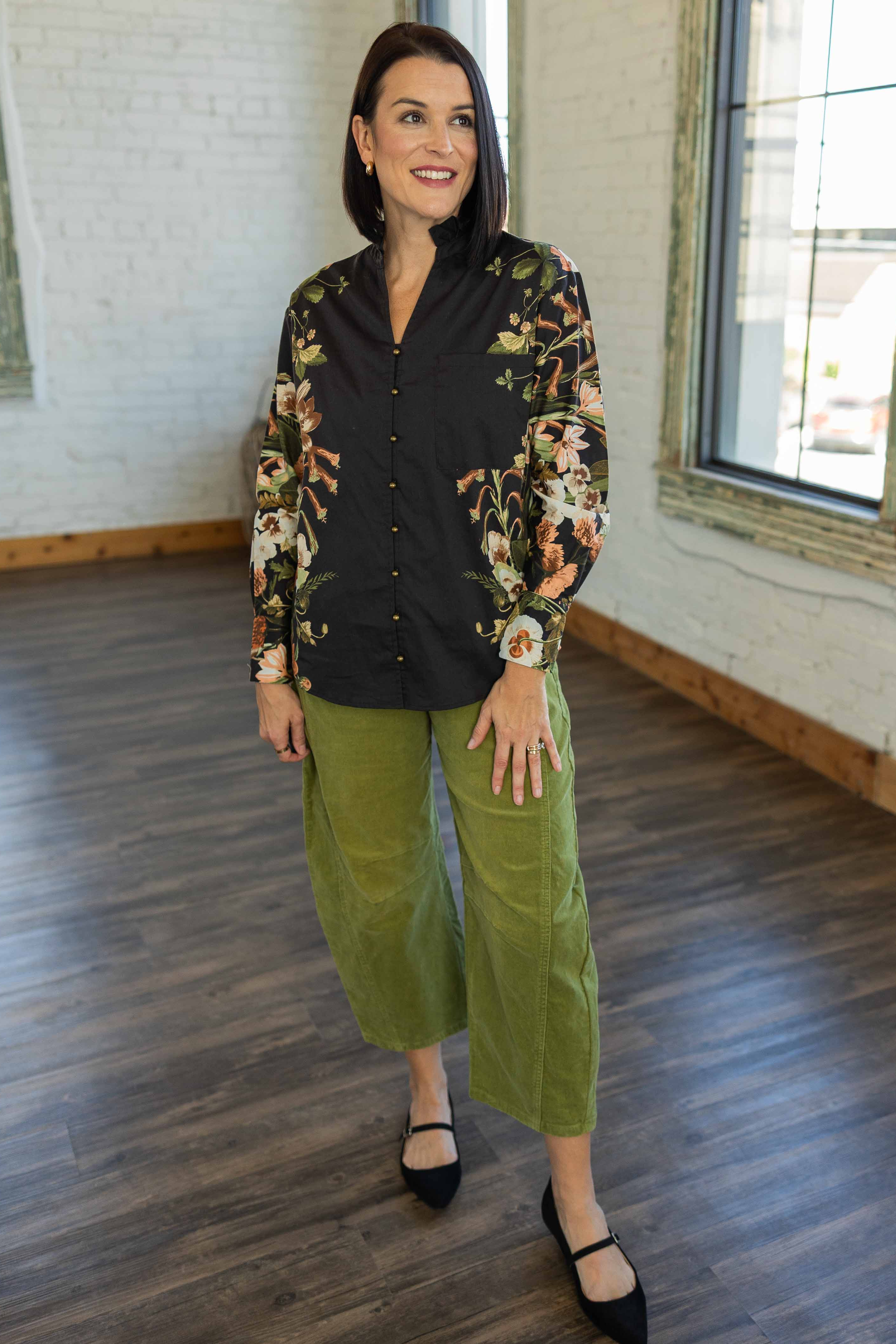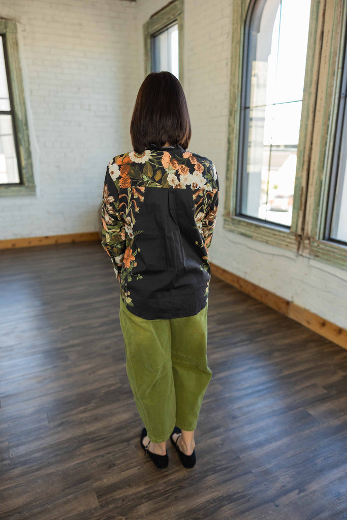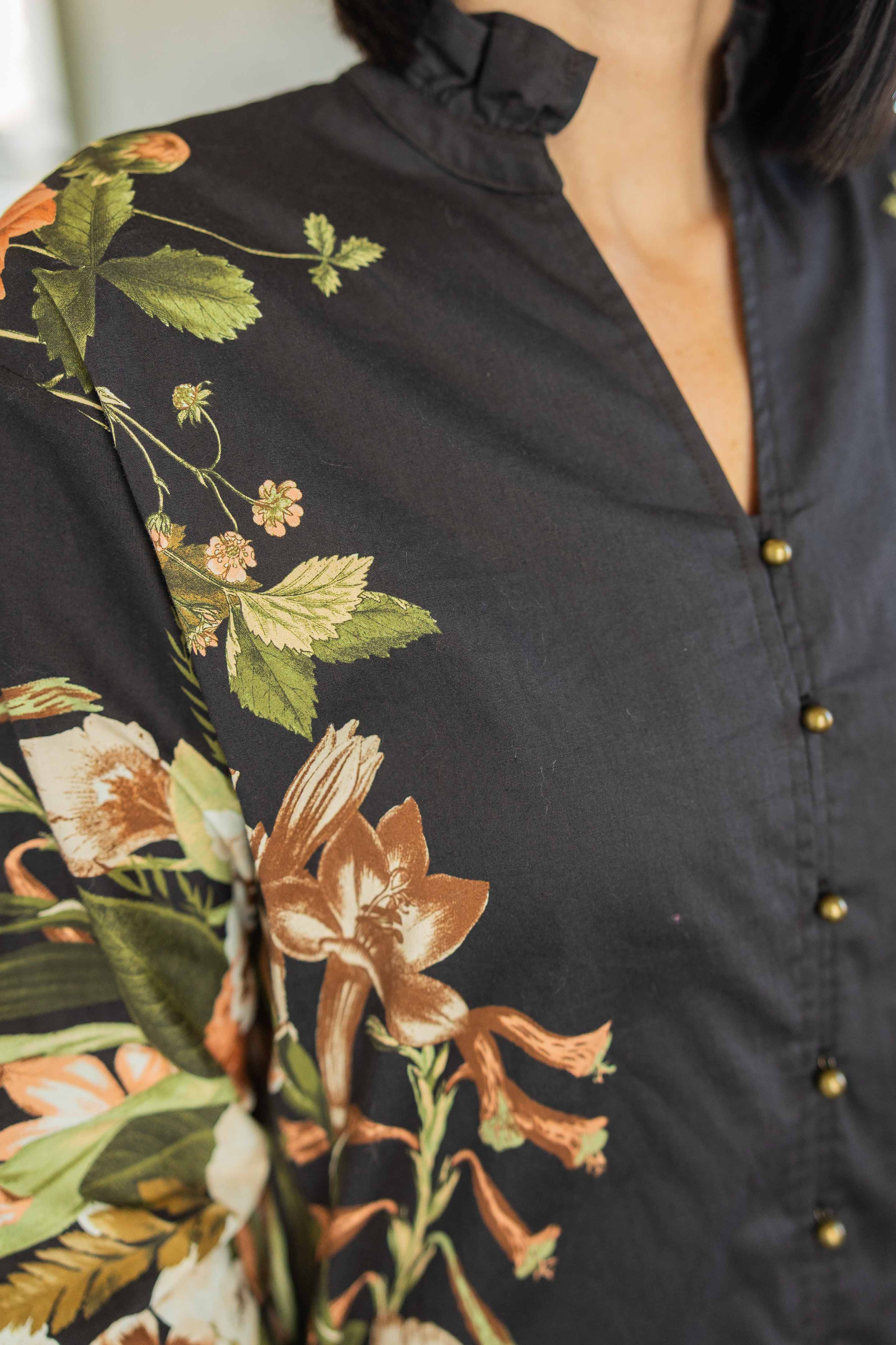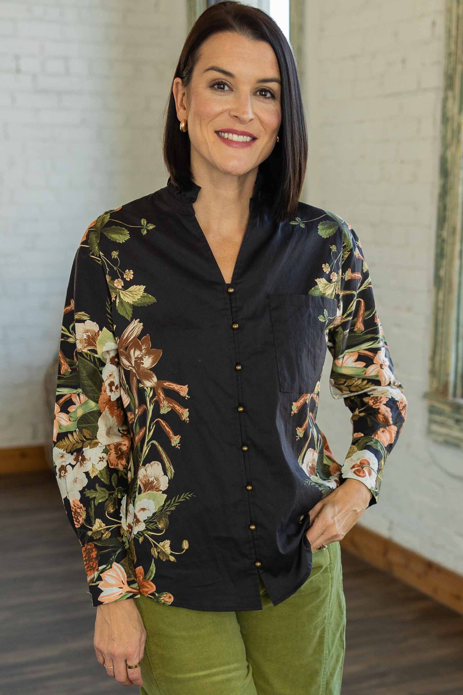 The Cassidy Floral Print Top brings easy elegance with a moody fall twist. The deep black base is covered in soft floral tones of copper, cream, and sage, making it feel both warm and sophisticated. The ruffle trim neckline and brass button details give it just the right touch of polish while keeping it relaxed and wearable.