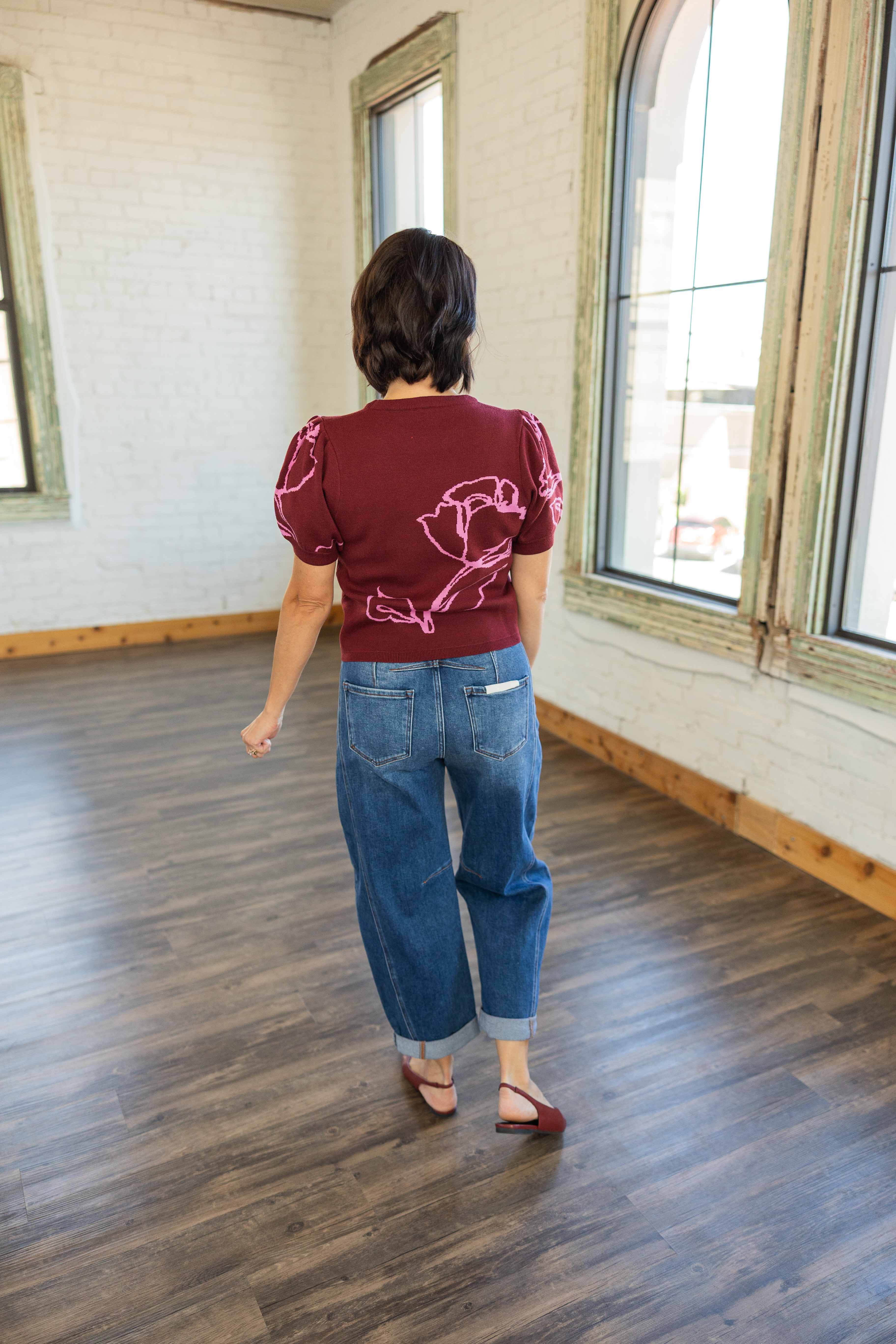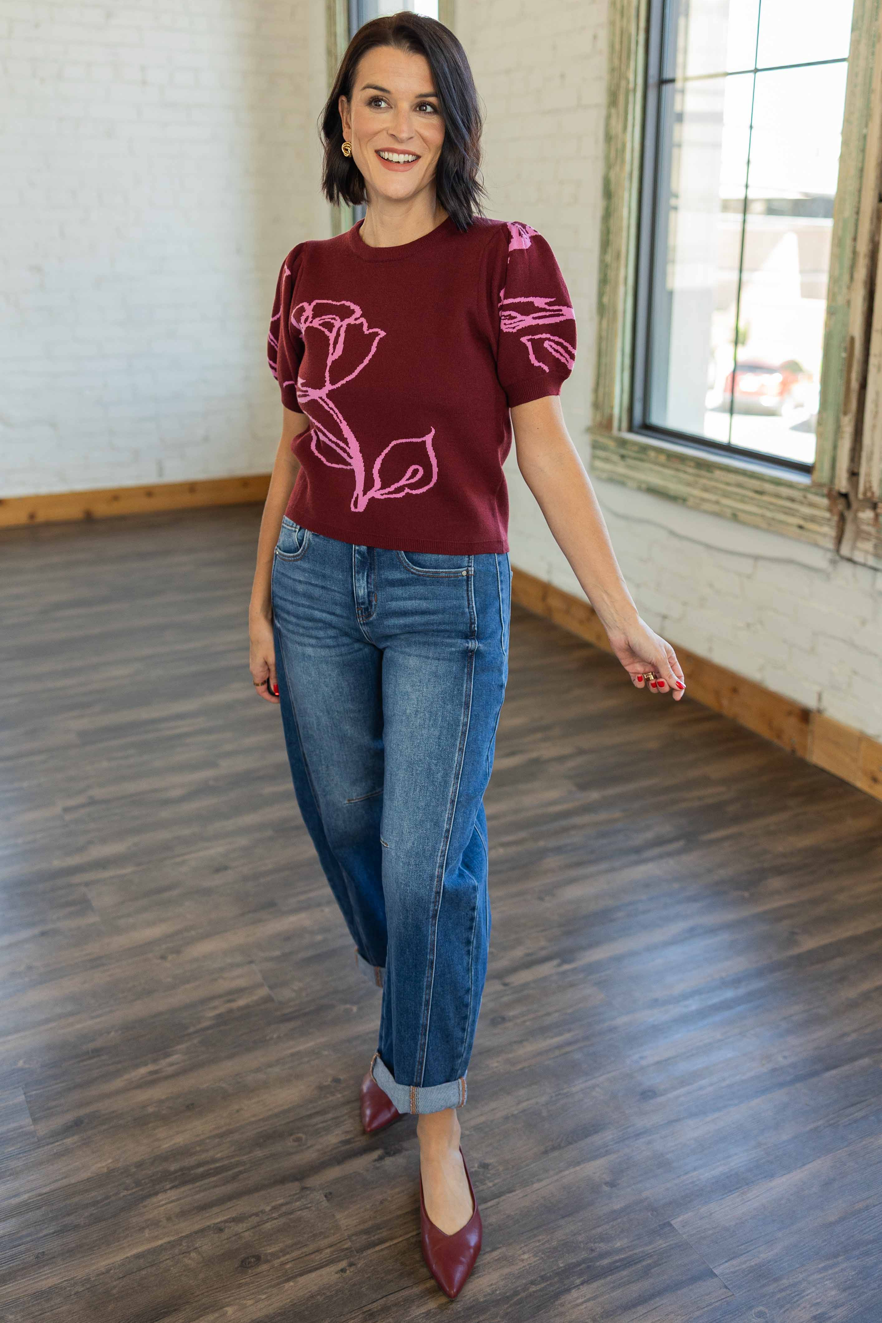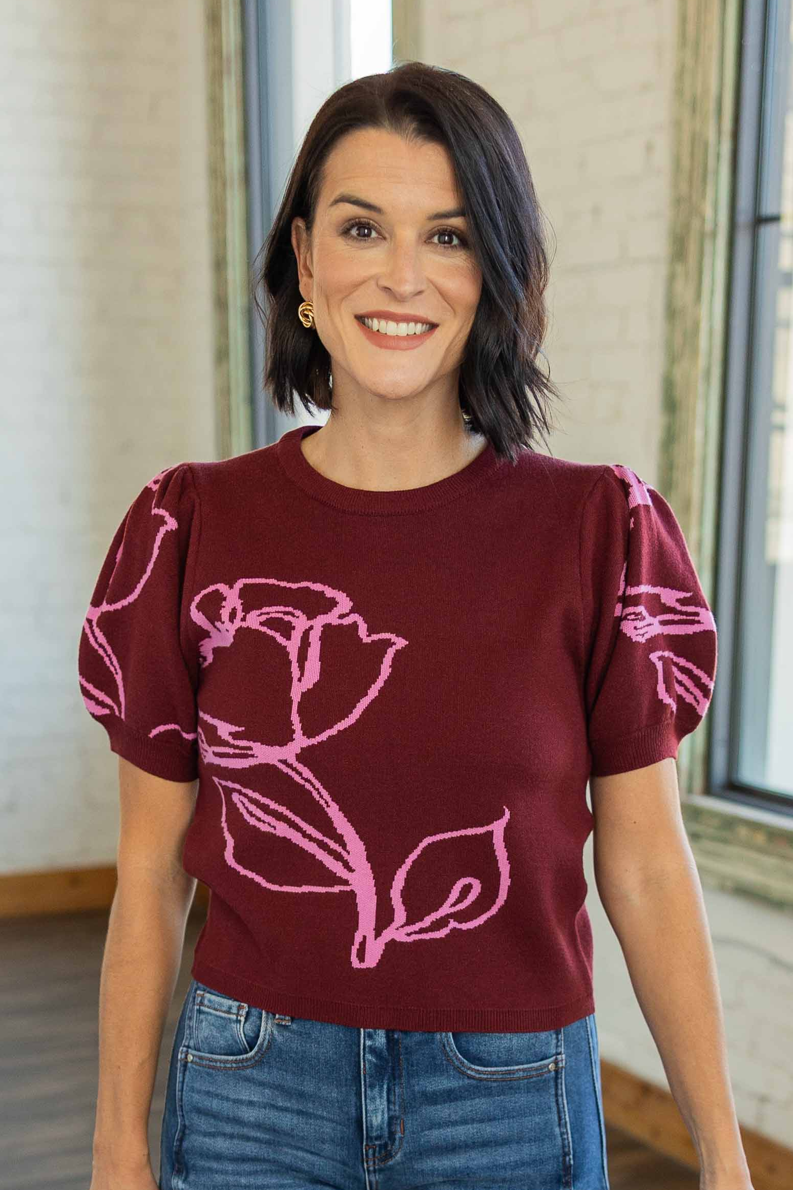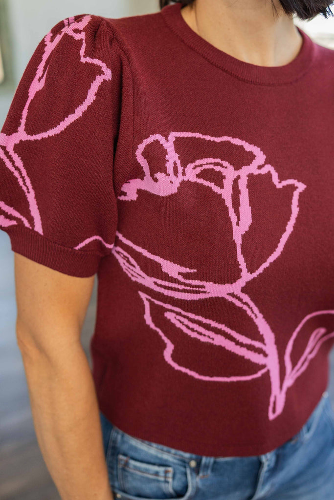The Sadie Top mixes cozy texture with a pop of personality. This soft sweater knit pullover features a bold floral motif in shades of deep wine and pink, paired with short puff sleeves and a flattering waist-length crop. It’s lightweight, comfy, and perfect for dressing up denim or layering under a jacket.