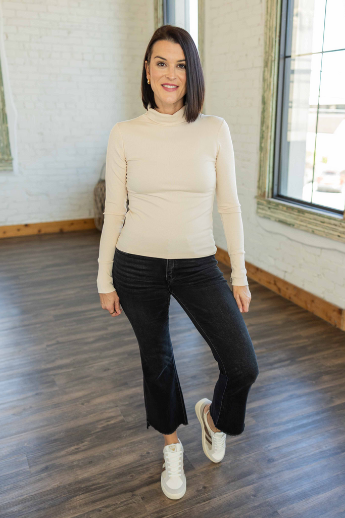 The Sierra Top is your secret weapon for layering season. Made from a soft ribbed knit, this easy turtleneck adds polish without bulk. The neutral cream color pairs with everything, making it the piece you’ll reach for again and again.