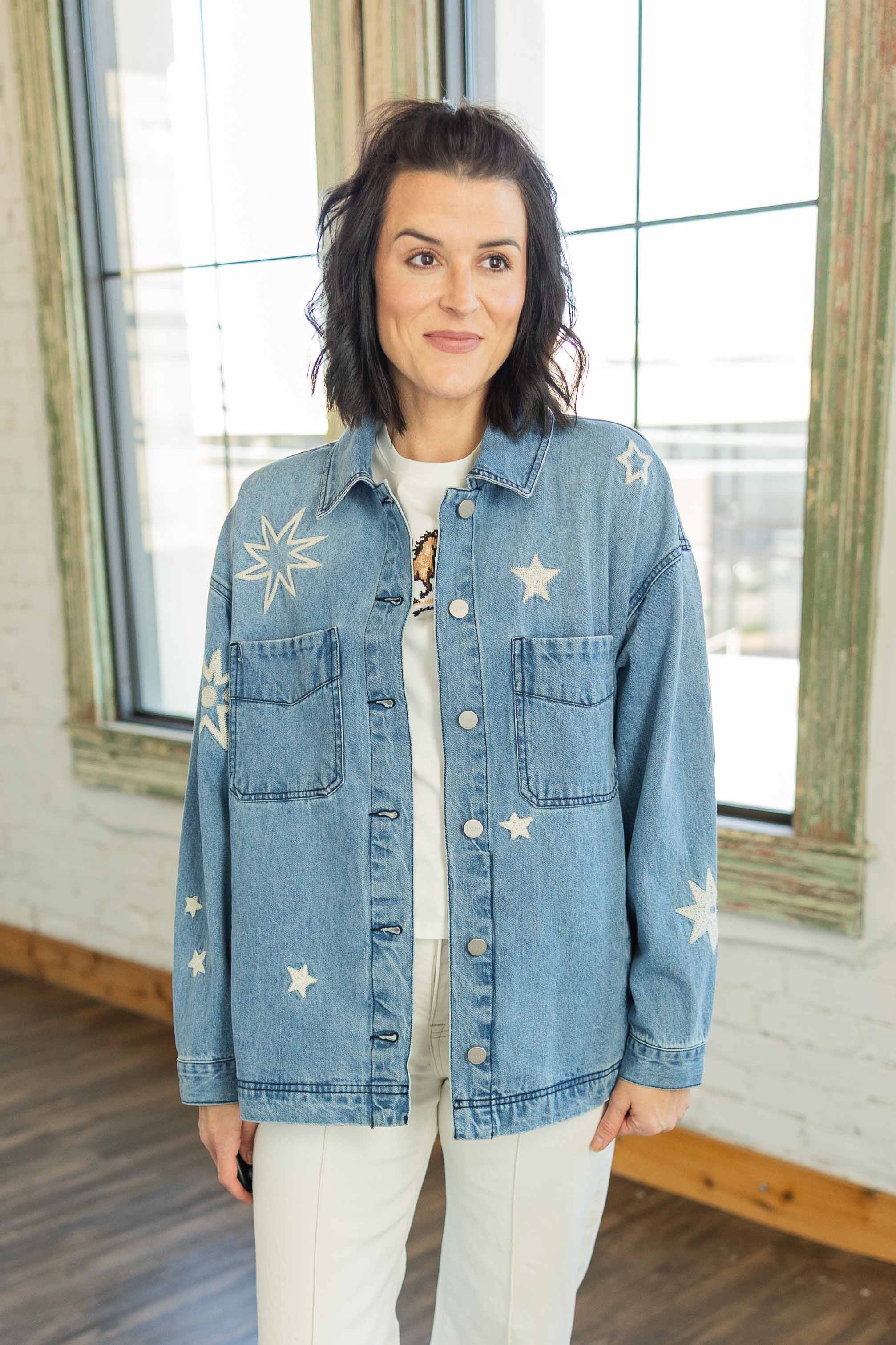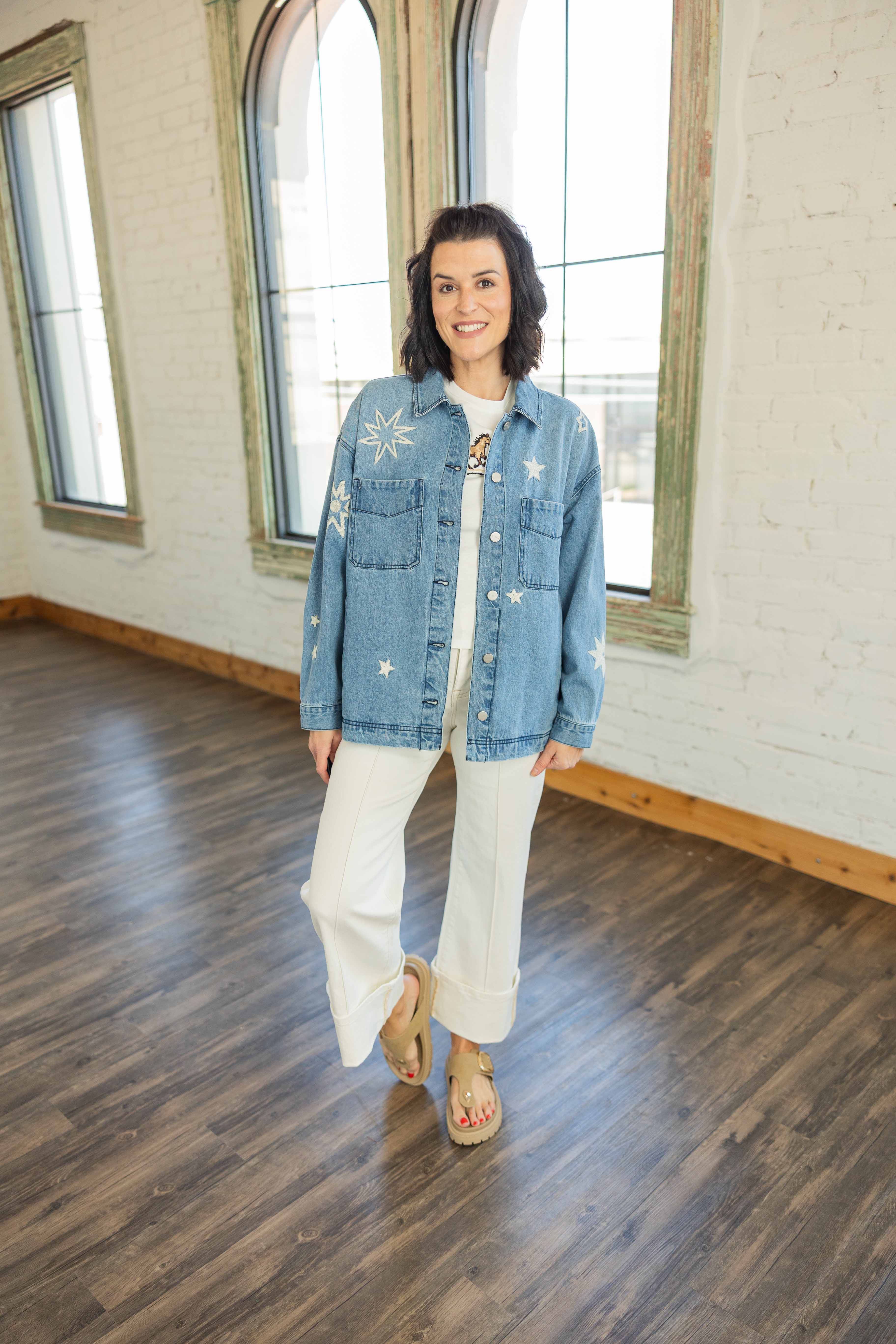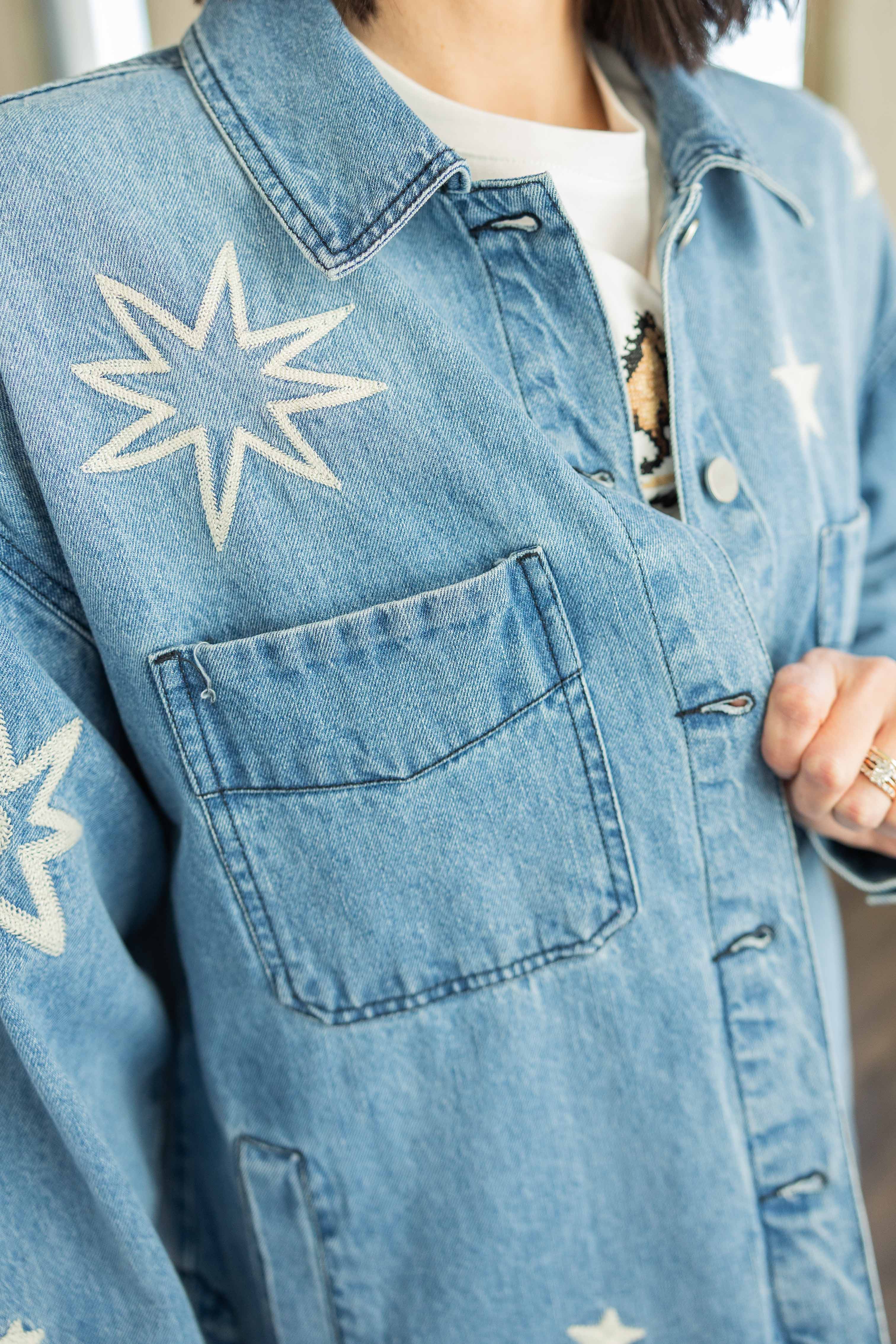 This light wash denim jacket is your Yeehaw Edit statement piece. The oversized fit gives you that relaxed, throw it on and go feel. Cream embroidered stars are scattered throughout for the perfect western touch. It features functional buttons down the front, chest pockets, and side pockets. The lightweight cotton makes it easy to layer now and wear straight into spring.