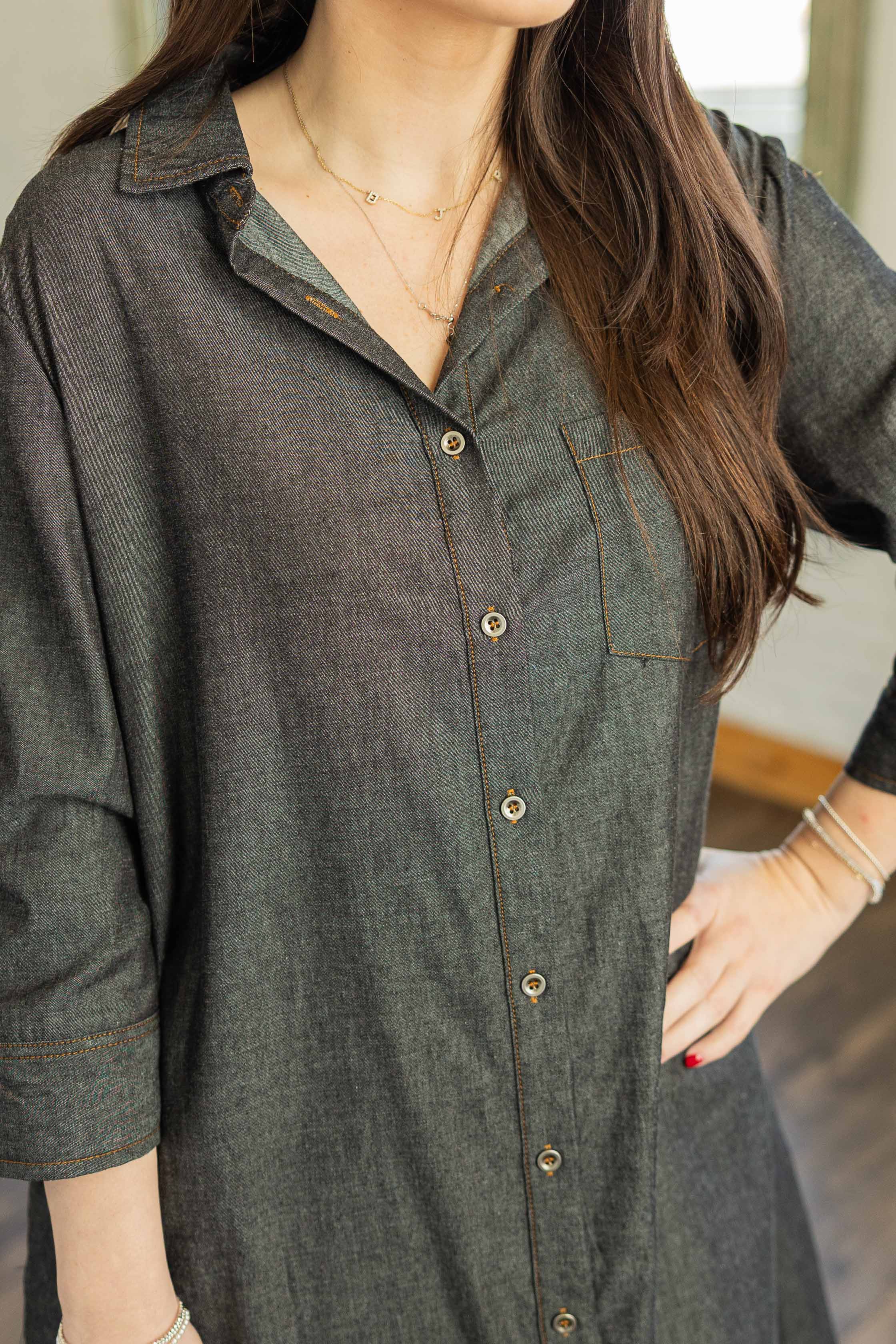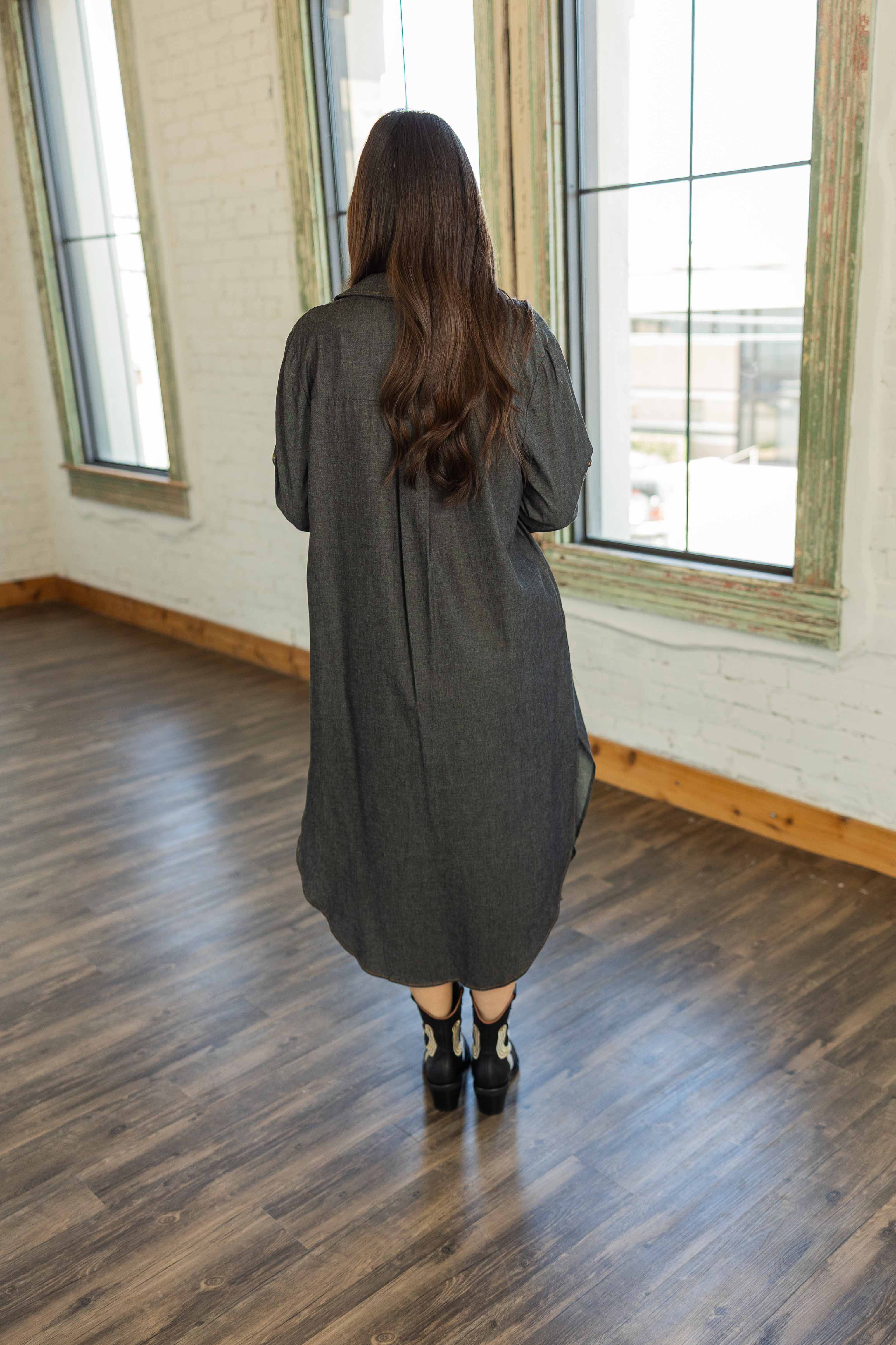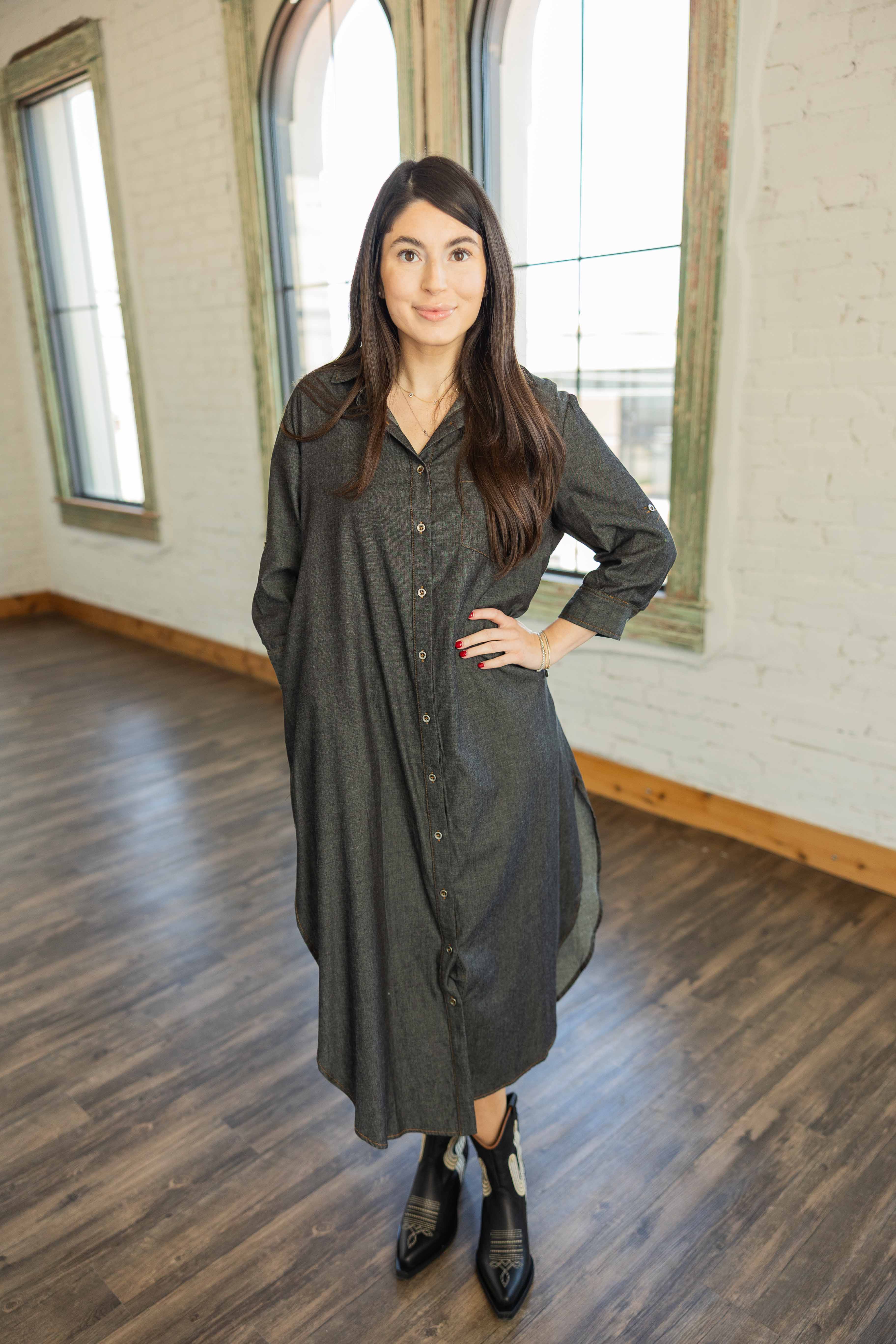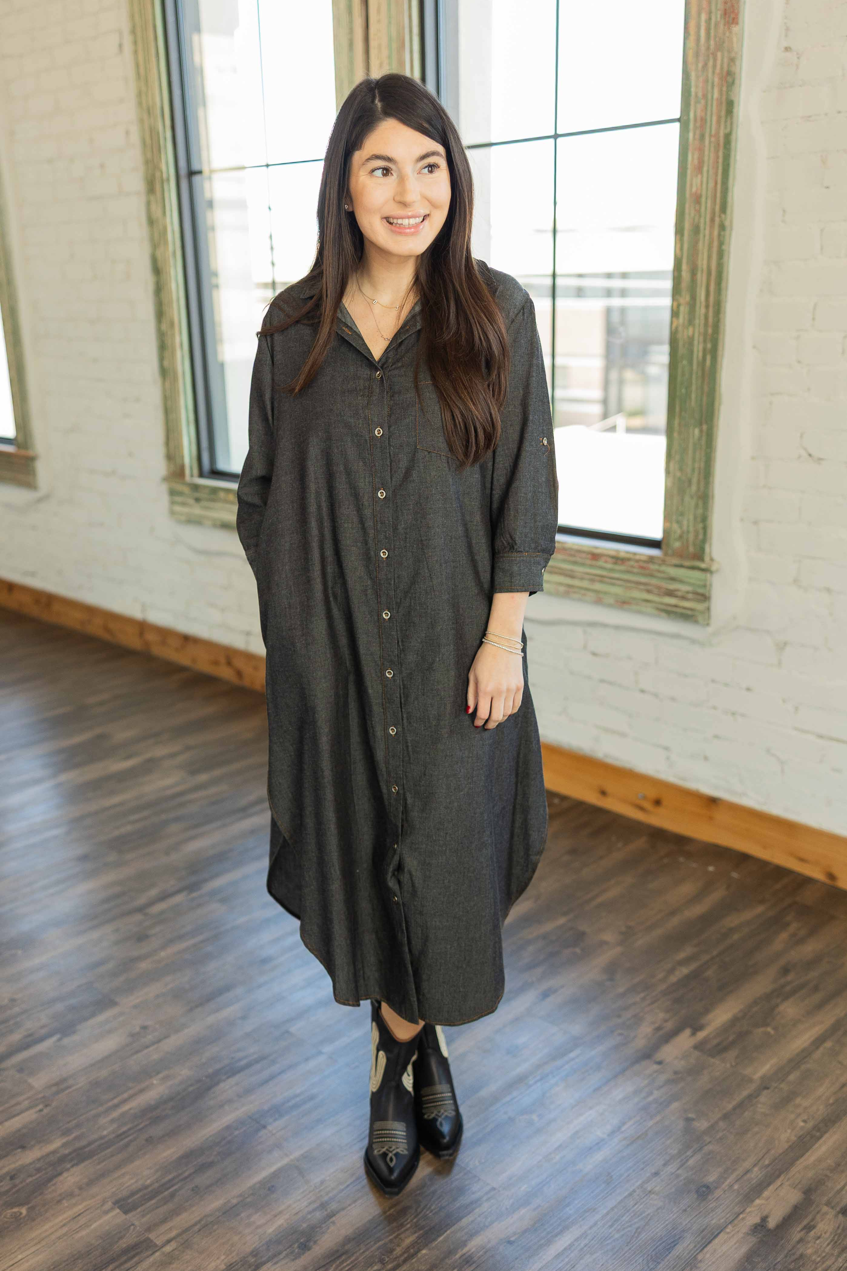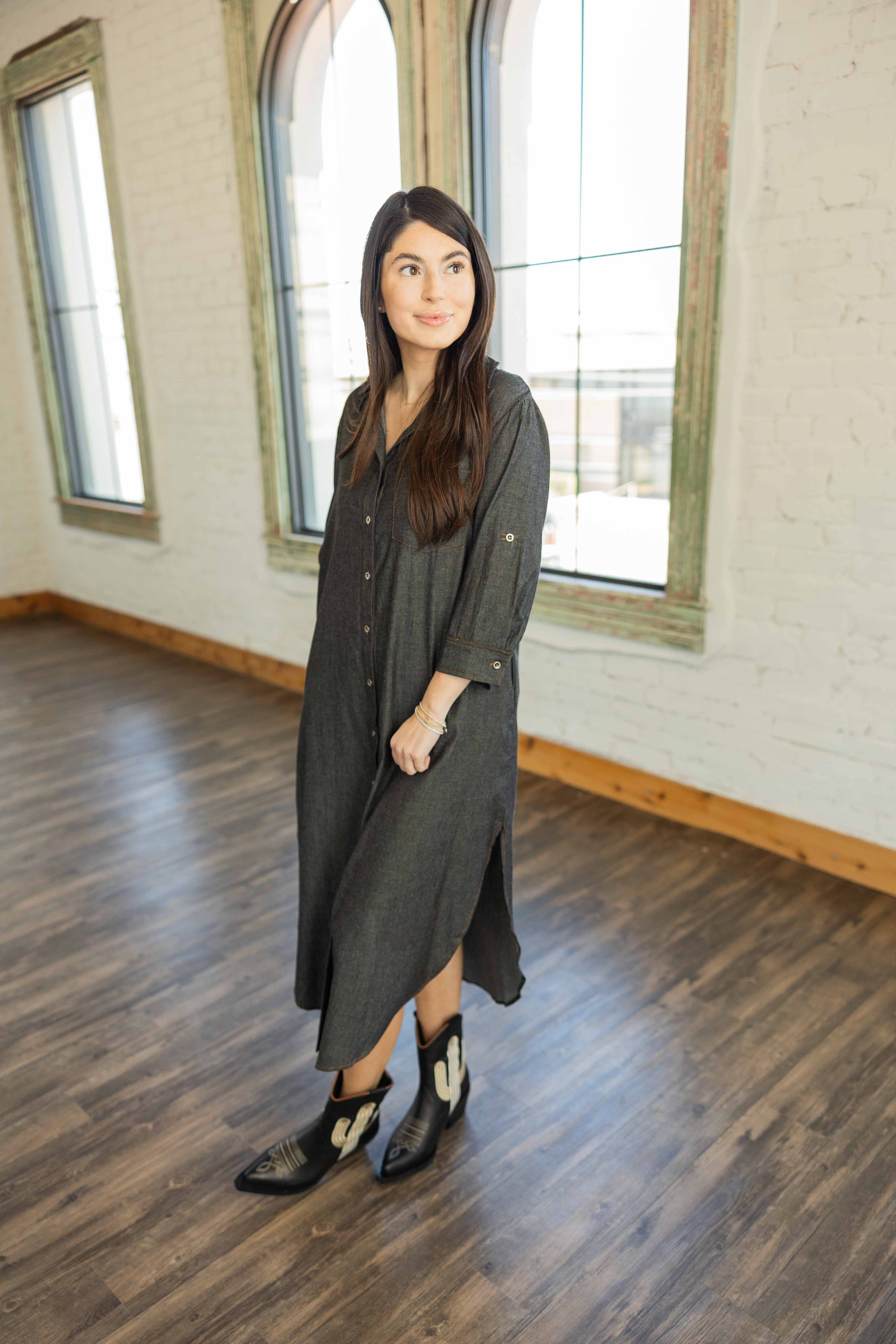 This charcoal washed denim midi dress is the definition of easy western style. The roomy fit gives you that relaxed drape without looking oversized. The soft charcoal gray denim keeps it neutral and versatile. It features a classic shirt collar, functional button front, single chest pocket, and side pockets because we do not do dresses without them. The 3/4 sleeves have a button detail so you can roll them if you want. The rounded hem with side slits gives it movement and makes it perfect with boots.