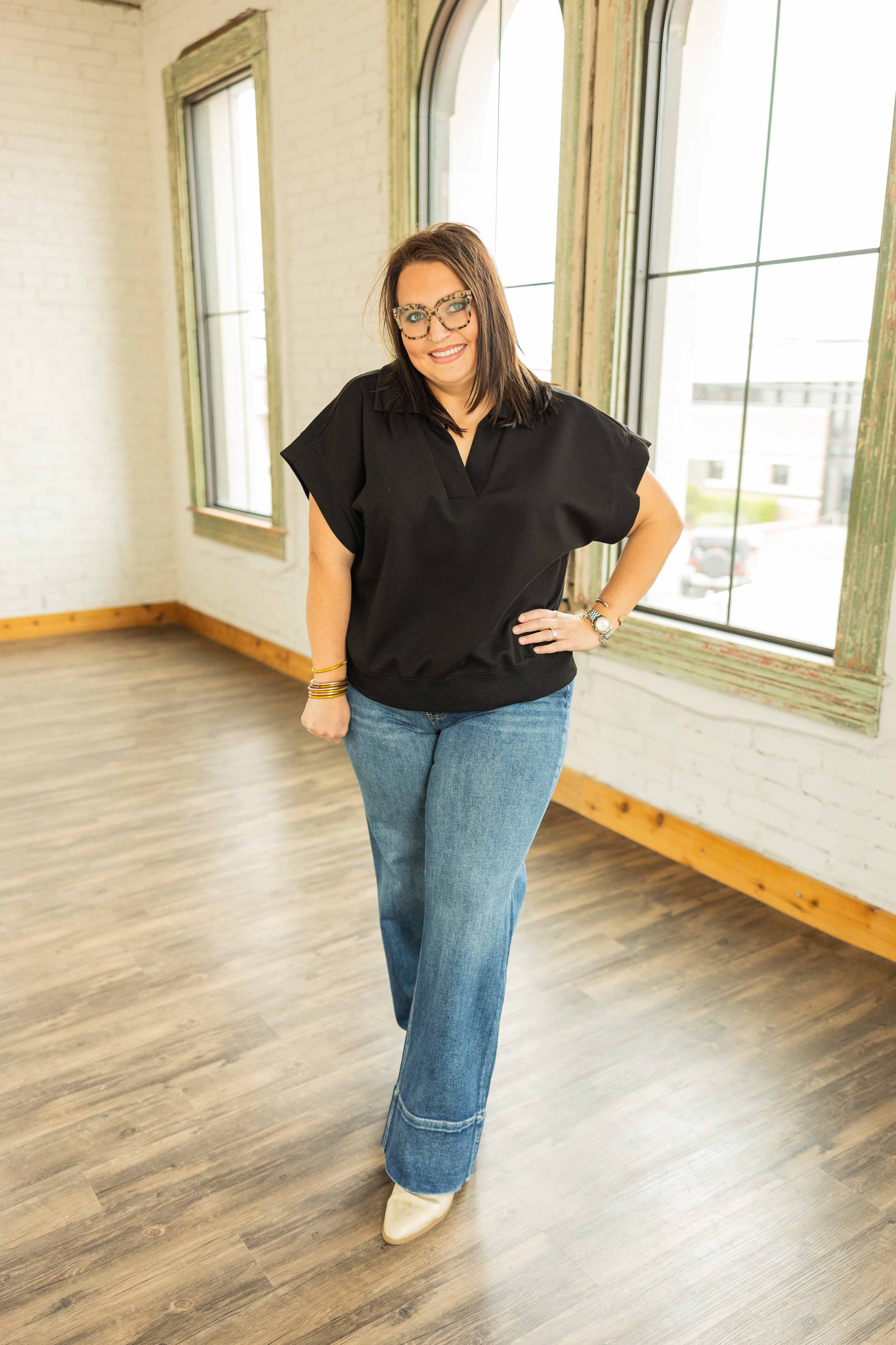 These are high rise with a flattering A line wide leg that flows from the hip down. The seam detail down the front adds structure and length. The comfort stretch denim moves with you, not against you. You get polish without sacrificing comfort.
