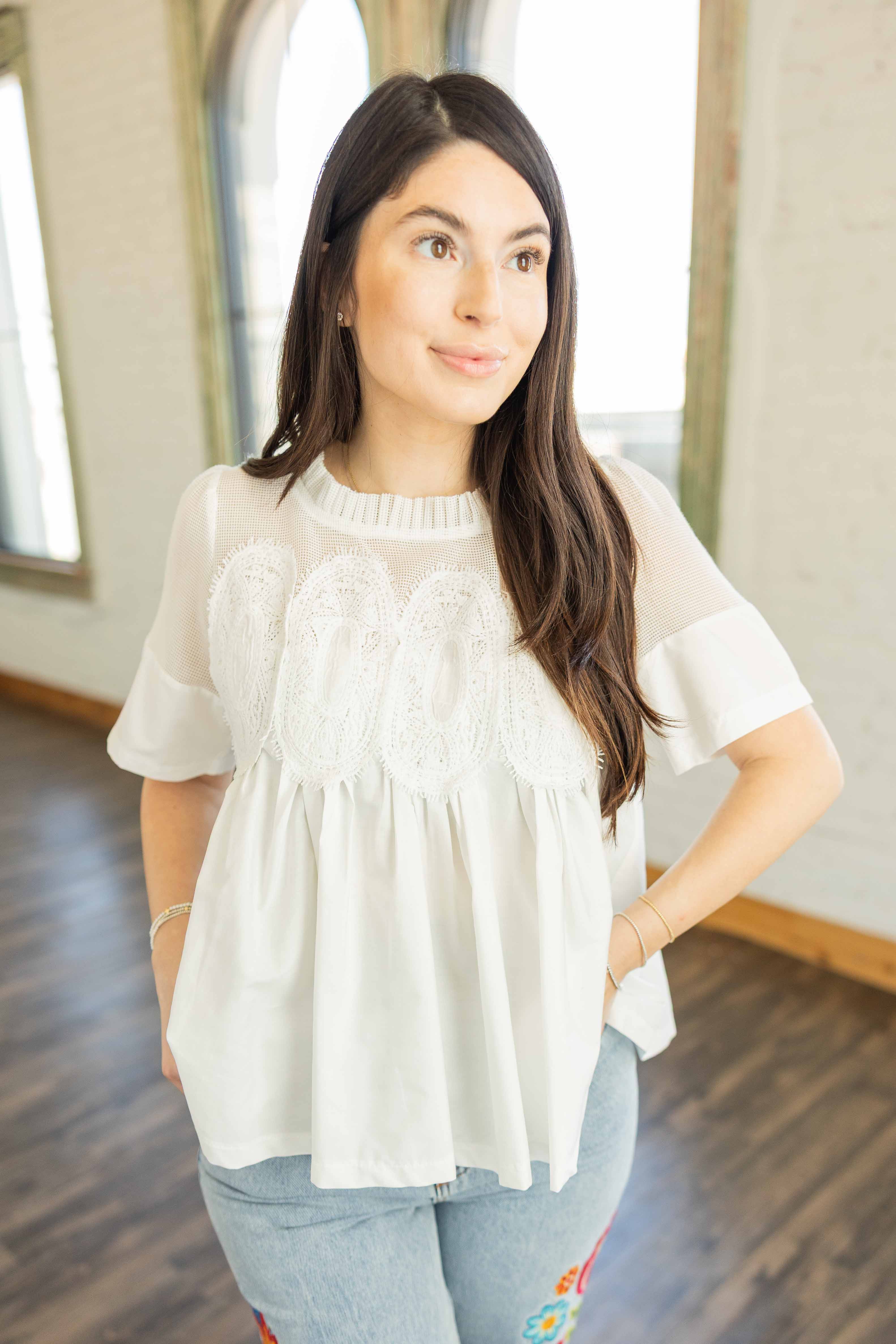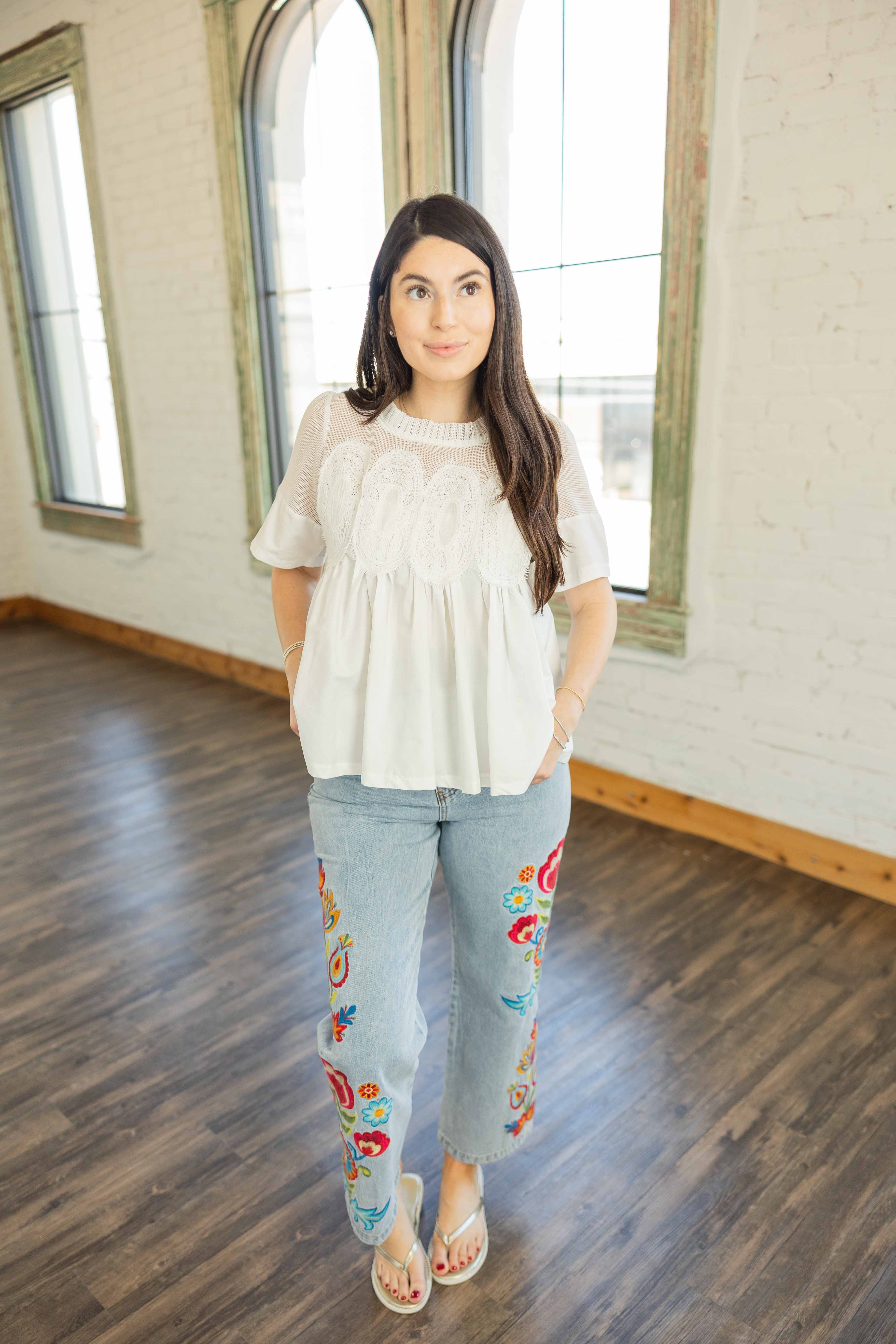 This soft ivory top feels feminine with a little western romance. The relaxed fit keeps it easy and comfortable. The upper bodice features sheer mesh with detailed ivory applique for texture and dimension. The cotton bottom flows into a breezy peplum-esque style silhouette that gives you movement without clinging. Short sleeves keep it wearable now and into warmer days.